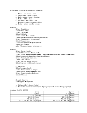 Które słowo nie pasuje do pozostałych i dlaczego? a. b. c. d. e. f. g. Woda – ser – masło – dŜem Zupa – wino – woda – chleb Lody – ciasto – kawa – ziemniaki Bułka – chleb – dŜem Ser Ŝółty – stół – sałata – sok Kapusta – ogórek – pomidor – jajko Kotlet – mięso – szynka – owoce Dialog 1 Kelner: Dzień dobry. Klient: Dzień dobry. Kelner: Oto karta. Klient: Dziękuję. Kelner: Co dla Pana / Pani? Klient: Proszę kawę z mlekiem i wodę mineralną. Kelner: Gazowaną czy niegazowaną? Klient: Niegazowaną. Kelter: Proszę bardzo. Czy coś jeszcze? Klient: Nie, dziękuję. Albo: Tak, proszę jeszcze tort owocowy. Dialog 2 Kelner: Dobry wieczór. Klient: Dobry wieczór. Proszę kartę. Kelner: Proszę. Słucham Pana / Panią. Czego Pan sobie Ŝyczy? Co podać? Co dla Pana? Klient: Proszę rosół, kurczaka z ziemniakami i kawę. Kelner: Niestety, nie ma rosołu. Klient: A jest barszcz? Kelner: Tak, jest bardzo smaczny. Klient: Poproszę w takim razie barszcz. 45 min później Klient: Proszę rachunek. Kelner: Proszę bardzo. 35 złotych. Klient: Proszę. Reszta dla Pana / Pani. Kelner: Dziękuję bardzo. Dobranoc. Klient: Dobranoc. Zadanie domowe: Tematy prac do wyboru: 1. Jaki powinien być dobry kelner? 2. Co myślisz o czeskich restauracjach. Opisz jedną z nich (menu, obsługa, wystrój). Odmiana ZŁOTY, GROSZ 1 2,3,4 5 – 21 22, 23, 24 X2, X3, X4 X1, X5, X6, X7, X8, X9 złoty złote złotych złote złote złotych 1 2, 3, 4 5 - 21 22, 23, 24 X2, X3, X4 X1, X5, X6, X7, X8, X9 grosz grosze groszy grosze grosze groszy