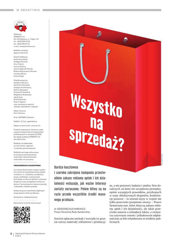 WW oobbiek iekt tyywie wie Wydawca: KAMSOFT S.A. 40–235 Katowice, ul 1 Maja 133 tel. +48 32 209-07-05 fax +48 32 209-07-15 e-mail: [email protected] Redaktor naczelny: Zygmunt Kamiński Współpracownicy: Arkadiusz Błoniarz, Ada Kostrz-Kostecka, Grzegorz Kucharewicz, Kathrin Morawetz, Krzysztof Przewoźnik, Magdalena Rutkowska, Jakub Szulc, Witold Zatoński, Peteris Zilgalvis oraz rozmówcy w raporcie „Wielkie niewiadome i nadzieje”. Skład i łamanie: Piotr Chamera Druk: INFOMAX, Katowice Nakład: 13,5 tys. egzemplarzy Zdjęcia w spisie treści: www.sxc.hu Przedruk, kopiowanie, skracanie, wykorzystanie tekstów (lub ich fragmentów) publikowanych w czasopiśmie OSOZ bez zgody wydawcy KAMSOFT S.A. jest zabronione. Redakcja nie odpowiada za treść reklam, ogłoszeń i artykułów sponsorowanych. Redakcja zastrzega sobie prawo do skracania zamieszczanych materiałów. Niezamówionych materiałów nie zwracamy. Prenumerata czasopisma Co miesiąc dostarczamy naszym czytelnikom starannie wyselekcjonowaną wiedzę naukową m.in. z dziedziny zarządzania, prawa, profilaktyki, nowoczesnych technologii w ochronie zdrowia i e-zdrowia. Znajdziesz tutaj szczegółowe analizy medyczne i farmaceutyczne, bezcenne porady i wskazówki, ciekawe wywiady. Dołącz do grona czytelników Ogólnopolskiego Systemu Ochrony Zdrowia. Zamówienia: [email protected] Zapraszamy na portal www.osoz.pl Wszystk o na sprzeda ż? Bardzo kosztowna i szeroko zakrojona kampania przeciwników zakazu reklamy aptek i ich działalności wskazuje, jak ważne interesy zostały naruszone. Polem bitwy są na razie przede wszystkim środki masowego przekazu. dr Grzegorz Kucharewicz Prezes Naczelnej Rady Aptekarskiej Sowicie opłacone artykuły i wywiady (w gruncie rzeczy materiały reklamowe i promocyj- Ogólnopolski System Ochrony Zdrowia 6/2013 Foto: www.sxc.hu Zespół redakcyjny: Aneta Krzynówek, Grzegorz Łenczyk, Artur Olesch, Joanna Pawlica, Joanna Stępniak-Pilśniak, Bożena Wojnarowicz-Głuszek, Jarosław Woroń, Łukasz Stopa. ne, a nie prasowe), badania i analizy firm doradczych, na które nie szczędzono pieniędzy, opinie wynajętych prawników, przybranych w szaty obiektywnych ekspertów, konferencje prasowe – to arsenał użyty w wojnie nie tylko przeciwko przepisom ustawy – Prawo farmaceutyczne, które dotyczą zakazu reklamy aptek i ich działalności, ale także przeciwko ustawie o refundacji leków, a zwłaszcza sztywnym cenom i jednakowym odpłatnościom za leki refundowane ze środków publicznych. W o b iek t y wie Co tak rozsierdziło przeciwników zakazu reklamy aptek i ich działalności? Nie ulega wątpliwości, że poczuli się zagrożeni wyrokami Wojewódzkiego Sądu Administracyjnego w Warszawie, wydanymi 24 i 25 stycznia 2013 r. Sąd oddalił skargi DOZ SA na decyzje Głównego Inspektora Farmaceutycznego w przedmiocie nakazu zaprzestania prowadzenia niezgodnej z przepisami reklamy aptek. W tej sytuacji, oczekując orzeczenia Naczelnego Sądu Administracyjnego, władze spółki postanowiły od 7 kwietnia zawiesić realizację swoich programów lojalnościowych w sieci aptek Dbam o Zdrowie. Równocześnie ruszyła kampania medialna. Odniosłem się do niej między innymi 23 kwietnia na konferencji „LEGISLACJA 2013. Aktualne problemy prawne w ochronie Zdrowia” w Centrum Prasowym PAP w Warszawie. Uczestnikom konferencji przedstawiłem między innymi kuriozalną argumentację jednego ze znanych przedsiębiorców działających na rynku farmaceutycznym, który skrytykował brak możliwości obniżenia ceny leku refundowanego, gdy na przykład opakowanie jest uszkodzone (sic!). Znany przedsiębiorca ubolewał również, że nie można zorganizować posezonowej wyprzedaży leków (może ktoś powinien wreszcie wyjaśnić biznesmenowi, że leki to nie sandały czy stroje kąpielowe). Takie poglądy to bez wątpienia jeszcze jeden argument przemawiający za tym, że trzeba jak najszybciej przywrócić zasadę „apteka dla aptekarza bądź spółki aptekarzy”. W jednostronne, nieobiektywne prezentacje argumentów przeciwników zakazu reklamy zaangażowane zostały znane dzienniki i tygodniki. Jeden z tekstów promocyjnych w obronie działalności spółki DOZ uznanej przez Wojewódzki Sąd Administracyjny w Warszawie za niezgodną z prawem ukazał się w tygodniku „Polityka”. „Materiał informacyjny” (takim hasłem, a nie nadtytułem „promocja” lub „reklama”, opatrzono ów tekst, który graficznie upodabnia się do kolumn redakcyjnych tego opiniotwórczego czasopisma) „DO ZOBACZENIA W APTECE” („Polityka”, nr 16, 17–23 kwietnia 2013 r.) zaczyna się od zdania: „Celem aktywności sieci aptek Dbam o Zdrowie jest zapewnienie pacjentom opieki farmaceutycznej na najwyższym poziomie”. Otóż zgodnie z art. 2a ust. 1 pkt 7 ustawy o izbach aptekarskich, „wykonywanie zawodu farmaceuty ma na celu ochronę zdrowia publicznego i obejmuje udzielanie usług farmaceutycznych polegających” między innymi na „sprawo- samorząd aptekarski zdecydowanie sprzeciwia się redukowaniu opieki farmaceutycznej do określonych działań marketingowych. Pod pojęciem opieki farmaceutycznej kryją się przecież konkretne potrzeby pacjentów...” waniu opieki farmaceutycznej polegającej na dokumentowanym procesie, w którym farmaceuta, współpracując z pacjentem i lekarzem, a w razie potrzeby z przedstawicielami innych zawodów medycznych, czuwa nad prawidłowym przebiegiem farmakoterapii w celu uzyskania określonych jej efektów poprawiających jakość życia pacjenta”. Zdaniem przedstawicieli najważniejszych środowisk zrzeszających polskich farmaceutów, „działania podjęte przez spółkę DOZ, wykorzystujące opiekę farmaceutyczną do działań marketingowych mających na celu zwiększenie woluminu sprzedaży leków oferowanych przez wybrane apteki współpracujące bądź współzależne od spółki DOZ nie mają nic wspólnego z podstawowymi zadaniami opieki farmaceut