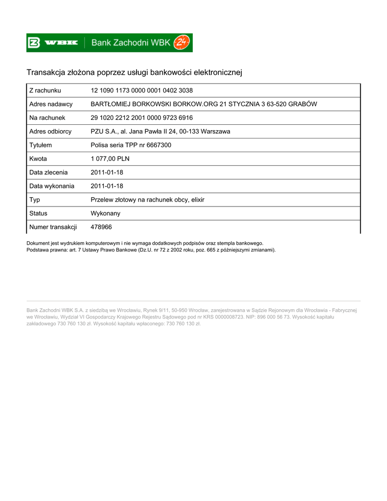Transakcja złożona poprzez usługi bankowości elektronicznej Z rachunku 12 1090 1173 0000 0001 0402 3038 Adres nadawcy BARTŁOMIEJ BORKOWSKI BORKOW.ORG 21 STYCZNIA 3 63-520 GRABÓW Na rachunek 29 1020 2212 2001 0000 9723 6916 Adres odbiorcy PZU S.A., al. Jana Pawła II 24, 00-133 Warszawa Tytułem Polisa seria TPP nr 6667300 Kwota 1 077,00 PLN Data zlecenia 2011-01-18 Data wykonania 2011-01-18 Typ Przelew złotowy na rachunek obcy, elixir Status Wykonany Numer transakcji 478966 Dokument jest wydrukiem komputerowym i nie wymaga dodatkowych podpisów oraz stempla bankowego. Podstawa prawna: art. 7 Ustawy Prawo Bankowe (Dz.U. nr 72 z 2002 roku, poz. 665 z późniejszymi zmianami). Bank Zachodni WBK S.A. z siedzibą we Wrocławiu, Rynek 9/11, 50-950 Wrocław, zarejestrowana w Sądzie Rejonowym dla Wrocławia - Fabrycznej we Wrocławiu, Wydział VI Gospodarczy Krajowego Rejestru Sądowego pod nr KRS 0000008723. NIP: 896 000 56 73. Wysokość kapitału zakładowego 730 760 130 zł. Wysokość kapitału wpłaconego: 730 760 130 zł.