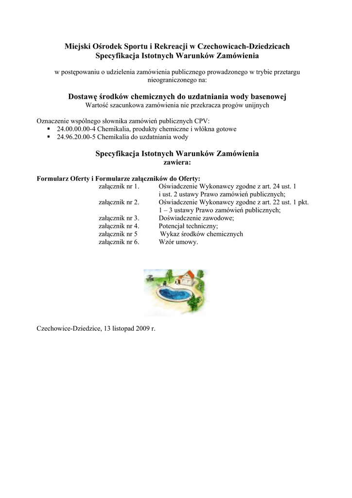Miejski Ośrodek Sportu i Rekreacji w Czechowicach-Dziedzicach Specyfikacja Istotnych Warunków Zamówienia w postępowaniu o udzielenia zamówienia publicznego prowadzonego w trybie przetargu nieograniczonego na: Dostawę środków chemicznych do uzdatniania wody basenowej Wartość szacunkowa zamówienia nie przekracza progów unijnych Oznaczenie wspólnego słownika zamówień publicznych CPV: 24.00.00.00-4 Chemikalia, produkty chemiczne i włókna gotowe 24.96.20.00-5 Chemikalia do uzdatniania wody Specyfikacja Istotnych Warunków Zamówienia zawiera: Formularz Oferty i Formularze załączników do Oferty: załącznik nr 1. Oświadczenie Wykonawcy zgodne z art. 24 ust. 1 i ust. 2 ustawy Prawo zamówień publicznych; załącznik nr 2. Oświadczenie Wykonawcy zgodne z art. 22 ust. 1 pkt. 1 – 3 ustawy Prawo zamówień publicznych; załącznik nr 3. Doświadczenie zawodowe; załącznik nr 4. Potencjał techniczny; załącznik nr 5 Wykaz środków chemicznych załącznik nr 6. Wzór umowy. Czechowice-Dziedzice, 13 listopad 2009 r. 1. ZAMAWIAJĄCY Zamawiającym jest Miejski Ośrodek Sportu i Rekreacji 43-502 Czechowice-Dziedzice ul. Legionów 145, REGON: 001363992 NIP: 652-15-88-720 Internet: http.www.mosir.czechowice-dziedzice.pl, e-mail: [email protected] Numer Tel/faxu: (0 32) 215 27 06 2. TRYB UDZIELENIA ZAMÓWIENIA 2.1. Wybrano tryb „przetargu nieograniczonego” na podstawie art. 10 ust. 1 w związku z art. 39 ustawy z dnia 29 stycznia 2004 roku Prawo zamówień publicznych (Dz. U. z 2008 r. Nr 91, poz. 742 z późn. zm.). 2.2. Ilekroć w niniejszej Specyfikacji dla Wykonawców użyte jest pojęcie „ustawa Pzp”, należy przez to rozumieć ustawę Prawo zamówień publicznych, o której mowa w pkt 3.1. 2.3. Zamawiający dopuszcza możliwość składania ofert częściowych: 1) Część pierwsza – dostawa środków chemicznych do uzdatniania wody dla Krytej pływalni „WODNIK” 2) Część druga - dostawa środków chemicznych do uzdatniania wody dla Kąpieliska otwartego 2.4. Zamawiający nie dopuszcza możliwości składania ofert wariantowych. 2.5. Zamawiający nie przewiduje zawarcia umowy ramowej. 2.6. Zamawiający nie przewiduje udzielenia zamówień uzupełniających. 2.7. Zamawiający nie przewiduje aukcji elektronicznej. 2.8. Zamawiający nie przewiduje zwrotu kosztów udziału w postępowaniu. 3. OPIS PRZEDMIOTU ZAMÓWIENIA 3.1. Przedmiotem zamówienia jest „Dostawa środków chemicznych do uzdatniania wody basenowej dla basenów: krytej pływalni i otwartego kąpieliska ”. 3.2. Szczegółowy opis przedmiotu zamówienia zawiera „Wykaz środków chemicznych” stanowiący załącznik nr 5 do specyfikacji. 3.3. Wykonawca ponosi pełną odpowiedzialność za wykonanie przedmiotu zamówienia. 3.4. Zamawiający dopuszcza możliwość powierzenia przez Wykonawcę części prac opisanych w SIWZ podwykonawcom. W przypadku podwykonawstwa Wykonawca winien dołączyć do oferty informację na temat podwykonawcy oraz powierzonego mu zakresu prac. W stosunku do Zamawiającego podwykonawcy działają na rachunek i ryzyko Wykonawcy. 4. TERMIN WYKONANIA ZAMÓWIENIA Wymagany termin wykonania zamówienia ustala się na 12 miesięcy od dnia podpisania umowy. 5. OPIS WARUNKÓW UDZIAŁU W POSTĘPOWANIU ORAZ OPIS SPOSOBU DOKONYWANIA OCENY SPEŁANIANIA TYCH WARUNKÓW. W postępowaniu mogą wziąć udział Wykonawcy, którzy spełniają następujące warunki ogólne i szczegółowe: 5.1. Warunki ogólne: 5.1.1. o udzielenie zamówienia mogą ubiegać się Wykonawcy, którzy: a) posiadają uprawnienia do wykonywania określonej działalności lub czynności, jeżeli ustawy nakładają obowiązek posiadania takich uprawnień, b) posiadają niezbędną wiedzę i doświadczenie oraz dysponują potencjałem technicznym i osobami zdolnymi do wykonania zamówienia, c) znajdują się w sytuacji ekonomicznej i finansowej zapewniającej wykonanie zamówienia, d) nie podlegają wykluczeniu z postępowania o udzielenie zamówienia na podstawie art. 24 ust. 1, 2 ustawy. 5.1.2. Warunki szczegółowe: str. 2 a) Wykonawca musi wykazać, że w ciągu ostatnich 3 lat kalendarzowych (licząc od dnia wszczęcia postępowania), a jeżeli okres prowadzenia działalności jest krótszy, w tym okresie, wykonał, co najmniej dwie dostawy zbliżone zakresem rzeczowym do przedmiotu zamówienia, tj. dostarczał środki chemiczne do uzdatniania wody basenowej na kwotę nie mniejszą niż 80.000 zł wraz z podatkiem VAT (wartość kontraktu). b) Wykonawca musi dostarczyć karty charakterystyki substancji niebezpiecznych wystawionych zgodnie z Rozporządzeniami Ministra Zdrowia: z dnia 3 lipca 2002 r. w sprawie karty charakterystyki substancji niebezpiecznej i preparatu niebezpiecznego (Dz. U. Nr 140, poz.1171 z póź. zm. ). c) Wykonawca musi posiadać polisę ubezpieczeniową na kwotę nie mniejszą niż 200.000 zł. d) Wykonawcy wspólnie ubiegający się o udzielenie niniejszego zamówienia muszą wykazać, że łącznie spełniają warunki określony w punkcie 5. Zamawiający oceni spełnienie warunków udziału w postępowaniu na podstawie dokumentów załączonych do oferty, o których mowa w pkt. 7 niniejszej specyfikacji, na zasadzie „spełnia” lub „nie spełnia” wymaganego warunku. Wykonawcy, którzy nie spełnią wymaganych warunków lub nie złożą oświadczeń i dokumentów potwierdzających ich spełnianie, zostaną wykluczeni z postępowania, a ich oferty zostaną uznane za odrzucone. 6. DOKUMENTY WYMAGANE OD WYKONAWCY W PRZEDMIOTOWYM POSTĘPOWANIU 6.1. Wraz z ofertą wypełnioną na Formularzu oferty należy załączyć: 6.1.1. Oświadczenie Wykonawcy, że Wykonawca nie podlega wykluczeniu z postępowania na podstawie art. 24 ust. 1, 2 ustawy Pzp – załącznik nr 1 do oferty. 6.1.2. Oświadczenie Wykonawcy o spełnianiu warunków wskazanych w art. 22 ust. 1 ustawy Pzp - załącznik Nr 2 do oferty. 6.1.3. Wypełniony formularz ofertowy. Do formularza ofertowego musi być dołączony za