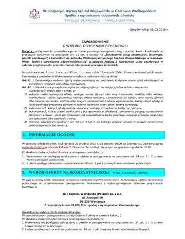 Gorzów Wlkp. 08.02.2016 r. ZAWIADOMIENIE O WYBORZE OFERTY NAJKORZYSTNIEJSZEJ Dotyczy: postępowania prowadzonego w trybie przetargu nieograniczonego poniżej kwot określonych w przepisach wydanych na podstawie art. 11 ust. 8 ustawy na „Świadczenie usług pocztowych, (listowych, paczek pocztowych) i kurierskich na potrzeby Wielospecjalistycznego Szpitala Wojewódzkiego w Gorzowie Wlkp., Spółki z ograniczoną odpowiedzialnością” w zakresie Pakietu 2 świadczenie usług pocztowych w zakresie przyjmowania, przemieszczania i doręczania przesyłek kurierskich Na podstawie art. 91 ust. 1 oraz art. 92 ust. 1 ustawy z dnia 29 stycznia 2004r. Prawo zamówień publicznych, Zamawiający zawiadamia Wykonawców o wyborze najkorzystniejszej oferty. Art. 91. 1. Zamawiający wybiera ofertę najkorzystniejszą na podstawie kryteriów oceny ofert określonych w specyfikacji istotnych warunków zamówienia. Art. 92. 1. Niezwłocznie po wyborze najkorzystniejszej oferty zamawiający jednocześnie zawiadamia wykonawców, którzy złożyli oferty, o: 1) wyborze najkorzystniejszej oferty, podając nazwę (firmę) albo imię i nazwisko, siedzibę albo miejsce zamieszkania i adres wykonawcy, którego ofertę wybrano, uzasadnienie jej wyboru oraz nazwy (firmy) albo imiona i nazwiska, siedziby albo miejsca zamieszkania i adresy wykonawców, którzy złożyli oferty, a także punktację przyznaną ofertom w każdym kryterium oceny ofert i łączną punktację; 2) wykonawcach, których oferty zostały odrzucone, podając uzasadnienie faktyczne i prawne; 3) wykonawcach, którzy zostali wykluczeni z postępowania o udzielenie zamówienia, podając uzasadnienie faktyczne i prawne - jeżeli postępowanie jest prowadzone w trybie przetargu nieograniczonego, negocjacji bez ogłoszenia albo zapytania o cenę; 4) terminie, określonym zgodnie z art. 94 ust. 1 lub 2, po którego upływie umowa w sprawie zamówienia publicznego może być zawarta. 1. INFORMACJE OGÓLNE W terminie składania ofert, czyli do dnia 22 grudnia 2015 r. do godziny 10:00 do Sekretariatu Zamawiającego wpłynęły 2 oferty w zakresie Pakietu 2. Otwarcie ofert odbyło się w tym samym dniu o godzinie 10:30. Po zbadaniu złożonych ofert Komisja przetargowa stwierdziła, że: 1. Wykonawcy nie podlegają wykluczeniu z udziału w postępowaniu na podstawie art. 24 ust. 1 i 2 ustawy Prawo zamówień publicznych. 2. 1 oferta podlega odrzuceniu na podstawie art. 89 ust. 1 pkt 2 ustawy Prawo zamówień publicznych. 2. WYBÓR OFERTY NAJKORZYSTNIEJSZEJ wraz z uzasadnieniem W wyniku oceny ofert, dokonanej w oparciu o przyjęte kryteria oceny ofert Zamawiający udziela zamówienia publicznego w przedmiotowym postępowaniu Wykonawcy z najkorzystniejszym bilansem przyznanych punktów, tj. TNT Express Worldwide (Poland) Sp. z o.o. ul. Annopol 19 03-236 Warszawa Z ceną oferty brutto 33.625,13 zł. zgodną z wymaganiami Zamawiającego. Uzasadnienie wyboru oferty najkorzystniejszej: W przedmiotowym postępowaniu zostały złożone 2 oferty w zakresie Pakietu 2. Po zbadaniu złożonych ofert Komisja przetargowa stwierdziła, że: 1. Wykonawcy nie podlegają wykluczeniu z udziału w postępowaniu na podstawie art. 24 ust. 1 i 2 ustawy Prawo zamówień publicznych. 2. 1 oferta podlega odrzuceniu na podstawie art. 89 ust. 1 pkt 2 ustawy Prawo zamówień publicznych. Wybrany Wykonawca spełnia warunki udziału w postępowaniu i złożył ofertę, którą to uznano za ofertę najkorzystniejszą tj. ofertę z najkorzystniejszym bilansem przyznanych punktów wg kryteriów oceny ofert przyjętych w przedmiotowym postępowaniu: Cena – waga 90% max. ilość punktów możliwa do uzyskania 90 x 3 osoby = 270,00 pkt. Funkcjonalność – waga 10% max. ilość punktów możliwa do uzyskania 10 x 3 osoby = 30,00 pkt. Wykonawca uzyskał łącznie 300,00 pkt. INFORMACJA DOTYCZĄCA WYKONAWCÓW, KTÓRZY ZŁOŻYLI OFERTY 3. wraz z informacją na temat punktacji przyznanej ofertom w każdym kryterium oceny ofert i łączną punktację Streszczenie oceny i porównanie złożonych ofert – PAKIET 2 Nr oferty Wykonawcy, którzy złożyli oferty 1 TNT Express Worldwide (Poland) Sp. z o.o. ul. Annopol 19 03-236 Warszawa 2 Poczta Polska S.A. Rejon Sprzedaży Gorzów Wlkp. ul. Jagiellończyka 4 66-400 Gorzów Wlkp. Punktacja uzyskana w kryterium A - cena oferty brutto: 90% B- funkcjonalność: 10% od wszystkich członków komisji przetargowej A. cena oferty brutto: waga -90% 90 pkt x 3 osoby = 270,00 pkt B. funkcjonalność: waga -10% 10,00 pkt x 3 osoby = 30,00 pkt RAZEM: 300,00 PKT 4. OFERTA ODRZUCONA art. 89 ust. 1 pkt 2 ustawy TERMIN I MIEJSCE PODPISANIA UMOWY Zamawiający informuje, że Zawiadomienie o wyborze oferty najkorzystniejszej zostanie przekazane (przesłane) wszystkim Wykonawcom, którzy złożyli oferty – faxem lub pocztą elektroniczną na numer i adres poczty elektronicznej podany w ofercie Wykonawcy (zgodnie z art. 27 ust. 2 ustawy i treścią SIWZ). Zgodnie z brzmieniem art. 94 ust. 1 pkt 2) ustawy Prawo zamówień publicznych Zamawiający zawiera umowę w sprawie zamówienia publicznego, z zastrzeżeniem art. 183, w terminie: nie krótszym niż 5 dni od dnia przesłania zawiadomienia o wyborze najkorzystniejszej oferty, jeżeli zawiadomienie to zostało przesłane w sposób określony w art. 27 ust. 2 (…) w przypadku zamówień, których wartość jest mniejsza niż kwoty określone w przepisach wydanych na podstawie art. 11 ust. 8. Proponowane miejsce i termin podpisania umowy: w siedzibie Zamawiającego przy ul. Jana Dekerta 1 w Gorzowie Wielkopolskim w dniu 16.02.2016 r. Dopuszczalne jest podpisanie umowy w drodze korespondencyjnej. ZAMAWIAJĄCY Podpis na oryginale ........................................................... (podpis osoby/osób uprawnionych do reprezentacji) W dniu 08.02.2016 r. niniejsze zawiadomienie zostało przekazane Wykonawcy, który złożył ofertę, faksem lub pocztą elektroniczną na nr i adres poczty elektronicznej wskazany w o