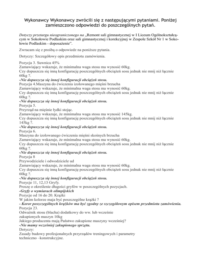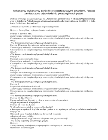 Wykonawcy Wykonawcy zwrócili się z następującymi pytaniami. Poniżej zamieszczono odpowiedzi do poszczególnych pytań. Dotyczy przetargu nieograniczonego na „Remont sali gimnastycznej w I Liceum Ogólnokształcącym w Sokołowie Podlaskim oraz sali gimnastycznej i korekcyjnej w Zespole Szkół Nr 1 w Sokołowie Podlaskim - doposażenie”. Zwracam się z prośbą o odpowiedz na poniższe pytania. Dotyczy: Szczegółowy opis przedmiotu zamówienia. Pozycja 3. Suwnica 45% Zamawiający wskazuje, że minimalna waga stosu ma wynosić 60kg. Czy dopuszcza się inną konfigurację poszczególnych obciążeń sosu jednak nie mnij niż łącznie 60kg ?. -Nie dopuszcza się innej konfiguracji obciążeń stosu. Pozycja 4.Maszyna do ćwiczenia izolowanego mięśni brzucha Zamawiający wskazuje, że minimalna waga stosu ma wynosić 60kg. Czy dopuszcza się inną konfigurację poszczególnych obciążeń sosu jednak nie mnij niż łącznie 60kg ?. -Nie dopuszcza się innej konfiguracji obciążeń stosu. Pozycja 5. Przyrząd na mięśnie łydki stojąc. Zamawiający wskazuje, że minimalna waga stosu ma wynosić 145kg. Czy dopuszcza się inną konfigurację poszczególnych obciążeń sosu jednak nie mnij niż łącznie 145kg ?. -Nie dopuszcza się innej konfiguracji obciążeń stosu. Pozycja 6. Maszyna do izolowanego ćwiczenia mięśni skośnych brzucha Zamawiający wskazuje, że minimalna waga stosu ma wynosić 60kg. Czy dopuszcza się inną konfigurację poszczególnych obciążeń sosu jednak nie mnij niż łącznie 60kg ?. -Nie dopuszcza się innej konfiguracji obciążeń stosu. Pozycja 8 Przywodziciele i odwodziciele ud Zamawiający wskazuje, że minimalna waga stosu ma wynosić 60kg. Czy dopuszcza się inną konfigurację poszczególnych obciążeń sosu jednak nie mnij niż łącznie 60kg ?. -Nie dopuszcza się innej konfiguracji obciążeń stosu. Pozycje 11, 12,13 Gryfy. Proszę o określenie długości gryfów w poszczególnych pozycjach. -Gryfy o wymiarach olimpijskich Pozycje od 16 do 20. Krążki W jakim kolorze maja być poszczególne krążki ? - Koror poszczególnych krążków ma być zgodny ze szczegółowym opisem przedmiotu zamówienia. Pozycja 23. Odważnik stosu (blacha) dodatkowy do ww. lub wcześnie zakupionych maszyn 10kg Jakiego producenta mają Państwo zakupione maszyny wcześniej? -Nie mamy wcześniej zakupionego sprzętu. Dotyczy: Zasady budowy profesjonalnych przyrządów treningowych i parametry techniczno –konstrukcyjne. Czy dopuszcza się przenoszenie ciężaru stosów za pomocą pasów które są znacznie trwalsze niż wymagane linki? -Nie dopuszcza się przenoszenia ciężarów stosów za pomocą pasów. Czy odważniki stosów mogą być o innej wadze niż wymagana ? -Odważniki nie mogą być o innej wadze niż wymagana. Czy otwory na prowadnice mogą być w innym rozstawie niż 160mm? co nie ma znaczenia dla użytkownika ? -Otwory na prowadnice nie mogą być w innym rozstawie niż w szczegółowym opisie przedmiotu zamówienia. Czy wymaga się przedłożenia w ofercie wymaganych Certyfikatów ? Dotyczy Sprzęt cardio Jaki jest wymagany okres gwarancji na ORBITREK ELEKTROMAGNETYCZNY ? - W starym opisie przedmiotu zamówienia jest błąd dotyczący sprzętu cardio zamawiający chce zakupić bieżnię zgodną z załączonym opisem w nowym poprawionym Opisie przedmiotu zamówienia.. Okres gwarancji 24 miesiące (gwarancja producenta)