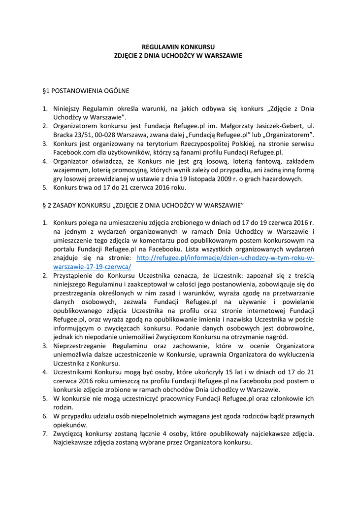 REGULAMIN KONKURSU ZDJĘCIE Z DNIA UCHODŹCY W WARSZAWIE §1 POSTANOWIENIA OGÓLNE 1. Niniejszy Regulamin określa warunki, na jakich odbywa się konkurs „Zdjęcie z Dnia Uchodźcy w Warszawie”. 2. Organizatorem konkursu jest Fundacja Refugee.pl im. Małgorzaty Jasiczek-Gebert, ul. Bracka 23/51, 00-028 Warszawa, zwana dalej „Fundacją Refugee.pl” lub „Organizatorem”. 3. Konkurs jest organizowany na terytorium Rzeczypospolitej Polskiej, na stronie serwisu Facebook.com dla użytkowników, którzy są fanami profilu Fundacji Refugee.pl. 4. Organizator oświadcza, że Konkurs nie jest grą losową, loterią fantową, zakładem wzajemnym, loterią promocyjną, których wynik zależy od przypadku, ani żadną inną formą gry losowej przewidzianej w ustawie z dnia 19 listopada 2009 r. o grach hazardowych. 5. Konkurs trwa od 17 do 21 czerwca 2016 roku. § 2 ZASADY KONKURSU „ZDJĘCIE Z DNIA UCHODŹCY W WARSZAWIE” 1. Konkurs polega na umieszczeniu zdjęcia zrobionego w dniach od 17 do 19 czerwca 2016 r. na jednym z wydarzeń organizowanych w ramach Dnia Uchodźcy w Warszawie i umieszczenie tego zdjęcia w komentarzu pod opublikowanym postem konkursowym na portalu Fundacji Refugee.pl na Facebooku. Lista wszystkich organizowanych wydarzeń znajduje się na stronie: http://refugee.pl/informacje/dzien-uchodzcy-w-tym-roku-wwarszawie-17-19-czerwca/ 2. Przystąpienie do Konkursu Uczestnika oznacza, że Uczestnik: zapoznał się z treścią niniejszego Regulaminu i zaakceptował w całości jego postanowienia, zobowiązuje się do przestrzegania określonych w nim zasad i warunków, wyraża zgodę na przetwarzanie danych osobowych, zezwala Fundacji Refugee.pl na używanie i powielanie opublikowanego zdjęcia Uczestnika na profilu oraz stronie internetowej Fundacji Refugee.pl, oraz wyraża zgodą na opublikowanie imienia i nazwiska Uczestnika w poście informującym o zwycięzcach konkursu. Podanie danych osobowych jest dobrowolne, jednak ich niepodanie uniemożliwi Zwycięzcom Konkursu na otrzymanie nagród. 3. Nieprzestrzeganie Regulaminu oraz zachowanie, które w ocenie Organizatora uniemożliwia dalsze uczestniczenie w Konkursie, uprawnia Organizatora do wykluczenia Uczestnika z Konkursu. 4. Uczestnikami Konkursu mogą być osoby, które ukończyły 15 lat i w dniach od 17 do 21 czerwca 2016 roku umieszczą na profilu Fundacji Refugee.pl na Facebooku pod postem o konkursie zdjęcie zrobione w ramach obchodów Dnia Uchodźcy w Warszawie. 5. W konkursie nie mogą uczestniczyć pracownicy Fundacji Refugee.pl oraz członkowie ich rodzin. 6. W przypadku udziału osób niepełnoletnich wymagana jest zgoda rodziców bądź prawnych opiekunów. 7. Zwycięzcą konkursy zostaną łącznie 4 osoby, które opublikowały najciekawsze zdjęcia. Najciekawsze zdjęcia zostaną wybrane przez Organizatora konkursu. 8. Wysyłając swoje zgłoszenie, Uczestnik oświadcza i potwierdza, że przesłane zdjęcie jest jego własnością i zostało wykonane przez niego samego oraz, że przysługują mu autorskie prawa majątkowe i osobiste do tego zdjęcia oraz jest uprawniony do rozporządzania nimi w zakresie i celu opisanym w niniejszym regulaminie. § 3 NAGRODY W KONKURSIE 1. Nagrodami w konkursie jest zestaw gadżetów Dnia Uchodźcy w Warszawie (dwie koszulki (damska i męska), zestaw dla dzieci, ochraniacz na sidełko rowerowe oraz odblask na rower). 2. Uczestnik Konkursu – Zwycięzca Konkursu nie może zamienić nagrody o której mowa Regulamin, na jej równowartość w gotówce ani na żadne inne świadczenie. 3. Nagrody zostaną przesłane pocztą do Zwycięzców Konkursu. § 4 POSTANOWIENIA KOŃCOWE 1. W kwestiach nieuregulowanych niniejszym Regulaminem stosuje się przepisy kodeksu cywilnego. 2. Właściciel portalu społecznościowego Facebook jest całkowicie zwolniony z odpowiedzialności za przebieg wyżej wymienionego Konkursu 3. Konkurs nie jest w żaden sposób sponsorowany, wspierany, administrowany oraz stowarzyszony z portalem społecznościowym Facebook. 4. Regulamin Konkursu znajduje się na stronie internetowej Organizatora: www.refugee.pl. 5. W kwestiach nieuregulowanych Regulaminem stosuje się przepisy Kodeksu Cywilnego. 6. Regulamin wchodzi w życie z dniem 16 czerwca 2016 roku.