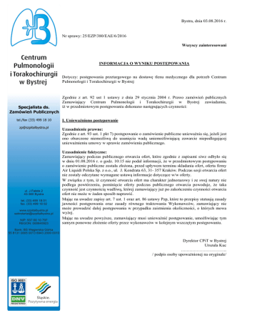Bystra, dnia 03.08.2016 r. Nr sprawy: 25/EZP/380/EAE/6/2016 Wszyscy zainteresowani INFORMACJA O WYNIKU POSTĘPOWANIA Dotyczy: postępowania przetargowego na dostawę tlenu medycznego dla potrzeb Centrum Pulmonologii i Torakochirurgii w Bystrej Specjalista ds. Zamówień Publicznych tel./fax (33) 499 18 10 [email protected] Zgodnie z art. 92 ust 1 ustawy z dnia 29 stycznia 2004 r. Prawo zamówień publicznych Zamawiający Centrum Pulmonologii i Torakochirurgii w Bystrej zawiadamia, iż w przedmiotowym postępowaniu dokonano następujących czynności: I. Unieważniono postępowanie Uzasadnienie prawne: Zgodnie z art. 93 ust. 1 pkt 7) postępowanie o zamówienie publiczne unieważnia się, jeżeli jest ono obarczone niemożliwą do usunięcia wadą uniemożliwiającą zawarcie niepodlegającej unieważnieniu umowy w sprawie zamówienia publicznego. Uzasadnienie faktyczne: Zamawiający podczas publicznego otwarcia ofert, które zgodnie z zapisami siwz odbyło się w dniu 01.08.2016 r. o godz. 10:15 nie podał informacji, że w przedmiotowym postępowaniu o zamówienie publiczne została złożona, przed upływem terminu składania ofert, oferta firmy Air Liquidi Polska Sp. z o.o., ul. J. Kondrata 63, 31- 357 Kraków. Podczas sesji otwarcia ofert nie zostały odczytane wymagane ustawą informacje dotyczące w/w oferty. W związku z tym, iż czynność otwarcia ofert ma charakter jednorazowy i ze swej natury nie podlega powtórzeniu, pominięcie oferty podczas publicznego otwarcia powoduje, że taka czynność jest czynnością wadliwą, której zamawiający już po zakończeniu czynności otwarcia ofert nie może w żaden sposób naprawić. Mając na uwadze zapisy art. 7 ust. 1 oraz art. 86 ustawy Pzp, które to przepisy statuują zasady jawności postępowania oraz zasady równego traktowania Wykonawców, zamawiający nie może prowadzić dalej postępowania w przypadku zaistnienia okoliczności, o których mowa wyżej. Mając na uwadze powyższe, zamawiający musi unieważnić postępowanie, umożliwiając tym samym ponowne złożenie oferty przez wykonawców w kolejnym wszczętym postępowaniu. Dyrektor CPiT w Bystrej Urszula Kuc ………………………….. / podpis osoby upoważnionej na oryginale/