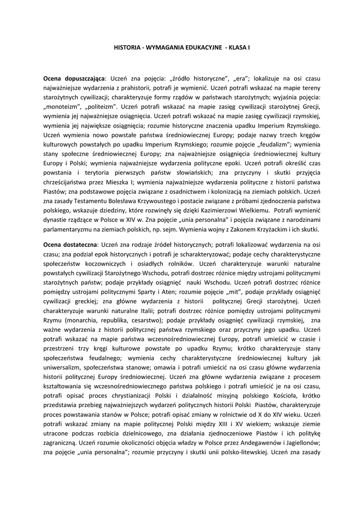 HISTORIA - WYMAGANIA EDUKACYJNE - KLASA I Ocena dopuszczająca: Uczeo zna pojęcia: „źródło historyczne”, „era”; lokalizuje na osi czasu najważniejsze wydarzenia z prahistorii, potrafi je wymienid. Uczeo potrafi wskazad na mapie tereny starożytnych cywilizacji; charakteryzuje formy rządów w paostwach starożytnych; wyjaśnia pojęcia: „monoteizm”, „politeizm”. Uczeo potrafi wskazad na mapie zasięg cywilizacji starożytnej Grecji, wymienia jej najważniejsze osiągnięcia. Uczeo potrafi wskazad na mapie zasięg cywilizacji rzymskiej, wymienia jej największe osiągnięcia; rozumie historyczne znaczenia upadku Imperium Rzymskiego. Uczeo wymienia nowo powstałe paostwa średniowiecznej Europy; podaje nazwy trzech kręgów kulturowych powstałych po upadku Imperium Rzymskiego; rozumie pojęcie „feudalizm”; wymienia stany społeczne średniowiecznej Europy; zna najważniejsze osiągnięcia średniowiecznej kultury Europy i Polski; wymienia najważniejsze wydarzenia polityczne epoki. Uczeo potrafi określid czas powstania i terytoria pierwszych paostw słowiaoskich; zna przyczyny i skutki przyjęcia chrześcijaostwa przez Mieszka I; wymienia najważniejsze wydarzenia polityczne z historii paostwa Piastów; zna podstawowe pojęcia związane z osadnictwem i kolonizacją na ziemiach polskich. Uczeo zna zasady Testamentu Bolesława Krzywoustego i postacie związane z próbami zjednoczenia paostwa polskiego, wskazuje dziedziny, które rozwinęły się dzięki Kazimierzowi Wielkiemu. Potrafi wymienid dynastie rządzące w Polsce w XIV w. Zna pojęcie „unia personalna” i pojęcia związane z narodzinami parlamentaryzmu na ziemiach polskich, np. sejm. Wymienia wojny z Zakonem Krzyżackim i ich skutki. Ocena dostateczna: Uczeo zna rodzaje źródeł historycznych; potrafi lokalizowad wydarzenia na osi czasu; zna podział epok historycznych i potrafi je scharakteryzowad; podaje cechy charakterystyczne społeczeostw koczowniczych i osiadłych rolników. Uczeo charakteryzuje warunki naturalne powstałych cywilizacji Starożytnego Wschodu, potrafi dostrzec różnice między ustrojami politycznymi starożytnych paostw; podaje przykłady osiągnięd nauki Wschodu. Uczeo potrafi dostrzec różnice pomiędzy ustrojami politycznymi Sparty i Aten; rozumie pojęcie „mit”, podaje przykłady osiągnięd cywilizacji greckiej; zna główne wydarzenia z historii politycznej Grecji starożytnej. Uczeo charakteryzuje warunki naturalne Italii; potrafi dostrzec różnice pomiędzy ustrojami politycznymi Rzymu (monarchia, republika, cesarstwo); podaje przykłady osiągnięd cywilizacji rzymskiej, zna ważne wydarzenia z historii politycznej paostwa rzymskiego oraz przyczyny jego upadku. Uczeo potrafi wskazad na mapie paostwa wczesnośredniowiecznej Europy, potrafi umieścid w czasie i przestrzeni trzy kręgi kulturowe powstałe po upadku Rzymu; krótko charakteryzuje stany społeczeostwa feudalnego; wymienia cechy charakterystyczne średniowiecznej kultury jak uniwersalizm, społeczeostwa stanowe; omawia i potrafi umieścid na osi czasu główne wydarzenia historii politycznej Europy średniowiecznej. Uczeo zna główne wydarzenia związane z procesem kształtowania się wczesnośredniowiecznego paostwa polskiego i potrafi umieścid je na osi czasu, potrafi opisad proces chrystianizacji Polski i działalnośd misyjną polskiego Kościoła, krótko przedstawia przebieg najważniejszych wydarzeo politycznych historii Polski Piastów, charakteryzuje proces powstawania stanów w Polsce; potrafi opisad zmiany w rolnictwie od X do XIV wieku. Uczeo potrafi wskazad zmiany na mapie politycznej Polski między XIII i XV wiekiem; wskazuje ziemie utracone podczas rozbicia dzielnicowego, zna działania zjednoczeniowe Piastów i ich politykę zagraniczną. Uczeo rozumie okoliczności objęcia władzy w Polsce przez Andegawenów i Jagiellonów; zna pojęcie „unia personalna”; rozumie przyczyny i skutki unii polsko-litewskiej. Uczeo zna zasady funkcjonowania sejmu w Polsce oraz działania polskich władców w dziedzinie nauki, kultury, obronności i prawa. Ocena dobra: Uczeo rozumie różnice pomiędzy rodzajami Źródeł historycznych; zna ery historyczne i współczesną periodyzację dziejów, potrafi krótko scharakteryzowad epoki historyczne; potrafi opisad życie społeczności prahistorycznych. Uczeo zna najważniejsze osiągnięci cywilizacji Starożytnego Wchodu; przedstawia strukturę społeczeostw starożytnych; potrafi ogólnie scharakteryzowad poznane religie starożytne. Uczeo zna najważniejsze osiągnięcia cywilizacji greckiej; zna pojęcie „filozofia” i główne szkoły filozofii greckiej; potrafi umieścid na osi czasu główne wydarzenia historii politycznej Grecji starożytnej oraz krótko je opisad; widzi związek między warunkami naturalnymi a powstaniem i rozwojem greckich polis. Uczeo zna najważniejsze osiągnięcia cywilizacji rzymskiej; przestawia strukturę społeczeostwa rzymskiego; potrafi umieścid na osi czasu główne wydarzenia polityczne z historii Rzymu oraz krótko je omówid; dostrzega związki pomiędzy warunkami naturalnymi a powstaniem i rozwojem Imperium Rzymskiego; potrafi opisad przyczyny upadku Rzymu. Uczeo umie przedstawid okoliczności powstania paostw wczesnośredniowiecznej Europy; wymienia główne osiągnięcia kultury arabskiej i bizantyjskiej, a także zachodnioeuropejskiego chrześcijaostwa; potrafi przedstawid genezę feudalizmu; omówi cechy charakterystyczne kultury średniowiecznej Europy, jej jednośd (uniwersalizm) i różnorodnośd; potrafi opisad główne wydarzenia polityczne epoki oraz wskazad ich przyczyny i skutki. Uczeo rozumie rolę Polan i Piastów w jednoczeniu plemion polskich; dostrzega wpływ chrześcijaostwa na rozwój polskiej kultury i obyczaje mieszkaoców Polski; potrafi wyjaśnid związki przyczynowo-skutkowe pomiędzy wydarzeniami politycznymi w Polsce Piastów. Uczeo zna okoliczności zmian dynastycznych w Polsce, z
