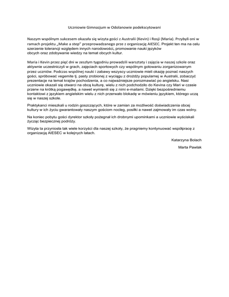 Uczniowie Gimnazjum w Odolanowie podekscytowani Naszym wspólnym sukcesem okazała się wizyta gości z Australii (Kevin) i Rosji (Maria). Przybyli oni w ramach projektu „Make a step” przeprowadzanego prze z organizację AIESEC. Projekt ten ma na celu szerzenie tolerancji względem innych narodowości, promowanie nauki języków obcych oraz zdobywanie wiedzy na temat obcych kultur. Maria i Kevin przez pięć dni w zeszłym tygodniu prowadzili warsztaty i zajęcia w naszej szkole oraz aktywnie uczestniczyli w grach, zajęciach sportowych czy wspólnym gotowaniu zorganizowanym przez uczniów. Podczas wspólnej nauki i zabawy wszyscy uczniowie mieli okazję poznać naszych gości, spróbować vegemite tj. pasty zrobionej z wyciągu z drożdży popularnej w Australii, zobaczyć prezentacje na temat krajów pochodzenia, a co najważniejsze porozmawiać po angielsku. Nasi uczniowie okazali się otwarci na obcą kulturę, wielu z nich podchodziło do Kevina czy Mari w czasie przerw na krótką pogawędkę, a nawet wymienili się z nimi e-mailami. Dzięki bezpośredniemu kontaktowi z językiem angielskim wielu z nich przerwało blokadę w mówieniu językiem, którego uczą się w naszej szkole. Praktykanci mieszkali u rodzin goszczących, które w zamian za możliwość doświadczenia obcej kultury w ich życiu gwarantowały naszym gościom nocleg, posiłki a nawet zajmowały im czas wolny. Na koniec pobytu gości dyrektor szkoły pożegnał ich drobnymi upominkami a uczniowie wyściskali życząc bezpiecznej podróży. Wizyta ta przyniosła tak wiele korzyści dla naszej szkoły, że pragniemy kontynuować współpracę z organizacją AIESEC w kolejnych latach. Katarzyna Bolach Marta Pawlak