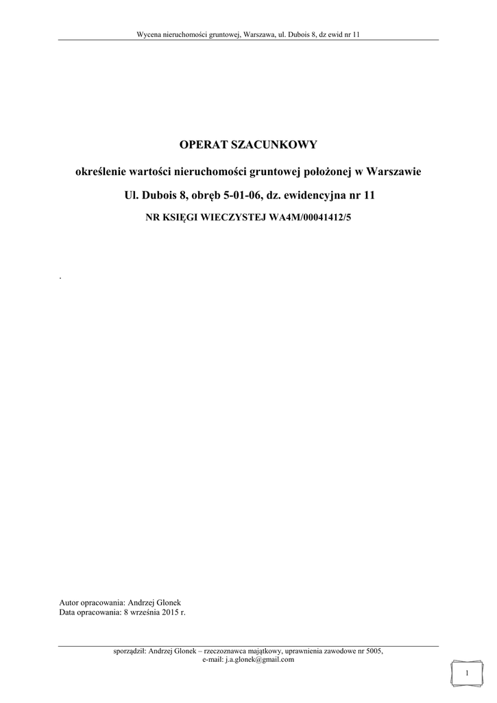 Wycena nieruchomości gruntowej, Warszawa, ul. Dubois 8, dz ewid nr 11 OPERAT SZACUNKOWY określenie wartości nieruchomości gruntowej położonej w Warszawie Ul. Dubois 8, obręb 5-01-06, dz. ewidencyjna nr 11 NR KSIĘGI WIECZYSTEJ WA4M/00041412/5 . Autor opracowania: Andrzej Glonek Data opracowania: 8 września 2015 r. sporządził: Andrzej Glonek – rzeczoznawca majątkowy, uprawnienia zawodowe nr 5005, e-mail: [email protected] 1 Wycena nieruchomości gruntowej, Warszawa, ul. Dubois 8, dz ewid nr 11 WYCIĄG Z OPERATU SZACUNKOWEGO Opis nieruchomości Cel wyceny Metoda wyceny Właściciel praw do nieruchomości Adres: Ul. Dubois 8 Dzielnica: Śródmieście Działka/ki: nr 11 Obręb: 5-01-06 Powierzchnia nieruchomości: 1297 m2 Kw: WA4M/00041412/5 Określenie wartości prawa własności gruntu oddanego w użytkowanie wieczyste w celu aktualizacji opłaty z tytułu użytkowania wieczystego Podejście porównawcze, metoda porównywania parami Właściciel: Miasto Stołeczne Warszawa Użytkownik wieczysty: Osoby fizyczne Wartość rynkowa prawa własności nieruchomości gruntowej 6 754 971 zł Słownie Sześć milionów siedemset pięćdziesiąt cztery tysiące dziewięćset siedemdziesiąt jeden złotych Wartość rynkowa 1 m2 prawa własności 5 208,15 zł Daty istotne dla operatu Autor operatu szacunkowego Data sporządzenia wyceny: 8 września 2015 r. Data, na którą określono wartość przedmiotu wyceny: 3 września 2015 r. Data, na którą określono i uwzględniono w wycenie stan przedmiotu wyceny: 3 września 2015 r. Data oględzin: 3 września 2015 r. Andrzej Glonek Uprawnienia nr 5005 Pieczęć i podpis rzeczoznawcy majątkowego sporządził: Andrzej Glonek – rzeczoznawca majątkowy, uprawnienia zawodowe nr 5005, e-mail: [email protected] 2 Wycena nieruchomości gruntowej, Warszawa, ul. Dubois 8, dz ewid nr 11 SPIS TREŚCI 1. PRZEDMIOT I ZAKRES WYCENY .................................................................................................................................................. 4 1.1. 1.2. PRZEDMIOT I ZAKRES WYCENY ................................................................................................................................................ 4 ZAKRES WYCENY .................................................................................................................................................................... 4 2. CEL WYCENY ................................................................................................................................................................................... 4 3. PODSTAWY OPRACOWANIA OPERATU SZACUNKOWEGO ................................................................................................... 4 3.1. 3.2. 3.3. 3.4. PODSTAWA FORMALNA WYCENY ............................................................................................................................................. 4 PODSTAWY PRAWNE WYCENY ................................................................................................................................................. 4 PODSTAWY METODOLOGICZNE................................................................................................................................................ 4 ŹRÓDŁA DANYCH MERYTORYCZNYCH ..................................................................................................................................... 5 4. DATY ISTOTNE DLA OPERATU SZACUNKOWEGO .................................................................................................................. 5 5. OPIS I OKREŚLENIE STANU NIERUCHOMOŚCI ......................................................................................................................... 5 5.1. 5.2. 5.3. 5.4. STAN PRAWNY ........................................................................................................................................................................ 5 STAN TECHNICZNO-UŻYTKOWY .............................................................................................................................................. 6 STAN OTOCZENIA.................................................................................................................................................................... 7 OTOCZENIE SZCZEGÓŁOWE ..................................................................................................................................................... 8 6. PRZEZNACZENIE NIERUCHOMOŚCI W PLANIE MIEJSCOWYM ............................................................................................ 8 7. OKREŚLENIE SPOSOBU WYCENY ................................................................................................................................................ 9 7.1. 7.2. WSKAZANIE RODZAJU OKREŚLANEJ WARTOŚCI........................................................................................................................ 9 WYBÓR PODEJŚCIA, METODY I TECHNIKI WYCENY ................................................................................................................... 9 8. ANALIZA I CHARAKTERYSTYKA RYNKU NIERUCHOMOŚCI ............................................................................................. 10 8.1. 8.2. SPECYFIKACJA BADANEGO RYNKU LOKALNEGO .................................................................................................................... 10 ANALIZA, CHARAKTERYSTYKA I UWARUNKOWANIA BADANEGO RYNKU ................................................................................ 11 9. OKREŚLENIE CECH RYNKOWYCH DLA WYCENIANEJ NIERUCHOMOŚCI ....................................................................... 13 10. WYZNACZENIE WAG POSZCZEGÓLNYCH CECH I OKREŚLENIE CECH DLA NIERUCHOMOŚCI BĘDĄCEJ PRZEDMIOTEM WYCENY........................................................................................................................................