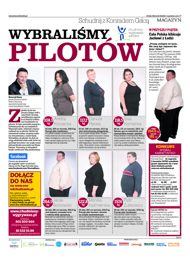 www.dzienniklodzki.pl Polska Dziennik £ódzki Łódzki | 9 grudnia 2011 | ? Schudnij z Konradem Gacą WYBRALIŚMY W PRZYSZŁY PIĄTEK: PILOTÓW „Proszę uratujcie mi życie. Nie chcę być ciężarem dla żony i dzieci”! Czy uda nam się pomóc Jackowi zrzucić 170 kg? Do czerwca 2012 ma być lżejszy o 100 kg - taki plan wyznaczył Jackowi Borkowskiemu nasz ekspert, a jego opiekun Konrad Gaca. Ile kilogramów straci Jacek po 2 tygodniach odchudzania, przeczytacie już za tydzień. Trzymajcie kciuki za Jacka Borkowskiego doda mu to sił i wiary w sukces! Cała Polska kibicuje Jackowi z Łodzi Konrad Gaca prezes Stowarzyszenia Walki z Otyłością, specjalista żywieniowy trener klasy Master Propta Z głosiło się do nas ponad 3 tysiące osób z całej Polski. Komisja weryfikacyjna zaprosiła na finał do Lublina 240 kandydatów na pilotów. To było niezwykłe przeżycie i doświadczenie dla nas wszystkich. Wspaniali ludzie, właściwie wszyscy nadawali się na pilotów. Wybór był niezmiernie trudny, okupiony wieloma wzruszeniami, a nawet łzami. Wybraliśmy 48 pilotów. Do dziś nie mogę odżałować wielu osób, które nie spełniały kryteriów i nie mogły zostać pilotami.Bardzo poruszyły nas Wasze historie. Trzymamy za wszystkich kciuki i serdecznie Was pozdrawiamy. 108,5 Anetta kg Korpecka 42 lata, 169 cm wzrostu, 108,5 kg Pracuje jako handlowiec W Lublinie zostałam przekonana, że trzeba dokonać skomasowanego ataku na kilogramy i wierzę że otrzymam wystarczająca pomoc, by z tego błędnego koła się wydostać. 117,2 Danuta kg Pękala 61 lat, 168 cm wzrostu, 117,2 kg Jest emerytowaną pielęgniarką To ja uczyłam kiedyś dzieci chodzić po górach i jeździć na łyżwach. Dzisiaj sama mam kłopoty z chodzeniem i sporo dolegliwości ortopedycznych: bóle kręgosłupa, stawów kolanowych i stóp . Teraz jestem innym człowiekiem: zdeterminowanym, by się zmienić. 118,5 Ewa kg Komecka waga 28 lat, 171 cm wzrostu, 118,5 kg Śpiewa, gra na saksofonie, jest nauczycielką muzyki i plastyki Noszę ubrania w rozmiarze 52, dlatego chcę schudnąć około 40 kg. Wierzę, że wtedy zyskam nowe życie. Marzę o tym, by urodzić oczekiwane dziecko i być piękną, atrakcyjną kobietą 264,9 kg wzrost 181 cm KONKURS WYGRAJ KARNET INTRO! Sprawdź program odchudzający Konrada Gacy – do wygrania 5 karnetów INTRO umożliwiających zapoznanie się z zasadami działania portalu www.sos-odchudzanie.pl. Chcesz się dowiedzieć jak wyglądał nabór na pilotów? Zajrzyj na Fan Page Konrada Gacy www.facebook.com/KonradGaca Pytanie konkursowe: Ilu pilotów akcji Chudniesz Wygrywasz Zdrowie wybrała komisja rekrutacyjna? a) 10; b) 48; c) 64? Jeżeli znasz odpowiedź zadzwoń dziś o godz. 12.00 pod numer tel. 801 500 666 (z telefonów stacjonarnych) lub 81 532 01 86 (z telefonów komórkowych). Karnet otrzyma 5 pierwszych osób, które się do nas dodzwonią. Powodzenia! DOŁĄCZ DO NAS Nie radzisz sobie z odchudzaniem? Spróbuj zrobić to z nami! Zapraszamy osoby z całej Polski na portal www.sos-odchudzanie.pl. www.chudnieszwygrywasz.pl Infolinia 801 500 666 (20 groszy za połączenie) Telefon 81 532 01 86 (opłata wg taryfy operatora) 264,9 Jacek kg Borkowski 44 lata, 181 cm wzrostu, 264,9 kg Jest kupcem, prowadzi wraz z rodziną sklep spożywczy Biorę leki na nadciśnienie, anemię, podwyższony cholesterol i trójglicerydy. Boli mnie kręgosłup, dokuczają kolana. Chcę zrzucić 170 kg i wrócić do aktywnego życia. Pójść na spacer, pojechać na narty. Ale przede wszystkim nie chce być już obciążeniem dla żony i dzieci. 122,8 Monika kg Kaźmierska 157,6 Piotr kg Zubkowicz 24 lata, 160 cm wzrostu, 122,8 kg Pracuje jako kucharz, obecnie na urlopie wychowawczym Chcę schudnąć 60 kilogramów i żyć normalnie. Wyjść z dzieckiem na spacer i nie słyszeć komentarzy na temat swojego wyglądu, nie szukać z tego powodu odludnych, jak najmniej uczęszczanych miejsc. 46 lat, 190 cm wzrostu, 157,6 kg Pracuje jako handlowiec Chcę pomóc sobie i innym; jako pilot akcji mam motywację i dam z siebie wszystko, żeby być normalnym człowiekiem i kupować ubrania w każdym sklepie, nie tylko dla otyłych. FOT.AGNIESZKA KOZŁOWSKA na www.sosodchudzanie.pl Karnet INTRO to: a dwutygodniowy system żywieniowy i treningowy a 1 konsultacja z konsultantem Konrada Gacy (wideokonferencja lub telefon) a możliwość korzystania z bogatej w informacje BAZY WIEDZY a możliwość śledzenia wątków i postów na forum. 1162118/00 ORGANIZATOR AKCJI : PARTNERZY AKCJI : PATRONI MEDIALNI AKCJI :