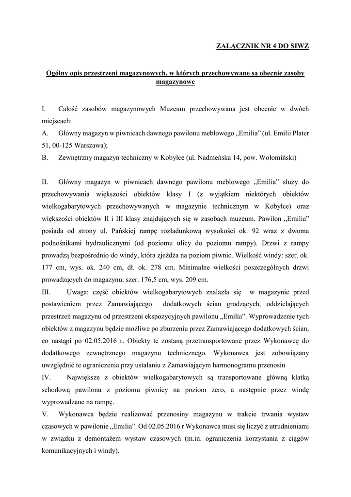 ZAŁĄCZNIK NR 4 DO SIWZ Ogólny opis przestrzeni magazynowych, w których przechowywane są obecnie zasoby magazynowe I. Całość zasobów magazynowych Muzeum przechowywana jest obecnie w dwóch A. Główny magazyn w piwnicach dawnego pawilonu meblowego „Emilia” (ul. Emilii Plater B. Zewnętrzny magazyn techniczny w Kobyłce (ul. Nadmeńska 14, pow. Wołomiński) II. Główny magazyn w piwnicach dawnego pawilonu meblowego „Emilia” służy do miejscach: 51, 00-125 Warszawa); przechowywania większości obiektów klasy I (z wyjątkiem niektórych obiektów wielkogabarytowych przechowywanych w magazynie technicznym w Kobyłce) oraz większości obiektów II i III klasy znajdujących się w zasobach muzeum. Pawilon „Emilia” posiada od strony ul. Pańskiej rampę rozładunkową wysokości ok. 92 wraz z dwoma podnośnikami hydraulicznymi (od poziomu ulicy do poziomu rampy). Drzwi z rampy prowadzą bezpośrednio do windy, która zjeżdża na poziom piwnic. Wielkość windy: szer. ok. 177 cm, wys. ok. 240 cm, dł. ok. 278 cm. Minimalne wielkości poszczególnych drzwi prowadzących do magazynu: szer. 176,5 cm, wys. 209 cm. III. Uwaga: część obiektów wielkogabarytowych znalazła się postawieniem przez Zamawiającego w magazynie przed dodatkowych ścian grodzących, oddzielających przestrzeń magazynu od przestrzeni ekspozycyjnych pawilonu „Emilia”. Wyprowadzenie tych obiektów z magazynu będzie możliwe po zburzeniu przez Zamawiającego dodatkowych ścian, co nastąpi po 02.05.2016 r. Obiekty te zostaną przetransportowane przez Wykonawcę do dodatkowego zewnętrznego magazynu technicznego. Wykonawca jest zobowiązany uwzględnić te ograniczenia przy ustalaniu z Zamawiającym harmonogramu przenosin IV. Największe z obiektów wielkogabarytowych są transportowane główną klatką schodową pawilonu z poziomu piwnicy na poziom zero, a następnie przez windę wyprowadzane na rampę. V. Wykonawca będzie realizować przenosiny magazynu w trakcie trwania wystaw czasowych w pawilonie „Emilia”. Od 02.05.2016 r Wykonawca musi się liczyć z utrudnieniami w związku z demontażem wystaw czasowych (m.in. ograniczenia korzystania z ciągów komunikacyjnych i windy). VI. Zewnętrzny magazyn techniczny w Kobyłce – magazyn zewnętrzny, parterowy. Zamawiającemu nie są znane żadne ograniczenia logistyczne, które mogłyby uniemożliwić Wykonawcy wykonanie transportów z tego magazynu.