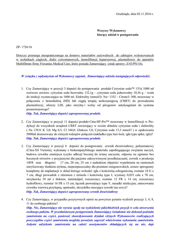 Grudziądz, dnia 02.11.2016 r. Wszyscy Wykonawcy biorący udział w postępowaniu ZP- 1726/16 Dotyczy przetargu nieograniczonego na dostawy materiałów zuŜywalnych do zabiegów wykonywanych w technikach ciągłych, dializ cytrynianowych, hemofiltracji heparynowej, plazmaferezy do aparatów Multifiltrate firmy Fresunius Medical Care, które posiada Zamawiający (znak sprawy: Z/43/PN/16). W związku z wpłynięciem od Wykonawcy zapytań, Zamawiający udziela następujących odpowiedzi: 1. Czy Zamawiający w pozycji 3 dopuści do postępowania produkt Cytrynian sodu™ 13%( 1000 ml roztworu zawiera: cytrynian sodu bezwodny 132,1g – cytrynian sodu jednowodny 10,36 g – woda do iniekcji wystarczająca na 1000 ml. Elektrolity (mmol/l): Na+ 1352 – Citrate3- 500, stosowany w połączeniu z hemodializą (HD) lub ciągłą terapią nerkozastępczą (CRRT) do prowadzenia plazmaferezy, aferezy LDL jako sterylny i wolny od pirogenów antykoagulant do systemu pozaustrojowego? Odp. Tak, Zamawiający dopuści zaproponowany produkt. 2. Czy Zamawiający w pozycji 11 dopuści produkt Citra-HF-Pre™ stosowany w hemofiltracji w Predylucji do wszystkich urządzeń CRRT zawierający w swoim składzie cytrynian sodu i elektrolity ( Na 139,9; K 3,0; Mg 0,5; Cl 104,0; Glukoza 5,0; Cytrynian sodu 13,3 mmol/l ) w opakowaniu 5000ml dostosowany do róŜnych rodzajów połączeń (nakładka typu luer-lock, igła typu spike, igła)? Odp. Tak, Zamawiający dopuści zaproponowany produkt. 3. Czy Zamawiający w pozycji 8 dopuści do postępowania cewnik dwuświatłowy, poliuretanowy (Citra-XS Victoria), wykonany z biokompatybilnego materiału zapobiegającego zwęŜaniu naczyń, budowa cewnika zmniejsza ryzyko adhezji bocznej do ściany naczynia, odporny na zginanie bez bocznych otworów z przyjaznymi dla pacjenta zakrzywionymi przedłuŜaczami, cewnik o przekroju 14FR oraz długości 17 cm, 20 cm, 25 cm z nadrukiem objętości wypełnienia na ramionach sterylizowany tlenkiem etylenu, nieprzepuszczalny dla promieni rentgenowskich, zestaw apirogenny kompletny do implantacji w skład którego wchodzi: igła z końcówką echogeniczną, rozmiar 18 G x 7 cm, długi prowadnik z rdzeniem z nitinolu i końcówką typu J, wymiary 0,035 cala x 70 cm, strzykawka 10 ml z tłokiem, miniskalpel, rozszerzacz, rozmiar 12 FR x 14 cm, rozszerzacz hydrofilowy, rozmiar 16 FR x 15 cm, łącznik prowadzący typu Y, nasadki iniekcyjne, umocowanie cewnika warstwą przylepną, opatrunki, skrzydełko mocujące cewnik (na szwy)? Odp. Tak, Zamawiający dopuści zaproponowany cewnik dwuświatłowy 4. Czy Zamawiający, w przypadku pozytywnych opinii na powyŜsze pytania wydzieli pozycje 3, 4, 8, 11 do osobnego pakietu? Odp. Nie, Zamawiający nie wyraŜa zgody na wydzielenie jakichkolwiek pozycji w celu utworzenia osobnego pakietu. W przedmiotowym postępowaniu Zamawiający świadomie nie dokonał podziału zamówienia na części, poniewaŜ skoordynowanie działań róŜnych Wykonawców realizujących poszczególne części zamówienia mogłoby powaŜnie zagrozić właściwemu wykonaniu zamówienia. Jedynie udzielenie zamówienia na całość asortymentów składających się na nie, daje Zamawiającemu moŜliwość wykonywania zabiegów w technikach ciągłych (ciągła terapia nerkozastepcza i plazmafereza) , gdyŜ wymagają one uŜycia kompletnego zestawu. W przypadku hipotetycznego podziału na części przedmiotowego zamówienia, nie dokonanie wyboru jakiejkolwiek z nich skutkowałoby automatycznie bezcelowością wyboru pozostałych, gdyŜ do realizacji zabiegów w technikach ciągłych wymagany jest komplet asortymentów składających się na niniejsze zamówienie.