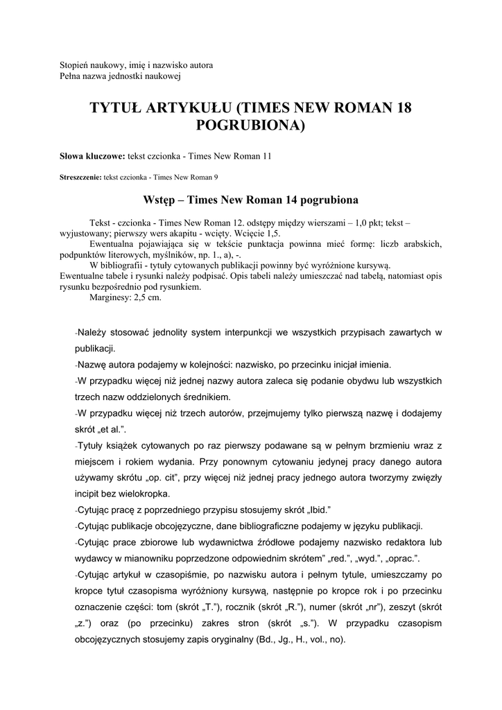 Stopień naukowy, imię i nazwisko autora Pełna nazwa jednostki naukowej TYTUŁ ARTYKUŁU (TIMES NEW ROMAN 18 POGRUBIONA) Słowa kluczowe: tekst czcionka - Times New Roman 11 Streszczenie: tekst czcionka - Times New Roman 9 Wstęp – Times New Roman 14 pogrubiona Tekst - czcionka - Times New Roman 12. odstępy między wierszami – 1,0 pkt; tekst – wyjustowany; pierwszy wers akapitu - wcięty. Wcięcie 1,5. Ewentualna pojawiająca się w tekście punktacja powinna mieć formę: liczb arabskich, podpunktów literowych, myślników, np. 1., a), -. W bibliografii - tytuły cytowanych publikacji powinny być wyróżnione kursywą. Ewentualne tabele i rysunki należy podpisać. Opis tabeli należy umieszczać nad tabelą, natomiast opis rysunku bezpośrednio pod rysunkiem. Marginesy: 2,5 cm. -Należy stosować jednolity system interpunkcji we wszystkich przypisach zawartych w publikacji. -Nazwę autora podajemy w kolejności: nazwisko, po przecinku inicjał imienia. -W przypadku więcej niż jednej nazwy autora zaleca się podanie obydwu lub wszystkich trzech nazw oddzielonych średnikiem. -W przypadku więcej niż trzech autorów, przejmujemy tylko pierwszą nazwę i dodajemy skrót „et al.”. -Tytuły książek cytowanych po raz pierwszy podawane są w pełnym brzmieniu wraz z miejscem i rokiem wydania. Przy ponownym cytowaniu jedynej pracy danego autora używamy skrótu „op. cit”, przy więcej niż jednej pracy jednego autora tworzymy zwięzły incipit bez wielokropka. -Cytując pracę z poprzedniego przypisu stosujemy skrót „Ibid.” -Cytując publikacje obcojęzyczne, dane bibliograficzne podajemy w języku publikacji. -Cytując prace zbiorowe lub wydawnictwa źródłowe podajemy nazwisko redaktora lub wydawcy w mianowniku poprzedzone odpowiednim skrótem” „red.”, „wyd.”, „oprac.”. -Cytując artykuł w czasopiśmie, po nazwisku autora i pełnym tytule, umieszczamy po kropce tytuł czasopisma wyróżniony kursywą, następnie po kropce rok i po przecinku oznaczenie części: tom (skrót „T.”), rocznik (skrót „R.”), numer (skrót „nr”), zeszyt (skrót „z.”) oraz (po przecinku) zakres stron (skrót „s.”). W przypadku czasopism obcojęzycznych stosujemy zapis oryginalny (Bd., Jg., H., vol., no). 1.Wydawnictwa zwarte Autor (autorzy). Tytuł. Wydanie. Miejsce wydania, rok wydania. ISBN. Np.: 1. Majkowski, A. Historia Kaszubów. Wyd. 2. Gdańsk, 1991. 83-85011-37-4. 2. Rachwał, T. ; Dwuraźna, S. Ćwiczenia z geometrii wykreślnej. T. 1, Rzuty Monge’a. Cz. 1, Teksty zadań i rozwiązań. Warszawa, 1984. 83-01-11069-4. 3. Bartoszewicz-Fabiańska, B. ; et al. Adaptacja formatu MARC BN dla potrzeb bibliografii regionalnej. Warszawa, 1999. ISBN 83-87629-20-0. 4. Bibliografia. Metodyka i organizacja. Red. Z. Żmigrodzki. Warszawa, 2000. ISBN 8387629-43-X. 2.Fragment (rozdział) w wydawnictwie zwartym Autor (autorzy). Tytuł. Wydanie. Numeracja części. Miejsce wydania, rok wydania. Lokalizacja w obrębie dokumentu macierzystego (tj. tytuł fragmentu, strony). Np.: 1. Kochanowski, J. Fraszki. Wyd. 3 przejrz. Warszawa, 1998. Do gór i lasów, s. 113114. 2. Bibliografia. Metodyka i organizacja. Red. Z. Żmigrodzki. Warszawa, 2000. Rozdz. 6, Opis bibliograficzny, s. 63-125. 3.Artykuł w wydawnictwie zwartym Np.: 1. Woźniak, J. Język haseł przedmiotowych KABA. In Normalizacja bibliotecznobibliograficzna w aspekcie automatyzacji bibliotek. Problemy i perspektywy. Materiały z ogólnopolskiego seminarium Gdańsk, 18-20 września 1996 r. Red. J. Chruścińska ; M. Majewska. Warszawa, 1997, s. 64-74. 2. Włodarczyk, E. Friedrich Ackermann. In Szczecinianie Stulecia. Szczecin, 2000, s. 15-16. 3. Buske, N. „Blätter für Kirchengeschichte Pommerns” und die Bemühungen um eine Fortsetzung dieser Zeitschrift. In T. Porada. 35 Jahre Arbeitsgemeinschaft für pommersche Kirchengeschichte e.V. Schwerin, 2008, s. 173-185. 4.Wydawnictwo ciągłe Tytuł. Odpowiedzialność. Wydanie. Oznaczenie zeszytu (daty i numery). Miejsce wydania, rok wydania. ISSN. Np.: 1. Nasze Pomorze. Muzeum Zachodno-Kaszubskie w Bytowie. 2003, nr 5. Bytów, 2004. ISSN 1640-1239. 2. Przegląd Biblioteczny. Polska Akademia Nauk. Biblioteka w Warszawie, Stowarzyszenie Bibliotekarzy Polskich. 1999, R. 67. Warszawa, 1999. ISSN 0033202X. 3. Bibliotekarz Zachodniopomorski. Książnica Pomorska im. Stanisława Staszica w Szczecinie, Szczecińskie Porozumienie Bibliotek, Koszalińska Biblioteka im. Joachima Lelewela w Koszalinie, Stowarzyszenie Bibliotekarzy Polskich. Okręg Zachodniopomorski. 1959 nr 1-. Szczecin, 1959- . ISSN 0406-1578. 4. Polish Journal of ecology. Institute of Ecology, Polish Academy of Science. 1998 vol. 46, no. 1-. ISSN 1505-2249. 5.Artykuł w czasopiśmie Autor (autorzy). Tytuł artykułu. Tytuł czasopisma. Lokalizacja w obrębie dokumentu macierzystego (rok, nr czasopisma, strona lub strony). Np.: 1. Szalewska, E. Architektura krajobrazu a odnowa pomorskiej wsi Swołowo. Nasze Pomorze. 2003, nr 5, s. 5-19. 2. Gorman, M. Przyszłość biblioteki akademickiej. Przegląd Biblioteczny. 1995, R. 63, z. 2, s. 147-155. 3. Janiak, S., et al. Aktywność katalizatorów o zróżnicowanej strukturze porowatej w hydroodsiarczaniu frakcji olejowej. Przemysł Chemiczny. 1978, T. 57, nr 7, s. 343345. 6.Dokumenty elektroniczne 6.1Wydawnictwa zwarte na CD-ROM Autor (autorzy). Tytuł [Typ nośnika]. Wydanie. Miejsce wydania: Wydawca, data wydania. Data aktualizacji. ISBN. Np.: 1. Sarwa, A. Legendy i opowieści sandomierskie [CD-ROM]. Wyd. 2. Sandomierz: Oficyna Wydawnicza Elisa, 2003. ISBN 83-89415-01-1. 2. Gielecki, J. ; Gacek W. ; Wilczak, T. Nomina. Multimedialny słownik anatomiczny [CD-ROM]. Wersja 2.0. Warszawa: Vortex, 1997. 3. McConnell, W. H. Constitutional history. In The Canadian encyklopedia [CD-ROM]. Macintosh version 1.1. Toronto: System, 1993. ISBN 0-7710-1932-7. Wydawnictwa zwarte dostępne online Autor (autorzy). Tytuł [Typ nośnika]. Wydanie. Miejsce wydania: Wydawca