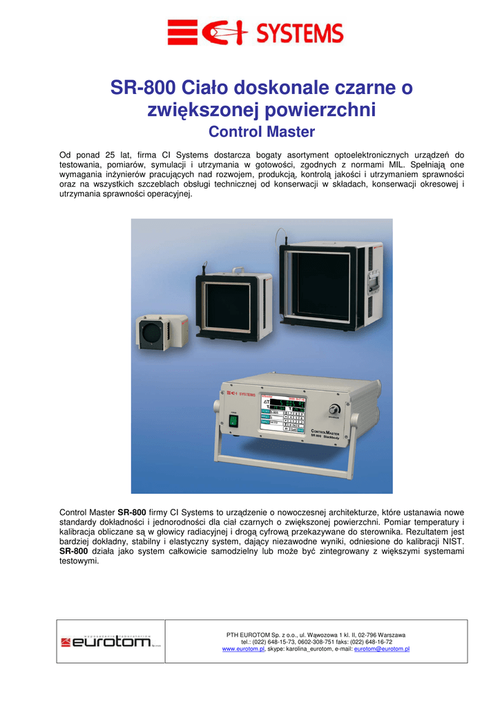 SR-800 Ciało doskonale czarne o zwiększonej powierzchni ControI Master Od ponad 25 lat, firma CI Systems dostarcza bogaty asortyment optoelektronicznych urządzeń do testowania, pomiarów, symulacji i utrzymania w gotowości, zgodnych z normami MIL. Spełniają one wymagania inżynierów pracujących nad rozwojem, produkcją, kontrolą jakości i utrzymaniem sprawności oraz na wszystkich szczeblach obsługi technicznej od konserwacji w składach, konserwacji okresowej i utrzymania sprawności operacyjnej. Control Master SR-800 firmy CI Systems to urządzenie o nowoczesnej architekturze, które ustanawia nowe standardy dokładności i jednorodności dla ciał czarnych o zwiększonej powierzchni. Pomiar temperatury i kalibracja obliczane są w głowicy radiacyjnej i drogą cyfrową przekazywane do sterownika. Rezultatem jest bardziej dokładny, stabilny i elastyczny system, dający niezawodne wyniki, odniesione do kalibracji NIST. SR-800 działa jako system całkowicie samodzielny lub może być zintegrowany z większymi systemami testowymi. PTH EUROTOM Sp. z o.o., ul. Wąwozowa 1 kl. II, 02-796 Warszawa tel.: (022) 648-15-73, 0602-308-751 faks: (022) 648-16-72 www.eurotom.pl, skype: karolina_eurotom, e-mail: [email protected] Wysoka wydajność • • • • • • • • • Najwyższa dokładność Rozdzielczość w mK (miliKelwin) Wysoka jednorodność Szeroki zakres temperatur; inne temperatury dostępne na życzenie Duża rozdzielczość wyświetlacza temperatury Wbudowane testowanie MRTD zwiększające sprawność Wbudowane testy skracające czas konserwacji Standardowe emitery od 2" do 12". Inne wymiary na życzenie. Niskie szumy akustyczne Łatwość używania • • • • • • • • • • • Wymienne głowice dla tego samego sterownika Kalibrowane głowice radiacyjne, niezależne od sterownika, ułatwiające konserwację Złącza komunikacji Ethernet, GPIB (IEEE488) i RS232 Zdalne sterowanie i konserwacja przez sieć lokalną Duży kolorowy wyświetlacz LCD Interfejs użytkownika z ekranem dotykowym Możliwość sterowania czterech zmotoryzowanych urządzeń Na życzenie wymiary dostosowane do potrzeb użytkownika Mały i przenośny sterownik Dołączony zestaw montażu w racku 19" System operacyjny Windows CE Certyfikaty • • Certyfikat kalibracji odniesiony wzorca NIST Certyfikowany zgodnie z CE, i FCC i MIL-PRF-28800D Dane techniczne 1,6 SR-800 Model Okno wlotowe (d) Temperatura absolutna, zakres Temperatura różnicowa, zakres Rozdzielczość punktu nastawy i odczytu 2 Jednorodność 3 Dokładność temperatury Absolutna Różnicowa Stabilność Emisyjność 4 Czas ustalenia Szybkość reakcji Wielkość głowicy (mm) Masa głowicy Zużycie energii 2D/A 2" 0°C do 125°C -25°C do 100°C 0,001 °C 4D/A 4"x4" 0°C do 125°C -25°C do 100°C 0,001 °C 7D/A 7"x7" 5°C do 90°C -20°C do 65°C 0,001 °C 12D/A 12"x12" 10°C do 80°C -15°C do 55°C 0,001°C ±0,01 °C ±0,01 °C ±0,015°C ±0,03°C 0,008°C dla Tabs< 50°C, 0,015°C dla Tabs>50°C 0,008°C dla ∆T≤±25°C, 0,015°C dla ∆T>25°C ±0.002°C dla ∆T≤±10°C -1 -2 0,97±0,02 W·sr ·m 30 sekund 0,5°C/sec 0,33°C/sec 0,22°C/sec 0,17°C/sec 126x133x80 161x190x201 224x225x265 360x347x380 1 kg 5 kg 10 kg 28 kg 200 W 200 W 250 W 400 W PTH EUROTOM Sp. z o.o., ul. Wąwozowa 1 kl. II, 02-796 Warszawa tel.: (022) 648-15-73, 0602-308-751 faks: (022) 648-16-72 www.eurotom.pl, skype: karolina_eurotom, e-mail: [email protected] Wbudowany test MRTD Intuicyjny ekran dotykowy zapewnia łatwe kontrolowanie temperatury i czterech urządzeń z napędem Opcje SR-800 Model 2D/A 4D/A 7D/A 12D/A ET – Rozszerzony zakres temp. Temperatura absolutna 0 °C - 175°C 0 °C - 175 °C 0 °C - 175 °C 5 °C - 125 °C Temperatura różnicowa -25 °C - 150°C -25 °C - 150 °C -20 °C - 150 °C -20 °C - 100 °C HU - Duża jednorodność 2 Jednorodność — — ±0,008°C ±0,014°C LT - Niska temperatura Temperatura absolutna — — -40 °C do 150 °C -20 °C do 150 °C Temperatura różnicowa — — -65 °C do 125 °C -45 °C do 125 °C WTR - Szeroki zakres temp. Temperatura absolutna — -20°C do 175°C — — Temperatura różnicowa — -45°C do 150°C — — HE - Wysoka emisyjność -1 -2 Emisyjność (W·sr ·m ) 0.99±0.01 0.99±0.01 0.99±0.01 0.99±0.01 FS - Duża szybkość reakcji Szybkość reakcji — — 0.33 °C/s 0.25 °C/s CH - Komora klimatyczna Temperatura komory -30 °C do 70 °C -30 °C do 70 °C -30 °C do 70 °C -30 °C do 70 °C 5 Temperatura absolutna -40 °C do 80 °C -40 °C do 80 °C -40 °C do 80 °C -40 °C do 80 °C Temperatura różnicowa -10 °C do 40 °C -10 °C do 40 °C -10 °C do 40 °C -10 °C do 40 °C 3 Dokładność 0,01°C x ∆T lub 0.05°C (które jest większe). Ogólne dane techniczne Napięcie zasilania Temperatura pracy Temperatura przechowywania Wymiary sterownika Masa sterownika 95 do 240 V, 50/60 Hz 0 °C do 50 °C -20 °C do 70 °C 342 x 310 x 133 mm, 3U (wysokość) 10 kg Uwagi: 1. Wszystkie wartości obowiązują temperaturze otoczenia 25°C bez kondensacji. 2. Jednorodność jest wyznaczana przy zmianach ±1°C od temperatury otoczenia przy 80% powierzchni centralnej. W przypadku innych temperatur należy przemnożyć przez ∆T. 3. Dokładność odniesiona do wzorca CI-Systems kalibrowanego przez NIST. 4. Czas ustalania jest definiowany przy osiągnięciu odchyłki 0,001°C od wymaganej wartości. 5. Kalibrowane dla -10°C<(Tabs –Tkomory)<40°C. 6. Zastrzegamy prawo do zmian charakterystyki bez uprzedzenia. PTH EUROTOM Sp. z o.o., ul. Wąwozowa 1 kl. II, 02-796 Warszawa tel.: (022) 648-15-73, 0602-308-751 faks: (022) 648-16-72 www.eurotom.pl, skype: karolina_eurotom, e-mail: [email protected]