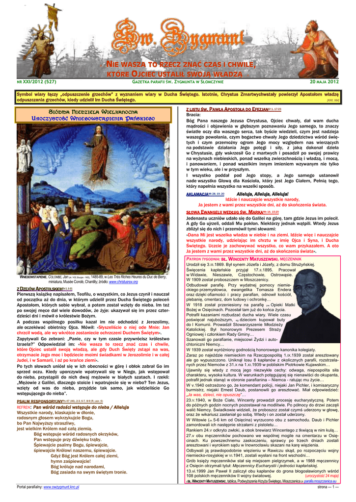 NIE WASZA TO RZECZ ZNAĆ CZAS I CHWILE, KTÓRE OJCIEC USTALIŁ SWOJĄ WŁADZĄ…« »… NR XXI/2012 (527) GAZETKA PARAFII ŚW. ZYGMUNTA W SŁOMCZYNIE 20 MAJA 2012 Symbol wiary łączy „odpuszczenie grzechów” z wyznaniem wiary w Ducha Świętego. Istotnie, Chrystus Zmartwychwstały powierzył Apostołom władzę odpuszczania grzechów, kiedy udzielił im Ducha Świętego. [KKK, 984] SIÓDMA NIEDZIELA WIELKANOCNA UROCZYSTOŚĆ WNIEBOWSTĄPIENIA PAŃSKIEGO Z LISTU ŚW. PAWŁA APOSTOŁA DO EFEZJANEf 1, 17-23 Bracia: Bóg Pana naszego Jezusa Chrystusa, Ojciec chwały, dał wam ducha mądrości i objawienia w głębszym poznawaniu Jego samego, to znaczy światłe oczy dla waszego serca, tak byście wiedzieli, czym jest nadzieja waszego powołania, czym bogactwo chwały Jego dziedzictwa wśród świętych i czym przemożny ogrom Jego mocy względem nas wierzących na podstawie działania Jego potęgi i siły, z jaką dokonał dzieła w Chrystusie, gdy wskrzesił Go z martwych i posadził po swojej prawicy na wyżynach niebieskich, ponad wszelką zwierzchnością i władzą, i mocą, i panowaniem, i ponad wszelkim innym imieniem wzywanym nie tylko w tym wieku, ale i w przyszłym. I wszystko poddał pod Jego stopy, a Jego samego ustanowił nade wszystko Głową dla Kościoła, który jest Jego Ciałem, Pełnią tego, który napełnia wszystko na wszelki sposób. Alleluja, Alleluja, Alleluja! Idźcie i nauczajcie wszystkie narody, Ja jestem z wami przez wszystkie dni, aż do skończenia świata. AKLAMACJAMt 28, 19. 20 SŁOWA EWANGELII WEDŁUG ŚW. MARKAMk 16, 15-20 Jedenastu uczniów udało się do Galilei na górę, tam gdzie Jezus im polecił. A gdy Go ujrzeli, oddali Mu pokłon. Niektórzy jednak wątpili. Wtedy Jezus zbliżył się do nich i przemówił tymi słowami: »Dana Mi jest wszelka władza w niebie i na ziemi. Idźcie więc i nauczajcie wszystkie narody, udzielając im chrztu w imię Ojca i Syna, i Ducha Świętego. Uczcie je zachowywać wszystko, co wam przykazałem. A oto Ja jestem z wami przez wszystkie dni, aż do skończenia świata«. PATRON TYGODNIA: BŁ. WINCENTY MATUSZEWSKI, MĘCZENNIK WNIEBOWSTAPIENIE, COLOMBE, Jan (ok. 1430, Bourges - 1493), 1485-89, w Les Très Riches Heures du Duc de Berry, miniatura, Musée Condé, Chantilly; źródło: www.christusrex.org Z DZEJÓW APOSTOLSKICHDz 1, 1-11 Pierwszą książkę napisałem, Teofilu, o wszystkim, co Jezus czynił i nauczał od początku aż do dnia, w którym udzielił przez Ducha Świętego poleceń Apostołom, których sobie wybrał, a potem został wzięty do nieba. Im też po swojej męce dał wiele dowodów, że żyje: ukazywał się im przez czterdzieści dni i mówił o królestwie Bożym. A podczas wspólnego posiłku kazał im nie odchodzić z Jerozolimy, ale oczekiwać obietnicy Ojca. Mówił: »Słyszeliście o niej ode Mnie: Jan chrzcił wodą, ale wy wkrótce zostaniecie ochrzczeni Duchem Świętym«. Zapytywali Go zebrani: „Panie, czy w tym czasie przywrócisz królestwo Izraela?” Odpowiedział im: »Nie wasza to rzecz znać czas i chwile, które Ojciec ustalił swoją władzą, ale gdy Duch Święty zstąpi na was, otrzymacie Jego moc i będziecie moimi świadkami w Jerozolimie i w całej Judei, i w Samarii, i aż po krańce ziemi«. Po tych słowach uniósł się w ich obecności w górę i obłok zabrał Go im sprzed oczu. Kiedy uporczywie wpatrywali się w Niego, jak wstępował do nieba, przystąpili do nich dwaj mężowie w białych szatach. I rzekli: „Mężowie z Galilei, dlaczego stoicie i wpatrujecie się w niebo? Ten Jezus, wzięty od was do nieba, przyjdzie tak samo, jak widzieliście Go wstępującego do nieba”. PSALM RESPONSORYJNYPs 47 (46), 2-3. 6-7. 8-9 (R.: por. 6) REFREN: Pan wśród radości wstępuje do nieba / Alleluja Wszystkie narody, klaskajcie w dłonie, radosnym głosem wykrzykujcie Bogu, bo Pan Najwyższy straszliwy, jest wielkim Królem nad całą ziemią. Bóg wstępuje wśród radosnych okrzyków, Pan wstępuje przy dźwięku trąby. Śpiewajcie psalmy Bogu, śpiewajcie, śpiewajcie Królowi naszemu, śpiewajcie. Gdyż Bóg jest Królem całej ziemi, hymn zaśpiewajcie! Bóg króluje nad narodami, Bóg zasiada na swym świętym tronie. Portal parafialny: www.swzygmunt.knc.pl Urodził się 3.III.1869. Był synem Józefa i Józefy, z domu Strużyńskiej. Święcenia kapłańskie przyjął 17.II.1895. Pracował w Widawie, Nieszawie, Częstochowie, Ostrowąsie. W 1909 został proboszczem w Moszczenicy. Odbudował parafię. Przy wydatnej pomocy niemieckiego przemysłowca, ewangelika Tomasza Endera oraz dzięki ofiarności i pracy parafian, odnowił kościół, plebanię, cmentarz, dom ludowy i ochronkę… W 1918 został przeniesiony na parafię pw. Opieki Matki Bożej w Osięcinach. Pozostał tam już do końca życia. Potrafił kazaniami rozbudzać ducha wiary. Wiele czasu poświęcał najuboższym, eg. dzieciom kupował buty do I Komunii. Prowadził Stowarzyszenie Młodzieży Katolickiej. Był honorowym Prezesem Straży Ogniowej i członkiem Rady Gminy… Szanowali go parafianie, miejscowi Żydzi i autochtoniczni Niemcy… W 1939 został wyróżniony godnością honorowego kanonika kolegiaty. Zaraz po najeździe niemieckim na Rzeczpospolitą 1.IX.1939 został aresztowany ale go wypuszczono. Uniknął losu 8 kapłanów z okolicznych parafii, rozstrzelanych przez Niemców z 31.X na 1.XI.1939 w pobliskim Piotrkowie Kujawskim… Ujawniły się wtedy z mocą jego niezwykłe cechy: odwaga, niepospolita siła charakteru, wysoka kultura. W warunkach potęgującej się nienawiści do okupanta, potrafił jednak stanąć w obronie parafianina – Niemca - ratując mu życie… W v.1940 ostrzeżono go, że komendant policji, niejaki Jan Pichler, i komisaryczny burmistrz, niejaki Ernest Daub, postanowili go aresztować. Miał odpowiedzieć: „Ja was, dzieci, nie opuszczę”… 23.V.1940, w Boże Ciało, Wincenty prowadził procesję eucharystyczną. Potem do późnych godzin nocny