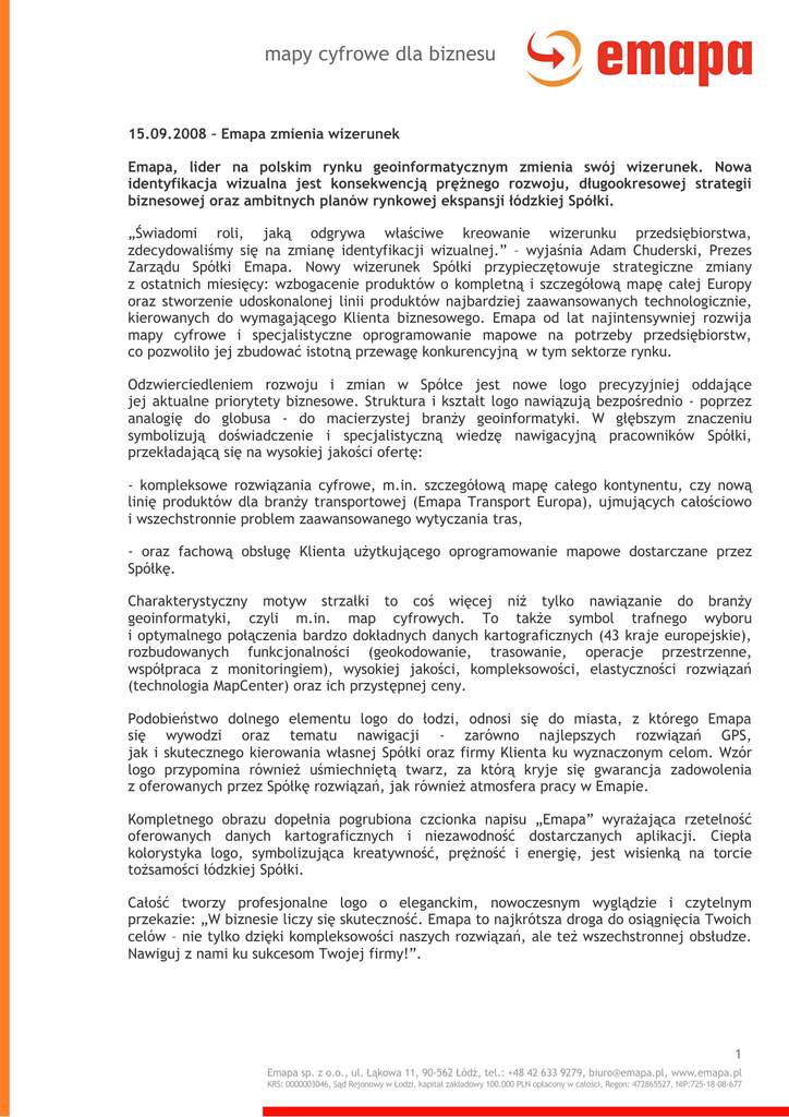 mapy cyfrowe dla biznesu 15.09.2008 – Emapa zmienia wizerunek Emapa, lider na polskim rynku geoinformatycznym zmienia swój wizerunek. Nowa identyfikacja wizualna jest konsekwencją prężnego rozwoju, długookresowej strategii biznesowej oraz ambitnych planów rynkowej ekspansji łódzkiej Spółki. „Świadomi roli, jaką odgrywa właściwe kreowanie wizerunku przedsiębiorstwa, zdecydowaliśmy się na zmianę identyfikacji wizualnej.” – wyjaśnia Adam Chuderski, Prezes Zarządu Spółki Emapa. Nowy wizerunek Spółki przypieczętowuje strategiczne zmiany z ostatnich miesięcy: wzbogacenie produktów o kompletną i szczegółową mapę całej Europy oraz stworzenie udoskonalonej linii produktów najbardziej zaawansowanych technologicznie, kierowanych do wymagającego Klienta biznesowego. Emapa od lat najintensywniej rozwija mapy cyfrowe i specjalistyczne oprogramowanie mapowe na potrzeby przedsiębiorstw, co pozwoliło jej zbudować istotną przewagę konkurencyjną w tym sektorze rynku. Odzwierciedleniem rozwoju i zmian w Spółce jest nowe logo precyzyjniej oddające jej aktualne priorytety biznesowe. Struktura i kształt logo nawiązują bezpośrednio - poprzez analogię do globusa - do macierzystej branży geoinformatyki. W głębszym znaczeniu symbolizują doświadczenie i specjalistyczną wiedzę nawigacyjną pracowników Spółki, przekładającą się na wysokiej jakości ofertę: - kompleksowe rozwiązania cyfrowe, m.in. szczegółową mapę całego kontynentu, czy nową linię produktów dla branży transportowej (Emapa Transport Europa), ujmujących całościowo i wszechstronnie problem zaawansowanego wytyczania tras, - oraz fachową obsługę Klienta użytkującego oprogramowanie mapowe dostarczane przez Spółkę. Charakterystyczny motyw strzałki to coś więcej niż tylko nawiązanie do branży geoinformatyki, czyli m.in. map cyfrowych. To także symbol trafnego wyboru i optymalnego połączenia bardzo dokładnych danych kartograficznych (43 kraje europejskie), rozbudowanych funkcjonalności (geokodowanie, trasowanie, operacje przestrzenne, współpraca z monitoringiem), wysokiej jakości, kompleksowości, elastyczności rozwiązań (technologia MapCenter) oraz ich przystępnej ceny. Podobieństwo dolnego elementu logo do łodzi, odnosi się do miasta, z którego Emapa się wywodzi oraz tematu nawigacji - zarówno najlepszych rozwiązań GPS, jak i skutecznego kierowania własnej Spółki oraz firmy Klienta ku wyznaczonym celom. Wzór logo przypomina również uśmiechniętą twarz, za którą kryje się gwarancja zadowolenia z oferowanych przez Spółkę rozwiązań, jak również atmosfera pracy w Emapie. Kompletnego obrazu dopełnia pogrubiona czcionka napisu „Emapa” wyrażająca rzetelność oferowanych danych kartograficznych i niezawodność dostarczanych aplikacji. Ciepła kolorystyka logo, symbolizująca kreatywność, prężność i energię, jest wisienką na torcie tożsamości łódzkiej Spółki. Całość tworzy profesjonalne logo o eleganckim, nowoczesnym wyglądzie i czytelnym przekazie: „W biznesie liczy się skuteczność. Emapa to najkrótsza droga do osiągnięcia Twoich celów – nie tylko dzięki kompleksowości naszych rozwiązań, ale też wszechstronnej obsłudze. Nawiguj z nami ku sukcesom Twojej firmy!”. 1 Emapa sp. z o.o., ul. Łąkowa 11, 90-562 Łódź, tel.: +48 42 633 9279, [email protected], www.emapa.pl KRS: 0000003046, Sąd Rejonowy w Łodzi, kapitał zakładowy 100.000 PLN opłacony w całości, Regon: 472865527, NIP:725-18-08-677 mapy cyfrowe dla biznesu ### Kontakt dla mediów: Marcin Maroszek Menedżer ds. Projektów Marketingowych i PR [email protected] tel. kom.: +48 693 356 128 INFORMACJE DODATKOWE: Emapa Spółka Emapa powstała w 2001 roku jako spółka-córka firmy Cartall – jednego z najdłużej działających w Polsce Wydawnictw Multimedialnych. Celem Spółki Emapa od samego początku było zaspokojenie coraz bardziej wyspecjalizowanych potrzeb klientów w zakresie profesjonalnych systemów logistycznych i systemów informacji przestrzennej oraz wysokiej jakości map cyfrowych. Efektem pracy zespołu specjalistów GIS jest rodzina systemów Emapa, tworzonych przy uwzględnieniu specyfiki poszczególnych branż. Asortyment Spółki Emapa obejmuje same dane cyfrowe (najdokładniejsza mapa Polski, kompletna mapa Europy i przejazdowa mapa Azji), zaawansowaną technologię umożliwiającą ich wykorzystywanie zgodnie z potrzebami Klienta (serwer MapCenter), jednostanowiskowe aplikacje do profesjonalnego wytyczania tras, współpracy z monitoringiem (Emapa Transport, Emapa Transport+) analiz geoprzestrzennych (Emapa Geomarketing, Emapa Enterprise) oraz ich sieciowe odpowiedniki (seria GeoNet). Priorytetem biznesowym Emapy są zaawansowane technologicznie rozwiązania dla wymagającego klienta biznesowego. Więcej informacji o firmie można uzyskać na stronie www.emapa.pl. 2 Emapa sp. z o.o., ul. Łąkowa 11, 90-562 Łódź, tel.: +48 42 633 9279, [email protected], www.emapa.pl KRS: 0000003046, Sąd Rejonowy w Łodzi, kapitał zakładowy 100.000 PLN opłacony w całości, Regon: 472865527, NIP:725-18-08-677