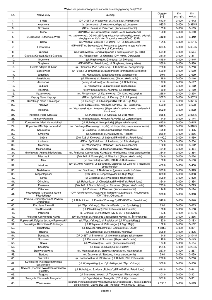 Wykaz ulic przeznaczonych do nadania numeracji gminnej /maj 2015/ Lp. Nazwa ulicy Przebieg Długość [m] Km początku Km końca 1. 3 Maja (DP 0425T ul. Wjazdowa); ul. 3 Maja; (ul. Piłsudskiego) 542.0 0+000 0+542 2. Akacjowa (ul. Jesionowa); ul. Akacjowa; (ślepe zakończenie) 925.5 0+000 0+925.5 3. Brzozowa (DP ul. Polna); ul. Brzozowa; (ślepe zakończenie) 105.0 0+000 0+105 4. Cicha 150.0 0+000 0+150 5. DG Końskie - Stadnicka Wola 412.0 0+000 0+412 6. Dolna 161.5 0+000 0+161.5 7. Folwarczna 684.5 0+000 0+684.5 8. Gliniana (DP 0455T ul. Browarna); ul. Cicha; (ślepe zakończenie) (ul. Izabelowska); DG 001235T; (granica miasta Końskie), miejski odcinek drogi gminnej Końskie - Stadnicka Wola /DG 001235T/ (ul. Wojska Polskiego); ul. Dolna; (DP ul. Spółdzielcza) (DP 0455T ul. Browarna); ul. Folwarczna; (granica miasta Końskie) + łącznik z ul. Kościeliską (ul. Piaskowa); ul. Gliniana; (granica z działką o nr ew. gr. 1836) 504.0 0+000 0+504 9. Granata /Księdza Józefa Granata/ (ul. Piłsudskiego); ul. Granata; (DW 749 ul. Odrowąża) 311.0 0+000 0+311 10. Gruntowa (ul. Piaskowa); ul. Gruntowa; (ul. Żwirowa) 445.0 0+000 0+445 11. Grzybowa (DP 0456T ul. Południowa); ul. Grzybowa; (tereny leśne) 360.0 0+000 0+360 12. Hubala /Majora Hubala/ (ul. Strażacka, Plac Kościuszki); ul. Hubala; (ul. Konopnickiej) 750.0 0+000 0+750 13. Izabelowska (DP 0455T ul. Browarna); ul. Izabelowska; (granica miasta Końskie) 580.0 0+000 0+580 14. Jagodowa (ul. Klonowa); ul. Jagodowa; (ślepe zakończenie) 99.0 0+000 0+099 15. Jarzębinowa (ul. Klonowa); ul. Jarzębinowa; (ślepe zakończenie) 146.0 0+000 0+146 16. Jesionowa (tereny działkowe); ul. Jesionowa; (ul. Robotnicza) 197.0 0+000 0+197 17. Jodłowa (ul. Klonowa); ul. Jodłowa; (ślepe zakończenie) 162.0 0+000 0+162 18. Kalinowa (tereny działkowe); ul. Kalinowa; (ul. Robotnicza) 160.0 0+000 0+160 19. Kazanowska (ul. Piłsudskiego); ul. Kazanowska; (DK 42 ul. Krakowska) 228.0 0+000 0+228 20. Kiepury /Jana Kiepury/ (DP ul. Spółdzielcza); ul. Kiepury; (DP ul. Lipowa) 367.5 0+000 0+367.5 21. Kilińskiego /Jana Kilińskiego/ (ul. Kiepury); ul. Kilińskiego; (DW 749 ul. 1-go Maja) 71.5 0+000 0+071.5 22. Klonowa 593.0 0+000 0+593 23. Kolejowa 202.0 0+000 0+202 24. Kołłątaja /Hugo Kołłątaja/ (ślepy początek); ul. Klonowa; (DP 0456T ul. Południowa) (ul. Warszawska); ul. Kolejowa; (ślepe zakończenie - koniec nawierzchni bitumicznej) (ul. Pułaskiego); ul. Kołłątaja; (ul. 3-go Maja) 335.5 0+000 0+335.5 25. Komuny Paryskiej (ul. Mickiewicza); ul. Komuny Paryskiej; (ul. Żeromskiego) 144.0 0+000 0+144 26. Konopnickiej /Marii Konopnickiej/ (ul. Hubala); ul. Konopnickiej; (ślepe zakończenie) 415.0 0+000 0+415 27. Kopernika /Mikołaja Kopernika/ (ul. Polskiego Czerwonego Krzyża); ul. Kopernika; (ślepe zakończenie) 310.5 0+000 0+310.5 28. Kościeliska (ul. Źródlana); ul. Kościeliska; (ślepe zakończenie) 495.0 0+000 0+495 29. Kwiatowa (ul. Olimpijska); ul. Kwiatowa; (ul. Różana) 286.0 0+000 0+286 30. Leśna (DW 728 ul. Kielecka); ul. Leśna; (DP 0456T ul. Południowa) 1 490.0 0+000 1+490 31. Łazienna (DP ul. Spółdzielcza); ul. Łazienna; (ul. Piłsudskiego) 204.0 0+000 0+204 32. Malinowa (ul. Wiśniowa); ul. Malinowa; (ślepe zakończenie) 122.0 0+000 0+122 33. Mechaniczna (ul. Odlewnicza); ul. Mechaniczna; (ul. Warszawska) 484.0 0+000 0+484 34. Mickiewicza /Adama Mickiewicza/ (ul. Polskiego Czerwonego Krzyża); ul. Mickiewicza; (ślepe zakończenie) 364.0 0+000 0+364 35. Mieszka I (DW 749 ul. Odrowąża); ul. Mieszka I; (ślepe zakończenie) 264.0 0+000 0+264 36. Miła 180.0 0+000 0+180 37. Mostowa 450.0 0+000 0+450 38. Nadstawna (ul. Strażacka); ul. Miła; (DK 42 ul. Krakowska) (DP ul. Armii Krajowej, ul. Lipowa); ul. Mostowa; (ul. Zielona) + łącznik na początku ulicy (ul. Gruntowa); ul. Nadstawna; (granica miasta Końskie) 923.0 0+000 0+923 39. Niepodległości (DW 728); ul. Niepodległości; (ul. 3-go Maja) 338.0 0+000 0+338 40. Nowa (ul. Źródlana); ul. Nowa; (ślepe zakończenie) 308.0 0+000 0+308 41. Olimpijska (ul. Robotnicza); ul. Olimpijska; (DP 0456T ul. Południowa) 354.0 0+000 0+354 42. Piaskowa (DW 749 ul. Staromłyńska); ul. Piaskowa; (ślepe zakończenie) 725.0 0+000 0+725 43. (ul. Żużlowa); ul. Piłkarska; (ślepe zakończenie) (DW 728 Rondo im. Nauczycieli Tajnego Nauczania); ul. Piłsudskiego; (DW 749 ul. Odrowąża) 114.0 0+000 0+114 908.0 0+000 0+908 (ul. Robotnicza); ul. Piwnika "Ponurego"; (DP 0456T ul. Południowa) 340.0 0+000 0+340 46. Piłkarska Piłsudskiego /Marszałka Józefa Piłsudskiego/ Piwnika ,,Ponurego" /Jana Piwnika ,,Ponurego"/ Plac Jana Pawła II (ul. Wyszyńskiego); Plac Jana Pawła II; (ul. Sykulskiego) 63.0 0+000 0+063 47. Plac Kościuszki (ul. Piłsudskiego); Plac Kościuszki; (ul. Granata) 138.0 0+000 0+138 48. Pocztowa (ul. Granata); ul. Pocztowa; (DK 42 ul. 16-go Stycznia) 187.5 0+000 0+187.5 49. Polskiego Czerwonego Krzyża (DP ul. Polna); ul. Polskiego Czerwonego Krzyża; (ul. Żeromskiego) 266.0 0+000 0+266 50. Popiełuszki /Księdza Jerzego Popiełuszki/ (ul. Wyszyńskiego); ul. Popiełuszki; (ul. Wyszyńskiego) 183.0 0+000 0+183 51. Pułaskiego /Kazimierza Pułaskiego/ (ul. Kołłątaja); ul. Pułaskiego; (ul. 3-go Maja) 162.0 0+000 0+162 52. Robotnicza (ul. Szwieca "Robota"); ul. Robotnicza; (ul. Leśna) 1 831.0 0+000 1+831 44. 45. 53. Różana (ul. Olimpijska); ul. Różana; (ul. Wiśniowa) 396.0 0+000 0+396 54. Słoneczna (DP 0455T ul. Browarna); ul. Słoneczna; (ślepe zakończenie) 124.5 0+000 0+124.5 55. Sosnowa (ul. Klonowa); ul. Sosnowa; (ślepe zakończenie) 149.0 0+000 0+149 56. Sowia (ul. Wiśniowa); ul. Sowia; (ślepe zakończenie) 134.0 0+000 0+134 57. Spokojna (ul. Miła); ul. Spokojna; (ul. Hubala) 224.5 0+000 0+224.5 58. Starowarszawska (ul. Warszawska); ul. Starowarszawska; (ul. Warszawska) 287.0 0+000 0+287 59. Startowa (ul. Żużlowa); ul. Startowa; (ślepe zakończenie) 59.0 0+000 0+059 60. (ul. Kazanowska); ul. Strażacka; (ul. Hubala, Plac Kości