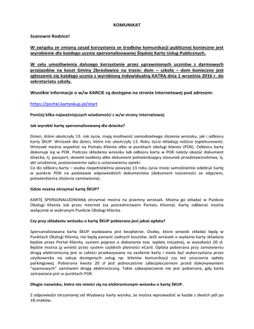 KOMUNIKAT Szanowni Rodzice! W związku ze zmianą zasad korzystania ze środków komunikacji publicznej konieczne jest wyrobienie dla każdego ucznia spersonalizowanej Śląskiej Karty Usług Publicznych. W celu umożliwienia dalszego korzystanie przez uprawnionych uczniów z darmowych przejazdów na koszt Gminy Zbrosławice na trasie: dom – szkoła – dom konieczne jest zgłoszenie się każdego ucznia z wyrobioną indywidualną KATRĄ dnia 1 września 2016 r. do sekretariatu szkoły. Wszelkie informacje o w/w KARCIE są dostępne na stronie internetowej pod adresem: https://portal.kartaskup.pl/start Poniżej kilka najważniejszych wiadomości z w/w strony internetowej Jak wyrobid kartę spersonalizowaną dla dziecka? Dzieci, które ukooczyły 13. rok życia, mają możliwośd samodzielnego złożenia wniosku, jak i odbioru karty ŚKUP. Wniosek dla dzieci, które nie ukooczyły 13. Roku życia składają rodzice (opiekunowie). Wniosek można wypełnid na Portalu Klienta albo w punktach obsługi klienta (POK). Odbioru karty dokonuje się w POK. Podczas składania wniosku lub odbioru karty w POK należy okazad dokument dziecka, tj. paszport, dowód osobisty albo dokument potwierdzający stosunek przedstawicielstwa, tj. akt urodzenia, postanowienie sądu o ustanowieniu opieki. Co do odbioru karty – osoba niepełnoletnia powyżej 13 roku życia może samodzielnie odebrad kartę w punkcie POK na podstawie odpowiednich dokumentów (dokument tożsamości ze zdjęciem, potwierdzenia złożenia zamówienia). Gdzie można otrzymad kartę ŚKUP? KARTĘ SPERSONALIZOWANĄ otrzymad można na pisemny wniosek. Można go składad w Punkcie Obsługi Klienta lub przez Internet (za pośrednictwem Portalu Klienta). Kartę odbierad można wyłącznie w wybranym Punkcie Obsługi Klienta. Czy przy składaniu wniosku o kartę ŚKUP pobierana jest jakaś opłata? Spersonalizowana karta ŚKUP wydawana jest bezpłatnie. Osoby, które wnioski składad będą w Punktach Obsługi Klienta, nie będą ponosid żadnych kosztów. Jeśli wniosek o wydanie karty składany będzie przez Portal Klienta, system poprosi o dokonanie tzw. wpłaty inicjalnej, w wysokości 20 zł. Będzie można ją wnieśd przez system szybkich płatności eCard. Opłata pobierana przy zamówieniu drogą elektroniczną jest w całości przekazywana na zasilenie karty i może byd wykorzystana przez użytkownika na zakup dostępnych usług np. biletów komunikacji czy też uiszczenia opłaty parkingowej. Pobierana kwota 20 zł jest jednocześnie zabezpieczeniem przed dokonywaniem "spamowych" zamówieo drogą elektroniczną. Takie zabezpieczenie nie jest pobierane, gdy karta zamawiana jest w punktach POK. Długie nazwisko, które nie mieści się na elektronicznym wniosku o kartę ŚKUP. Z odpowiedzi otrzymanej od Wydawcy karty wynika, że można wprowadzid w każde z dwóch pól po 18 znaków. Pola opisane są jako "Imię" i "Nazwisko" ale osoby z długim (np. dwuczłonowym) nazwiskiem mogą wpisywad pierwszy człon nazwiska w pole "Imię", a drugi człon w pole opisane jako "Nazwisko". Np.: w polu "Imię" wpisad "Janusz Madejczyk ", a w polu "Nazwisko" wpisad: " Zaborny". Na karcie nie są nadrukowane nazwy pól tylko ich zawartośd. Jakie zdjęcie dołączyd do wniosku o kartę? Zdjęcie musi mied format dowodowy, z wyraźnie widoczną twarzą. W POK zdjęcia wykonywane są bezpłatnie. Mogą byd również skanowane – np. z dowodu osobistego lub przyniesionej odbitki. Do wniosku składanego przez Portal Klienta zdjęcie należy dołączyd w formie elektronicznej – system podpowie, jakie warunki techniczne są wymagane. UWAGA! Spersonalizowana karta ŚKUP jednoznacznie identyfikuje użytkownika. Zdjęcie na niej musi byd wyraźne. Do wniosku nie mogą byd dołączane zdjęcia całej sylwetki, zbiorowe, elementów roślinnych lub zwierzęta. W Punkcie Obsługi Klienta takie zdjęcie nie zostanie przyjęte. Jeśli użytkownik zdecyduje się dołączyd taką fotografię do wniosku elektronicznego, zgodnie z regulaminem, karta może zostad nie wydana, a wpłacone podczas składania wniosku 20 zł przekazane zostanie bankowi jako odszkodowanie pokrywające koszty produkcji karty. Jeśli podczas kontroli okaże się, że zdjęcie nie spełnia wymogów jednoznacznej identyfikacji, tj. jest rozmazane, nie przedstawia wyraźnie twarzy, karta zostanie przez kontrolera zatrzymana. PUNKTY OBSŁUGI KLIENTA -najbliższe LP. MIASTO ADRES PARTNER 1. BYTOM ul. Nickla 121 Kolporter 2. BYTOM pl. T. Kościuszki (CH Agora) Kolporter 3. BYTOM ul. Rynek 22 4. GLIWICE ul. Czapli 24 Kolporter 5. GLIWICE ul. Pod Murami 4 Kolporter 6. GLIWICE ul. Zwycięstwa 4 7. PIEKARY ŚLĄSKIE ul. Śląska 1 Kolporter 8. PYSKOWICE ul. Wojska Polskiego 17 Kolporter 9. ZABRZE ul. Plutonowego Szkubacza 1 (CH M1) Kolporter 10. ZABRZE ul. Chopina 28 (Carrefour) Kolporter 11. ZABRZE ul. Wolności/Św.Barbary (Galeria Zabrze) Kolporter Godziny pracy POK ŚKUP ponsobota niedziela pt 08:00- 09:00nieczynne 18:00 15:00 09:00- 09:00nieczynne 19:00 15:00 08:00- 09:00nieczynne 18:00 15:00 08:00- 09:00nieczynne 18:00 15:00 08:00- 09:00nieczynne 18:00 15:00 08:00- 09:00nieczynne 18:00 15:00 08:00- 09:00nieczynne 18:00 15:00 08:00- 09:00nieczynne 18:00 15:00 09:00- 09:00nieczynne 19:00 15:00 08:00- 09:00nieczynne 18:00 15:00 09:00- 09:00nieczynne 19:00 15:00