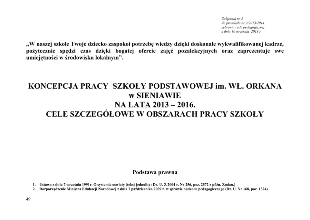 Załącznik nr 3 do protokołu nr 2/2013/2014 zebrania rady pedagogicznej z dnia 10 września 2013 r. „W naszej szkole Twoje dziecko zaspokoi potrzebę wiedzy dzięki doskonale wykwalifikowanej kadrze, pożytecznie spędzi czas dzięki bogatej ofercie zajęć pozalekcyjnych oraz zaprezentuje swe umiejętności w środowisku lokalnym”. KONCEPCJA PRACY SZKOŁY PODSTAWOWEJ im. WŁ. ORKANA w SIENIAWIE NA LATA 2013 – 2016. CELE SZCZEGÓŁOWE W OBSZARACH PRACY SZKOŁY Podstawa prawna 1. Ustawa z dnia 7 września 1991r. O systemie oświaty (tekst jednolity: Dz. U. Z 2004 r. Nr 256, poz. 2572 z późn. Zmian.) 2. Rozporządzenie Ministra Edukacji Narodowej z dnia 7 października 2009 r. w sprawie nadzoru pedagogicznego (Dz. U. Nr 168, poz. 1324) 49 Spis treści 1. Informacje o szkole 2.Misja szkoły 3.Wizja szkoły 4.Model absolwenta 5.Plan działań szkoły Działalność dydaktyczna, wychowawcza i opiekuńcza oraz inna działalność statutowa Procesy zachodzące w szkole Funkcjonowanie szkoły w środowisku lokalnym Zarządzanie szkołą 6 Ewaluacja realizacji planowanych działań Załącznik nr 1 - Analiza aktualnej sytuacji szkoły 50 Informacje o szkole Szkoła Podstawowa im. Wł. Orkana w Sieniawie 92 Sieniawa 34-721 Ilość oddziałów 7 Ilość uczniów 135 Oddział przedszkolny 1 Ilość dzieci 19 Liczba nauczycieli 16 o dyplomowanych 12 o mianowanych 2 o kontraktowych 2 Budynek szkoły ma dwie kondygnacje oraz piwnice i poddasze. Na pierwszej kondygnacji znajdują się szatnie, sala gimnastyczna, sala dla oddziału przedszkolnego, sale lekcyjne dla klas IV-VI, na drugiej kondygnacji jest pracownia informatyczna, sale lekcyjne dla klas I-III, biblioteka. Na każdym piętrze są toalety. Ponadto w szkole jest stołówka, automat z napojami oraz z artykułami spożywczymi nie zawierającymi konserwantów. Uczniowie korzystają z programów Szklanka mleka oraz Owoce w szkole. 51 2.MISJA SZKOŁY Dbamy o to, aby nasi uczniowie byli przygotowani do: Umieli: systematycznego i efektywnego uczenia się, kreowania otaczającego świata, przezwyciężania barier emocjonalnych, zwiększonej tolerancji w stosunku do ludzi, wykazywali się zaradnością, prezentowali postawę osób wrażliwych humanitarnie i ekologicznie. radzić sobie w trudnych sytuacjach, stosować wiedzę w praktyce, korzystać z różnych źródeł informacji, odróżniać dobro od zła. Realizowali: swoje marzenia i plany, rozwijali swoje zainteresowania i zdolności, stosowali właściwe zasady i wartości. Rodzice: wspomagali pracę szkoły w zakresie dydaktyczno- wychowawczo-opiekuńczym i profilaktycznym, uczestniczyli w życiu szkoły, byli współorganizatorami uroczystości i wycieczek szkolnych, byli zadowoleni z realizacji zadań szkoły. Nauczyciele: sprzyjali rozwojowi osobowości ucznia, rozwijali samodzielność, odpowiedzialność, kreatywność i przedsiębiorczość ucznia, wspierali uczniów ze specjalnymi potrzebami edukacyjnymi, współpracowali z rodzicami i instytucjami wspomagającymi pracę szkoły, doskonalili swoje umiejętności pedagogiczne, dbali o swój warsztat pracy. 52 WIZJA SZKOŁY Szkoła Podstawowa im. Wł. Orkana jest przyjazna i bezpieczna dla ucznia. Promuje zdrowy styl życia. Pielęgnuje i rozwija dziedzictwo kulturowe w regionie. Pamięta o przeszłości. Ma wypracowany ceremoniał i krzewi kult patrona. Panuje w niej klimat sprzyjający twórczej pracy uczniów i nauczycieli. Kształtuje postawę ucznia szanującego innych odpowiedzialnego i świadomie podejmującego decyzje w szybko zmieniającej się rzeczywistości. Uczeń jest motywowany do nauki. Chce i potrafi się uczyć. Szkoła wspiera uczniów o specjalnych potrzebach edukacyjnych. W działaniach na rzecz wszechstronnego rozwoju dziecka współpracuje z rodziną, instytucjami środowiskiem lokalnym. Koncepcja pracy szkoły jest modyfikowana, a podstawą do jej modyfikacji jest analiza potrzeb uczniów, potrzeb środowiska, wnioski z ewaluacji oraz zmiany w prawie oświatowym. MODEL ABSOLWENTA 53 jest przygotowany do nauki na dalszym etapie, potrafi się uczyć, korzysta z różnych źródeł informacji, posiadaną wiedzę wykorzystuje w praktyce, jest otwarty i komunikatywny, rozwija swoje zainteresowania i uzdolnienia, szanuje tradycję i kulturę swojego narodu, jest tolerancyjny wobec innych kultur, cechuje go wysoka kultura społeczna, dba o swój rozwój fizyczny, promuje zdrowy styl życia, jest wrażliwy na potrzeby innego człowieka, jest odpowiedzialny i potrafi przewidzieć konsekwencje swojego zachowania. PLAN DZIAŁAŃ SZKOŁY 1.DYDAKTYKA 1.1.Podniesienie standardu nauczania i uczenia się 1.2.Stworzenie w szkole optymalnych warunków do wszechstronnego i harmonijnego rozwoju ucznia. 1.3.Jasność i precyzyjność procesu dydaktycznego. 1.4.Ewaluacja realizacji podejmowanych działań dydaktycznych. 2.WYCHOWANIE I OPIEKA 2.1.Organizacja procesu wychowawczego zapewniająca kształtowanie aprobowanych społecznie postaw u dzieci. 2.2.Wdrażanie i ewaluacja Programu Profilaktyki . 2.3.Budowanie pozytywnego klimatu wokół szkoły. 3. ZARZĄDZANIE 3.1.Zapewnienie wykwalifikowanej i twórczej kadry pedagogicznej 3.2.Zapewnienie dobrej bazy dydaktycznej. 3.3.Promocja szkoły. 54 FORMY REALIZACJI CELÓW SZCZEGÓŁOWYCH OBSZAR DYDAKTYKA CEL STRATEGICZNY 1.1. Podniesienie standardu nauczania i uczenia się ZADANIA SZCZEGÓŁOWE 1) Monitorowanie realizacji podstawy programowej 2) Systematyczna diagnoza osiągnięć edukacyjnych 3) Praca z uczniem o specjalnych potrzebach edukacyjnych 55 FORMY REALIZACJI analizowanie zgodności podstawy programowej z programem i planem nauczania, b) formułowanie i realizacja tematów zajęć zgodnie z treścią podstawy programowej. a) a) b) c) d) badanie techniki czytania, organizowanie konkursów ortograficznych, systematyczne pisanie dyktand, systematyczne rozwiązywanie zadań tekstowych z matematyki, e) analiza wyników sprawdzianów wewnątrzszkolnych i zewnętrznych, f) okreś
