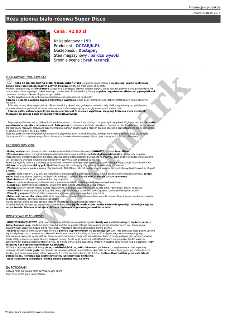 Informacje o produkcie Utworzono 04-03-2017 Róża pienna biało-różowa Super Disco Cena : 42,00 zł Nr katalogowy : 199 Producent : OCZARJK.PL Dostępność : Dostępny Stan magazynowy : bardzo wysoki Średnia ocena : brak recenzji PODSTAWOWE WIADOMOŚCI er m ar k Róża na paliku pienna biało-różowa Super Disco jest piękną cenną rośliną o oryginalnej i rzadko spotykanej barwie biało-różowych pachnących pełnych kwiatów. Kwiaty nie tracą uroku po deszczu. Kwiat tej odmiany róży jest dwubarwny, zaczyna się u podstawy płatków kolorem białym, a przy końcach płatków barwa przechodzi w róż do czerwieni. Kwiat w pełnym rozkwicie osiąga rozmiar około 12 cm średnicy. Kwiaty są pełne - wypełnione całkowicie i gęsto płatkami, osadzone zwykle po kilka na silnym mocnym pędzie Bardzo żywotna róża, stosunkowo mrozoodporna oraz mało podatna na choroby. Róża ta w sezonie powtarza dwu lub trzykrotnie kwitnienie. Liście gęste, ciemnozielone, dobrze kontrastujące z biało-różowymi kwiatami. Palik róży mocny, silny, wysokości ok. 120 cm i średnicy około 1 cm, grubiejący z wiekiem róży. Palik utrzyma różę bez podpierania, jednakże zaleca się podczas kwitnienia zastosowanie dodatkowej podpory ze względu na ciężar kwiatów i liści. Róża na paliku polecana jako krzew kolekcjonerski. Jest to roślina o wyjątkowej elegancji, która ma wielu wielbicieli! Niezwykle oryginalna barwa dwukolorowych płatków kwiatu! Proponujemy Państwu zakup pięknych róż wielkokwiatowych piennych szczepionych na pniu, zyskujących od długiego czasu już niezwykłą popularność w ogrodach przydomowych. Róże pienne to odmiany w kształcie drzewka szczepione na pniu (podkładce), inaczej zwane też drzewkami różanymi, otrzymane przez szczepienie odmian szlachetnych z różnych grup na specjalnie przygotowanym pędzie róży dzikiej tj. patyku o wysokości ok. 1-1,2 metra. Można je sadzić w małym ogrodzie lub uprawiać w pojemniku, na tarasie lub balkonie. Nadają się do zaakcentowania miejsca, na które chcemy zwrócić szczególną uwagę. Róże pienne jako drzewko stanowią najpiękniejszą oprócz róż pnących formę rośliny róży. SZCZEGÓŁOWY OPIS w at - Rodzaj rośliny: róża pienna na paliku wielkokwiatowa biało-różowa stanowiącej NOWOŚĆ odmiany Super Disco. - Zastosowanie: jeden z oryginalniejszych o ładnej budowie pąka współczesnych dwukolorowych kwiatów. Krzew róży na paliku niezbędny jest w każdym różanym ogrodzie. Różę na paliku można posadzić pojedynczo na trawniku, gdzie będzie wyglądał równie pięknie jak i posadzony w grupie innych róż lub niskich bylin zakrywających podstawę palika róży. Krzew szczególnie polecany na rabaty, przydomowe skwerki oraz miejsca reprezentacyjne, podkreślające wyjątkowość róży na paliku. Co ciekawe, ze względu na piękny pokrój pąków stosuje się często pędy róży piennej na kwiat cięty, do wazonu. - Wielkość: wysokość palika z koroną róży średnio do 100-120 cm. Wzrost pędów silny, w sezonie pędy potrafią wystrzelić nawet na długość 1 metra. - Kwiaty: duże średnicy 10-12 cm., po rozkwitnięciu dwukolorowe biało-różowe, w pąku lekko z odcieniem mocniejszej czerwieni, bardzo pełne. Zwykle osadzone pojedynczo lub po kilka na długich pędach. Zapach dość słaby ale bardzo przyjemny. - Kwitnienie: od połowy VI i powtarza kilka razy do jesieni. - Owoce: często zawiązuje szypułki owocowe w postaci mięsistych, małych gruszek wypełnionych nasionami. - Liście: duże, ciemnozielone, skórzaste. Ulistnienie gęste i długo utrzymujące się na krzewie. - Pokrój: wyniosły, korona krzewu dobrze rozgałęziona, w dobrych warunkach rosną bardzo silnie. Pędy grube, proste, kolczaste. - Stanowisko: słoneczne lub półcieniste. Nie zaleca się sadzenia pod drzewami. Unikać gorących, nieprzewiewnych stanowisk. - Warunki glebowe: Preferuje dobrze nawiezione wilgotne gleby ogrodowe bądź próchnicze. - Odporność na choroby i zimę: dość silnie odporna na choroby. Odporna na polskie warunki zimowe. Zaleca się na zimę kopczykowanie podstawy krzewów i okrywanie palika oraz korony. Należy odrywać dzikie odrosty pędowe czasami wyrastające na paliku poniżej korony róży. - Roślina wieloletnia, wymaga staranności i dbania w uprawie. Jej niezwykła uroda i obfite kwitnienie sprawiają, że hoduje się ją na całym świecie. Odmiana urzekająca pięknem, zachwyca od pierwszego rozwinięcia pąka! DODATKOWE WIADOMOŚCI - RÓŻE WIELKOKWIATOWE - jest to grupa róż najchętniej kupowanych do ogrodu. Kwiaty róż wielkokwiatowych są duże, pełne, o ładnej budowie pąka, osadzone pojedynczo lub po kilka na pędzie. Istnieje pełna paleta odmian jednobarwnych jak i liczna grupa dwubarwnych. Wszystkie nadają się na kwiat cięty. Przeważnie róże wielkokwiatowe pięknie pachną. - Na pniu szczepi się odmiany tworzące korony o pokroju wyprostowanym lub przewisającym (tzw. róże płaczące). Róże pienne uprawia się w małych ogrodach, a nawet na balkonach. Kupione w doniczkach rośliny można sadzić w ciągu całego sezonu wegetacyjnego. Pnie często przywiązuje się do palików. Silniejsze pnie rosną i utrzymują różę samodzielnie. Róże te zimują najlepiej gdy są kopczykowane (pędy należy ostrożnie przygiąć i korony obsypać ziemią). Zasila się je nawozem wieloskładnikowym lub gnojówką. Bardzo ważnym zabiegiem jest cięcie, przeprowadzane co roku, na wiosnę w marcu, po puszczeniu mrozów. Wszystkie pędy tnie się nad 3-5 oczkiem. Pędy skracamy nad oczkiem skierowanym na zewnątrz. - Róże szczepione posiadają kwiaty pełne, o wielkości 8-16 cm, lekko lub mocno pachnące (szczególnie niesamowicie pachną odmiany różowe). Liście gęste, początkowo czerwonawe, później ciemnozielone, skórzaste, błyszczące. Pędy gęste, przycinane jeszcze bardziej gęstnieją i mają więcej pąków. Wysokoś