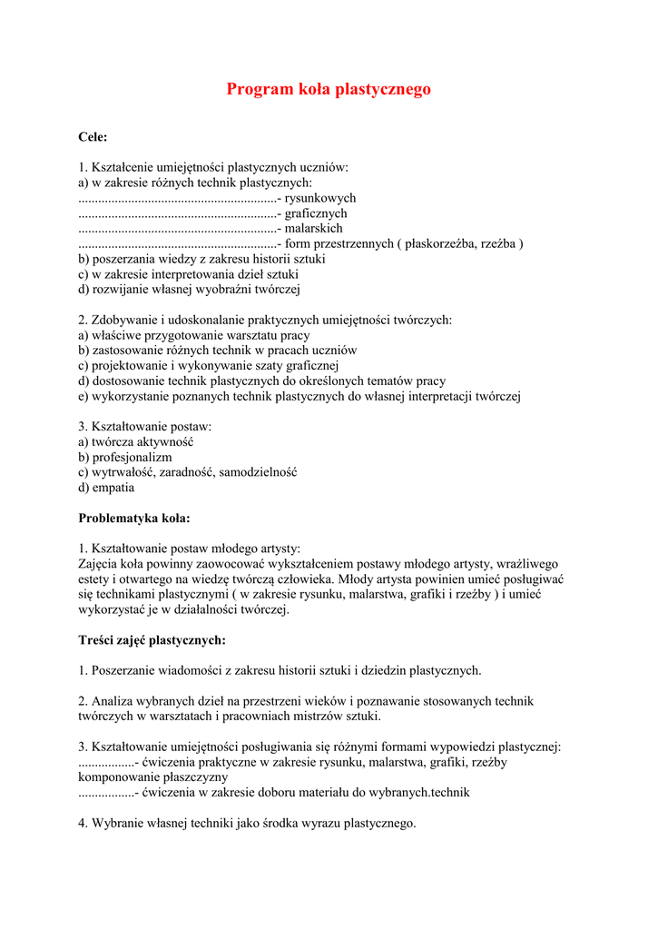 Program koła plastycznego Cele: 1. Kształcenie umiejętności plastycznych uczniów: a) w zakresie różnych technik plastycznych: ............................................................- rysunkowych ............................................................- graficznych ............................................................- malarskich ............................................................- form przestrzennych ( płaskorzeźba, rzeźba ) b) poszerzania wiedzy z zakresu historii sztuki c) w zakresie interpretowania dzieł sztuki d) rozwijanie własnej wyobraźni twórczej 2. Zdobywanie i udoskonalanie praktycznych umiejętności twórczych: a) właściwe przygotowanie warsztatu pracy b) zastosowanie różnych technik w pracach uczniów c) projektowanie i wykonywanie szaty graficznej d) dostosowanie technik plastycznych do określonych tematów pracy e) wykorzystanie poznanych technik plastycznych do własnej interpretacji twórczej 3. Kształtowanie postaw: a) twórcza aktywność b) profesjonalizm c) wytrwałość, zaradność, samodzielność d) empatia Problematyka koła: 1. Kształtowanie postaw młodego artysty: Zajęcia koła powinny zaowocować wykształceniem postawy młodego artysty, wrażliwego estety i otwartego na wiedzę twórczą człowieka. Młody artysta powinien umieć posługiwać się technikami plastycznymi ( w zakresie rysunku, malarstwa, grafiki i rzeźby ) i umieć wykorzystać je w działalności twórczej. Treści zajęć plastycznych: 1. Poszerzanie wiadomości z zakresu historii sztuki i dziedzin plastycznych. 2. Analiza wybranych dzieł na przestrzeni wieków i poznawanie stosowanych technik twórczych w warsztatach i pracowniach mistrzów sztuki. 3. Kształtowanie umiejętności posługiwania się różnymi formami wypowiedzi plastycznej: .................- ćwiczenia praktyczne w zakresie rysunku, malarstwa, grafiki, rzeźby komponowanie płaszczyzny .................- ćwiczenia w zakresie doboru materiału do wybranych.technik 4. Wybranie własnej techniki jako środka wyrazu plastycznego. 5. Zaprojektowanie dzieła plastycznego posługując się wybraną techniką. 6. Umiejętność współpracy w grupie przy tworzeniu pracy plastycznej. 7. Kształtowanie wrażliwości na otaczającą nas przyrodę. Tworzenie dzieła plastycznego: 1. Wybór tematyki i dobór odpowiedniej techniki wykonania pracy. 2. Dobór materiałów i właściwe zorganizowanie warsztatu pracy. 3. Wstępne koncepcje i szkice tematyczne. 4. Praktyczne wskazówki odnośnie zastosowania techniki plastycznej. 5. Unikanie plagiatu, umiejętność zastosowania własnej koncepcji. 6. Dążenie do stworzenia oryginalnego dzieła. Oczekiwane rezultaty: Na zajęciach koła uczeń powinien zdobyć następujące umiejętności: umiejętnie zakomponować płaszczyznę kartki dobrać odpowiednią technikę do wykonania pracy plastycznej umieć rozpoznać wybitne dzieła wielkich mistrzów na przestrzeni wieków posługiwać się podstawowymi pojęciami plastycznymi.