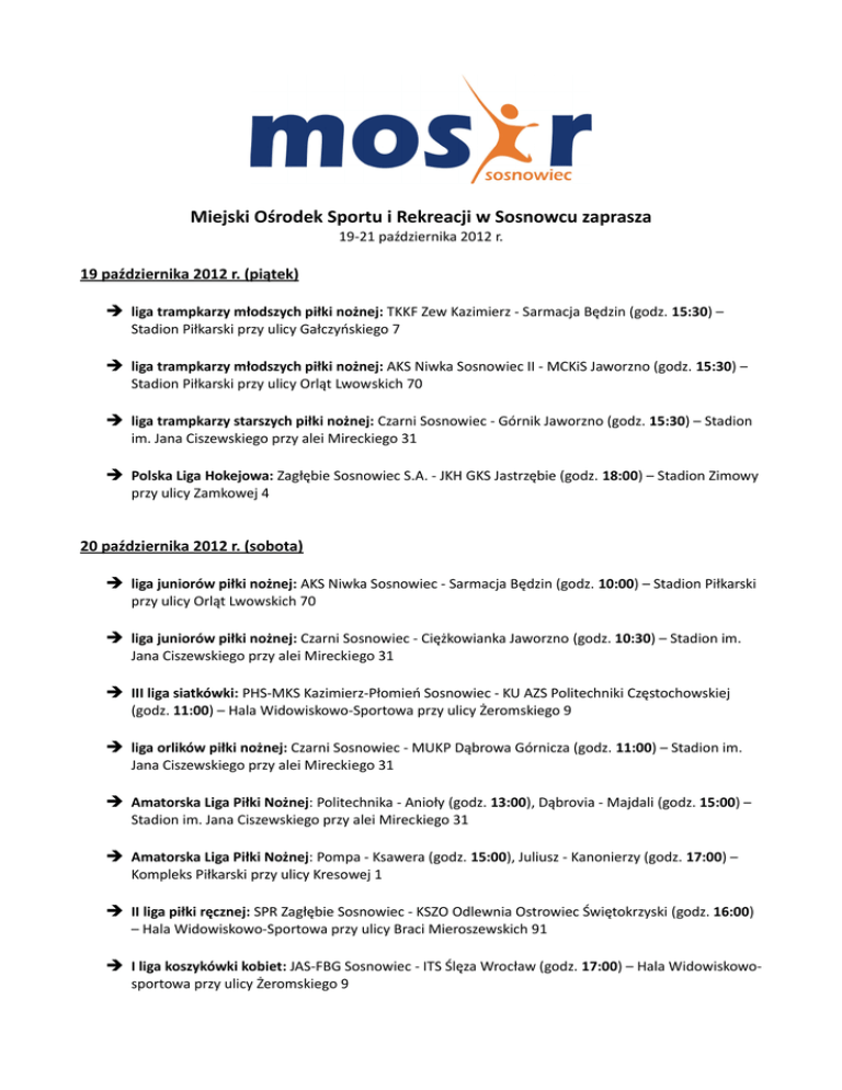 Miejski Ośrodek Sportu i Rekreacji w Sosnowcu zaprasza 19-21 października 2012 r. 19 października 2012 r. (piątek) ➔ liga trampkarzy młodszych piłki nożnej: TKKF Zew Kazimierz - Sarmacja Będzin (godz. 15:30) – Stadion Piłkarski przy ulicy Gałczyńskiego 7 ➔ liga trampkarzy młodszych piłki nożnej: AKS Niwka Sosnowiec II - MCKiS Jaworzno (godz. 15:30) – Stadion Piłkarski przy ulicy Orląt Lwowskich 70 ➔ liga trampkarzy starszych piłki nożnej: Czarni Sosnowiec - Górnik Jaworzno (godz. 15:30) – Stadion im. Jana Ciszewskiego przy alei Mireckiego 31 ➔ Polska Liga Hokejowa: Zagłębie Sosnowiec S.A. - JKH GKS Jastrzębie (godz. 18:00) – Stadion Zimowy przy ulicy Zamkowej 4 20 października 2012 r. (sobota) ➔ liga juniorów piłki nożnej: AKS Niwka Sosnowiec - Sarmacja Będzin (godz. 10:00) – Stadion Piłkarski przy ulicy Orląt Lwowskich 70 ➔ liga juniorów piłki nożnej: Czarni Sosnowiec - Ciężkowianka Jaworzno (godz. 10:30) – Stadion im. Jana Ciszewskiego przy alei Mireckiego 31 ➔ III liga siatkówki: PHS-MKS Kazimierz-Płomień Sosnowiec - KU AZS Politechniki Częstochowskiej (godz. 11:00) – Hala Widowiskowo-Sportowa przy ulicy Żeromskiego 9 ➔ liga orlików piłki nożnej: Czarni Sosnowiec - MUKP Dąbrowa Górnicza (godz. 11:00) – Stadion im. Jana Ciszewskiego przy alei Mireckiego 31 ➔ Amatorska Liga Piłki Nożnej: Politechnika - Anioły (godz. 13:00), Dąbrovia - Majdali (godz. 15:00) – Stadion im. Jana Ciszewskiego przy alei Mireckiego 31 ➔ Amatorska Liga Piłki Nożnej: Pompa - Ksawera (godz. 15:00), Juliusz - Kanonierzy (godz. 17:00) – Kompleks Piłkarski przy ulicy Kresowej 1 ➔ II liga piłki ręcznej: SPR Zagłębie Sosnowiec - KSZO Odlewnia Ostrowiec Świętokrzyski (godz. 16:00) – Hala Widowiskowo-Sportowa przy ulicy Braci Mieroszewskich 91 ➔ I liga koszykówki kobiet: JAS-FBG Sosnowiec - ITS Ślęza Wrocław (godz. 17:00) – Hala Widowiskowosportowa przy ulicy Żeromskiego 9 ➔ liga żaków starszych hokeja na lodzie: Zagłębie Sosnowiec S.A. I - UKS MOSM BYTOM (godz. 14:00) – Stadion Zimowy przy ulicy Zamkowej 4 ➔ liga juniorów hokeja na lodzie: Szkoła Mistrzostwa Sportowego (18) - UKH Dębica (godz. 17:00) – Stadion Zimowy przy ulicy Zamkowej 4 ➔ I liga hokeja na lodzie: Szkoła Mistrzostwa Sportowego (20) - KH Gdańsk S.A. (godz. 20:00) – Stadion Zimowy przy ulicy Zamkowej 4 21 października 2012 r., niedziela ➔ Amatorska Liga Piłki Nożnej: Lechia - CaboSteel (godz. 13:00), Pogoń - Dynamo (godz. 15:00) – Stadion im. Jana Ciszewskiego przy alei Mireckiego 31 ➔ Amatorska Liga Piłki Nożnej: Centrum - Twardowice (godz. 19:00) – Kompleks Piłkarski przy ulicy Kresowej 1 ➔ liga juniorów hokeja na lodzie: Szkoła Mistrzostwa Sportowego (18) - UKH Dębica (godz. 7:30) – Stadion Zimowy przy ulicy Zamkowej 4 ➔ I liga hokeja na lodzie: Szkoła Mistrzostwa Sportowego (20) - KH Gdańsk S.A. (godz. 14:00) – Stadion Zimowy przy ulicy Zamkowej 4 ➔ liga żaków młodszych hokeja na lodzie: Zagłębie Sosnowiec S.A. - MOSM Tychy (godz. 17:00) – Stadion Zimowy przy ulicy Zamkowej 4