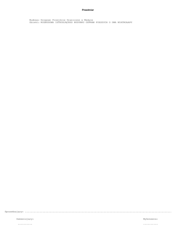 Przedmiar Budowa: Drogowe Przejście Graniczne w Medyce Obiekt: ROZBUDOWA ISTNIEJĄCEGO BUDYNKU ODPRAW PIESZYCH O DWA WIATROŁAPY Sprawdzający: ........................................................................................................ Zamawiający: Wykonawca: .......... .......... Drogowe Przejscie Graniczne w Medyce Zuzia (C) DataComp 1994-2006(lic. 12539) strona nr: 2 Przedmiar Podstawa nakładu, opis pozycji, wyliczenie ilości robót 1 ELEMENT 1.1 KNR 403/1004/11 Mechaniczne przebijanie otworów w ścianach lub stropach betonowych, długość przebicia do 30·cm, rura Fi do 25·mm 1.2 KNNR 5/102/2 Rury winidurowe karbowane (giętkie) układane p.t. w gotowych bruzdach, podłoże betonowe, do Fi 23·mm 1.3 KNR 401/429/6 Rozbiórki podsufitek z płyt pilśniowych stropów drewnianych - przez analogię, rozebranie sufitów podwieszanych kasetonowych 1.4 KNR 401/429/6 Rozbiórki podsufitek z płyt pilśniowych stropów drewnianych - przez analogię, ponowny montaż sufitów podwieszanych kasetonowych R= 1,500 M= 1,000 S= 1,000 1.5 KNNR 5/1105/1 Drabinki kablowe, przykręcenie do gotowych otworów, szerokość 200·mm - korytko perforowane K 100 1.6 KNNR 5/1101/2 Konstrukcje wsporcze przykręcane, masa do 1·kg, 2 mocowania - wspornik korytka perforowanego K 100 1.7 KNNR 5/209/1 Przewody kabelkowe układane w gotowych korytkach i na drabinkach, bez mocowania, przekrój do 7,5·mm2 -Przewód YDY 450/750V 3x1,5˙mm2 (zasilanie punktów świetlnych) 1.8 KNNR 5/209/1 Przewody kabelkowe układane w gotowych korytkach i na drabinkach, bez mocowania, przekrój do 7,5·mm2- Przewód YDY 450/750V 3x1,5˙mm2 (zasilanie kamer, kamere zewnętrzna i wewnętrzna zasilona z 1 obwodu) 1.9 KNNR 5/407/3 (1) Montaż w rozdzielnicach rozłącznika 2-biegunowego - wyłacznik różnicowoprądowy z członem nadmiarowodprądowym (25A/30mA, B16A) 1.10 KNR AT-14/102/1 Układanie poziomego okablowania strukturalnego, kabel miedziany Kabel F/UTP kat.6 (kable do kamer) 1.11 KNR AT-14/102/1 Układanie poziomego okablowania strukturalnego, kabel miedziany Kabel F/UTP kat.6 (kable między szafami) 1.12 KNR AT-14/105/2 Montaż złącza RJ45 na skrętce 4-parowej ekranowanej STP/FTP (montaż kabli z szafach w portach RJ45 paneli oraz przy kamerach) 1.13 Kalkulacja indywidualna Montaż konwerterów pasywnych FTP na BNC 1.14 Kalkulacja indywidualna Montaż medikonwerterów aktywnych FTP na światłowód z zasilaczem (konwertery między szafami w sąsiednich budynkach) 1.15 KNNR 5/209/1 Przewody kabelkowe układane w gotowych korytkach i na drabinkach, bez mocowania, przekrój do 7,5·mm2- Przewód OMY 2x1 mm2 (zasilanie rygli) 1.16 KNR 508/226/4 Montaż listew ściennych z PVC na ścianach i sufitach, mocowanie do kołków rozporowych na beton- Koryto plastikowe 20x10 z pokrywą kompletne 1.17 KNR AL-01/501/1 Montaż wewnętrznej kamery TVU - kamera kopułkowa wandaloodporna wewnetrzna/zewnetrzna analogowa 1.18 KNR AL-01/501/2 Montaż zewnętrznej kamery TVU - kamera zewnetrzna analogowa w obudowie 1.19 KNNR 5/502/2 Oprawy oświetleniowe LED do suitu rastrowego 60x60 1.20 KNR 508/304/5 Montaż czujników oświetlenia z podłączeniem przewodów do2.5'mm2, przewody w powłoce polwinitowej 1.21 KNNR 5/406/1 Aparaty elektryczne, masa do 2,5·kg - montaż rygla blokującego w drzwiach 1.22 KNNR 5/406/1 Aparaty elektryczne, masa do 2,5·kg - Zasilacz 12 VDC zasilający rygiel 1.23 KNNR 5/302/1 Puszki instalacyjne podtynkowe, Fi·60, pojedyncze 1.24 KNNR 5/306/2 (1) Łącznik pt 10A, 250V 1-biegunowy nf 501 blokujący rygiel 1.25 KNNR 5/1301/1 Sprawdzenie i pomiar obwodu elektrycznego nn, obwód 1-fazowy 1.26 KNNR 5/1303/1 Pomiar rezystancji izolacji instalacji elektrycznej, obwód 1-fazowy, pomiar pierwszy 1.27 KNNR 5/1303/3 Pomiar rezystancji izolacji instalacji elektrycznej, obwód 3-fazowy, pomiar pierwszy 1.28 KNNR 5/1305/1 Sprawdzenie samoczynnego wyłączania zasilania, działanie wyłącznika różnicowoprądowego, próba pierwsza 1.29 KNNR 5/1305/2 Sprawdzenie samoczynnego wyłączania zasilania, działanie wyłącznika różnicowoprądowego, próba każda następna 1.30 Kalkulacja indywidualna uruchomienie i sprawdzenie działania systemu CCTV Ilość Krot. Jedn. 9 otwór 5 m 36 m2 36 m2 16 m 14 szt 60 m 64 m 4 szt 66 m 30 m 12 6 szt szt 6 szt 35 m 12 m 2 szt 1 szt 2 kpl 2 szt 2 szt 2 szt 2 szt 2 szt 4 pomiar 1 pomiar 3 pomiar 1 próba 3 1 próba kpl
