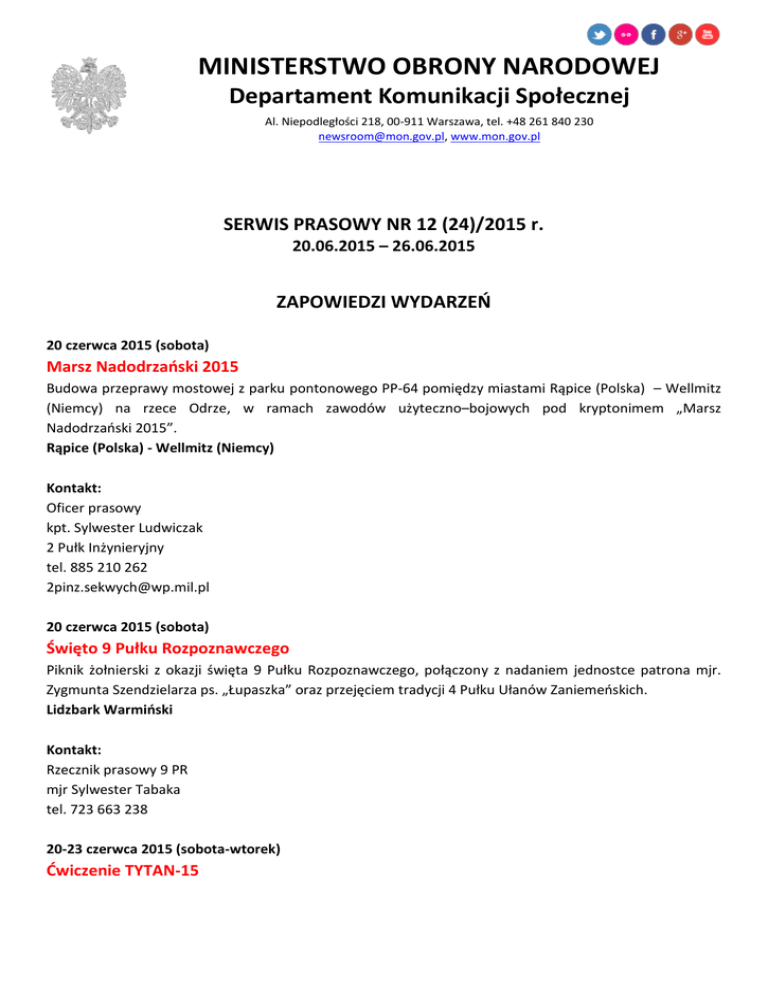 MINISTERSTWO OBRONY NARODOWEJ Departament Komunikacji Społecznej Al. Niepodległości 218, 00-911 Warszawa, tel. +48 261 840 230 [email protected], www.mon.gov.pl SERWIS PRASOWY NR 12 (24)/2015 r. 20.06.2015 – 26.06.2015 ZAPOWIEDZI WYDARZEŃ 20 czerwca 2015 (sobota) Marsz Nadodrzański 2015 Budowa przeprawy mostowej z parku pontonowego PP-64 pomiędzy miastami Rąpice (Polska) – Wellmitz (Niemcy) na rzece Odrze, w ramach zawodów użyteczno–bojowych pod kryptonimem „Marsz Nadodrzański 2015”. Rąpice (Polska) - Wellmitz (Niemcy) Kontakt: Oficer prasowy kpt. Sylwester Ludwiczak 2 Pułk Inżynieryjny tel. 885 210 262 [email protected] 20 czerwca 2015 (sobota) Święto 9 Pułku Rozpoznawczego Piknik żołnierski z okazji święta 9 Pułku Rozpoznawczego, połączony z nadaniem jednostce patrona mjr. Zygmunta Szendzielarza ps. „Łupaszka” oraz przejęciem tradycji 4 Pułku Ułanów Zaniemeńskich. Lidzbark Warmiński Kontakt: Rzecznik prasowy 9 PR mjr Sylwester Tabaka tel. 723 663 238 20-23 czerwca 2015 (sobota-wtorek) Ćwiczenie TYTAN-15 Certyfikacja narodowa Grupy Zadaniowej Obrony Przed Bronią Masowego Rażenia podczas ćwiczenia TYTAN-15. CSWL Drawsko Kontakt: kpt. Paweł Karpiński tel. 606744671 22 czerwca 2015 (poniedziałek) Święto Dowództwa Generalnego Rodzajów Sił Zbrojnych W ramach święta Dowództwa Generalnego Rodzajów Sił Zbrojnych zaplanowano m.in. uroczysty apel z udziałem wojskowej asysty honorowej, przelot samolotów TS-11 ISKRA, defiladę pododdziałów oraz uroczyste otwarcie wystawy fotograficznej „Siły Zbrojne RP w obiektywie”. Obchody zakończy festyn żołnierski, podczas którego zaprezentują się amatorskie zespoły artystyczne wszystkich rodzajów SZ RP. Warszawa Kontakt: Rzecznik prasowy DGRSZ ppłk Artur Goławski tel. 519 038 593, 261 825 060 e-mail: [email protected] 22-23 czerwca 2015 (poniedziałek-wtorek) Szkolenie górskie Szkolenie górskie plutonu rozpoznawczego 22 Batalionu Piechoty Górskiej na zaporze w Solinie. Solina Kontakt: kpt. Konrad Radzik tel. kom. 691 677 515 mjr M. Dusza tel. kom. 501504459 22-26 czerwca 2015 (poniedziałek-piątek) Egzaminy do szkoły Egzaminy wstępne do Szkoły Podoficerskiej Wojsk Lądowych w Poznaniu dla żołnierzy korpusu szeregowych zawodowych. CSWLąd Poznań, ul. Wojska Polskiego 86 Kontakt: Rzecznik prasowy CSWLąd chor. Marcin Szubert tel. 663 663 083; 261 575 349 [email protected] 25 czerwca 2015 (czwartek) Uroczystość przekazania dowodzenia w Eurokorpusie Generał broni Alfredo Ramírez z hiszpańskich wojsk lądowych przejmie dowodzenie Eurokorpusem od belgijskiego generała broni Guy’a Buchsenschmidt’a. Więcej… Strasburg, dzielnica Aubert-de-Vincelles, Francja Kontakt: ppłk Angel Brufau tel. +33 (0) 683 698 111 e-mail: [email protected] e-mail: [email protected] fax. +33 (0) 3 88 43 20 05 25 czerwca 2015 (czwartek), godz.: 11.00 Święto 10 OBL 16. rocznica powstania 10 Opolskiej Brygady Logistycznej połączona z uroczystą zbiórką pododdziałów na placu apelowym. W programie przewidziano szereg atrakcji m.in.: występ Orkiestry Wojskowej w Żaganiu, pokaz musztry paradnej, pokaz sprzętu wojskowego i wyposażenia 10 Brygady Logistycznej, pokaz sprzętu militarnego Muzeum Historii i Uzbrojenia 10 Sudeckiej Dywizji Zmechanizowanej, zwiedzanie sali tradycji, spotkanie z weteranami misji wojskowych poza granicami kraju, zawody „STRONGMAN 2015”oraz poczęstunek tradycyjną wojskową grochówką. Opole Kontakt: Rzecznik prasowy ppor. Piotr Płuciennik tel. 261 62 56 11, kom. 669 924 221 [email protected] 25 czerwca 2015 (czwartek) Święto 14 DAR Żołnierze i pracownicy wojska wezmą udział w święcie 14 Dywizjonu Artylerii Samobieżnej. Jarosław-Rynek Kontakt: kpt. Konrad Radzik tel. kom. 691 677 515 25-28 czerwca 2015 (czwartek-niedziela), Festiwal orkiestr wojskowych – Warszawa 2015 W programie festiwalu występy i pokazy musztry paradnej ponad czterystu artystów w niezwykłej rewii na jednej scenie. Każdego dnia zaplanowano koncerty z udziałem orkiestr. Więcej… Warszawa, plac Zamkowy, plac Marszałka Józefa Piłsudskiego, Centralny Ośrodek Sportu „TORWAR” – ul. Łazienkowska 6 a Kontakt: Rzecznik prasowy DGW. ppłk Joanna Klejszmit-Bodziuch e-mail: [email protected] tel. 261 879 102 tel. kom.: 721 810 749 25-30 czerwca 2015 (czwartek-wtorek) ŻBIK-15 Ćwiczenie taktyczne z wojskami pododdziałów 12 Brygady Zmechanizowanej ŻBIK-15. W ćwiczeniu udział wezmą pododdziały wydzielone do składu Wyszehradzkiej Grupy Bojowej Unii Europejskiej (GB UE V4). CSWL Drawsko Kontakt: Oficer prasowy kpt. Janusz Błaszczak tel. 727 012 658 [email protected] [email protected] 26 czerwca 2015 (piątek) Sztandar dla Dowództwa 16 PDZ Żołnierze i pracownicy wojska wezmą udział w uroczystości nadania sztandaru Dowództwu 16 Pomorskiej Dywizji Zmechanizowanej. Elbląg Kontakt: Rzecznik prasowy 16 PBZ. mjr Zbigniew Tuszyński tel. 55 230 22 3, 693 168 261, [email protected] 26 czerwca 2015 (piątek) Święto 25 BKP Żołnierze i pracownicy wojska wezmą udział w święcie 25 Brygady Kawalerii Powietrznej, które połączono z obchodami święta Wojsk Aeromobilnych oraz święta 31 Wojskowego Oddziału Gospodarczego. Więcej… Tomaszów Mazowiecki Kontakt: Oficer prasowy kpt. Tomasz Pierzak 25 Brygada Kawalerii Powietrznej tel. 601 066 829 [email protected] KRONIKA 13 czerwca 2015 (sobota) Nagrodzeni za wiedzę historyczną - Przygotowując się do konkursu i olimpiady, poświęciliście wiele godzin i wiele wysiłku, aby wyjść poza skrótowe uogólnienia podręczników i zbliżyć się do wydarzeń, które miały miejsce przed wiekami powiedział wiceminister Maciej Jankowski podczas gali finałowej konkursu historycznego, odbywającej się na Zamku Królewskim. Więcej... 15 czerwca 2015 (poniedziałek) Sekretarz Sił Morskich USA z wizytą w MON Relacje bilateralne polsko-amerykańskie, bezpieczeństwo Europy i Polski oraz obecna sytuacja w rejonie Mo
