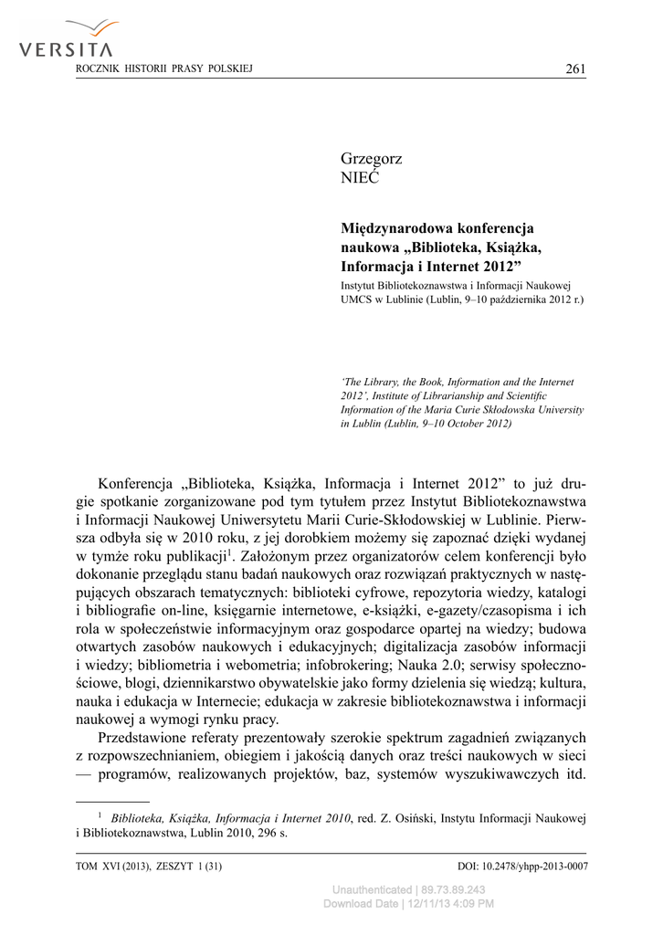 261 ROCZNIK HISTORII PRASY POLSKIEJ Grzegorz NIEĆ Międzynarodowa konferencja naukowa „Biblioteka, Książka, Informacja i Internet 2012” Instytut Bibliotekoznawstwa i Informacji Naukowej UMCS w Lublinie (Lublin, 9–10 października 2012 r.) ʻThe Library, the Book, Information and the Internet 2012’, Institute of Librarianship and Scientific Information of the Maria Curie Skłodowska University in Lublin (Lublin, 9–10 October 2012) Konferencja „Biblioteka, Książka, Informacja i Internet 2012” to już drugie spotkanie zorganizowane pod tym tytułem przez Instytut Bibliotekoznawstwa i Informacji Naukowej Uniwersytetu Marii Curie-Skłodowskiej w Lublinie. Pierwsza odbyła się w 2010 roku, z jej dorobkiem możemy się zapoznać dzięki wydanej w tymże roku publikacji1. Założonym przez organizatorów celem konferencji było dokonanie przeglądu stanu badań naukowych oraz rozwiązań praktycznych w następujących obszarach tematycznych: biblioteki cyfrowe, repozytoria wiedzy, katalogi i bibliografie on-line, księgarnie internetowe, e-książki, e-gazety/czasopisma i ich rola w społeczeństwie informacyjnym oraz gospodarce opartej na wiedzy; budowa otwartych zasobów naukowych i edukacyjnych; digitalizacja zasobów informacji i wiedzy; bibliometria i webometria; infobrokering; Nauka 2.0; serwisy społecznościowe, blogi, dziennikarstwo obywatelskie jako formy dzielenia się wiedzą; kultura, nauka i edukacja w Internecie; edukacja w zakresie bibliotekoznawstwa i informacji naukowej a wymogi rynku pracy. Przedstawione referaty prezentowały szerokie spektrum zagadnień związanych z rozpowszechnianiem, obiegiem i jakością danych oraz treści naukowych w sieci — programów, realizowanych projektów, baz, systemów wyszukiwawczych itd. 1 Biblioteka, Książka, Informacja i Internet 2010, red. Z. Osiński, Instytu Informacji Naukowej i Bibliotekoznawstwa, Lublin 2010, 296 s. TOM XVI (2013), ZESZYT 1 (31) DOI: 10.2478/yhpp-2013-0007 Unauthenticated | 89.73.89.243 Download Date | 12/11/13 4:09 PM 262 KRONIKA (m.in. Teresa Święckowska, Modele Open Access i ich realizacja w Polsce; Zbigniew Osiński, Otwarte zasoby edukacyjne w języku polskim — idea i praktyka; Wanda A. Ciszewska, Elektroniczny warsztat historyka książki; Magdalena Fedorczyk-Falis, Szkolenia dziedzinowe on-line w BUW — projekty i realizacje; Małgorzata Jaskowska, Kryteria jakości internetowych źródeł informacji o zdrowiu z perspektywy użytkowników). Sporo uwagi, także podczas dyskusji, poświęcono czasopismom internetowym i repozytoriom, ukazując zarówno uwarunkowania technologiczne, jak i prawne, a także konkretne przykłady tego rodzaju przedsięwzięć (Marzena Kowalska, Socjologiczne czasopisma naukowe w społeczeństwie informacyjnym i gospodarce opartej na wiedzy; Małgorzata Rychlik, Co repozytorium instytucjonalne oferuje swojej społeczności naukowej — na przykładzie repozytorium AMUR (Adam Mickiewicz University Repository) oraz repozytoriów na świecie; Ewa Piotrowska, Repozytoria naukowe i czasopisma otwarte w krajach arabskich). Kilka wystąpień dotyczyło bezpośrednio praktyki bibliotecznej w zakresie dygitalizacji i udostępniania zasobów elektronicznych, jak i księgarstwa (Katerina Kamradkova, Give old books a new life! (Possibilities of joining a European Library Network and fund raising for digitization); Agnieszka Łakomy, Dystrybucja książek i czasopism elektronicznych w bibliotekach publicznych — wybrane przykłady; Piotr Szeligowski, Bibliotekarz wśród współczesnych źródeł komunikacji; Grzegorz Budny, Blog o bazach danych jako przykład komunikacji skierowanej do czytelników i pracowników biblioteki; Lidia M. Jarska, Jeszcze inspiracja czy już plagiat? Korzystanie z cudzej twórczości w nowych realiach pracy bibliotekarza; Bożena Łazowska, Zadania Centralnej Biblioteki Statystycznej im. Stefana Szulca w zakresie budowy społeczeństwa informacyjnego; Iwona Mielczarek, Polub, tweetnij, przepnij… — Web 2.0 w promocji bibliotek; Grzegorz Nieć, Internet jako ogniwo rynku wtórnego książki w Polsce). Na osobne potraktowanie zasługują wystąpienia traktujące o bibliotekach specjalnych i ich użytkownikach (Dorota Bednarczyk, Danuta Murzynowska, Informacja cyfrowa dostępna dla osób z dysfunkcją wzroku; Iwona Cichoń, Funkcje i wyzwania biblioteki akademickiej wobec czytelnika niepełnosprawnego). Poruszono również problemy związane z kształceniem bibliotekarzy oraz aktywnością naukową i organizacyjną środowiska, rozwojem i perspektywami infobrokerstwa (Mariusz Jarocki, Open Source w zarządzaniu informacją — propozycja przedmiotu z zakresu bibliotekoznawstwa i informacji naukowej; Małgorzata Kowalska, Tytuły wystąpień konferencyjnych z zakresu bibliologii jako przejaw aktualnych kierunków rozwoju tematycznego dyscypliny; Renata Malesa, Wizerunek i umiejętności współczesnego bibliotekarza (w opinii studentów informacji naukowej i bibliotekoznawstwa UMCS w Lublinie); Milena M. Śliwińska, Biblioteka bez ścian, nauka bez granic; Małgorzata Stanula, Infobrokering edukacyjny; Sylwia Borkowicz, Katarzyna Cyran, Bibliotekarz brokerem informacji — zawód z przyszłością). ROCZNIK HISTORII PRASY POLSKIEJ Unauthenticated | 89.73.89.243 Download Date | 12/11/13 4:09 PM Grzegorz Nieć KONFERENCJA „BIBLIOTEKA, KSIĄŻKA, INFORMACJA I INTERNET 2012” 263 Kilka wystąpień poświęconych było roli Internetu w edukacji, prelegenci przedstawili swoje doświadczenia w tym obszarze, jak również propozycje, przykłady realizacji konkretnych tematów z wykorzystaniem zasobów znajdujących się w sieci (Anna Zawadzka, Khan Academy — wirtualna szkoła; Agnieszka Pawelec, Szkolne strony www — sposobem na promowanie czytelnictwa wśród uczniów gimnazjum [na przykładzie analizy szkolnych stron internetowych wybranych lubelskich gimnazjów]; Agata Poręba, Mechanizm wiki jako narzędzie służące idei konstruktywizmu 