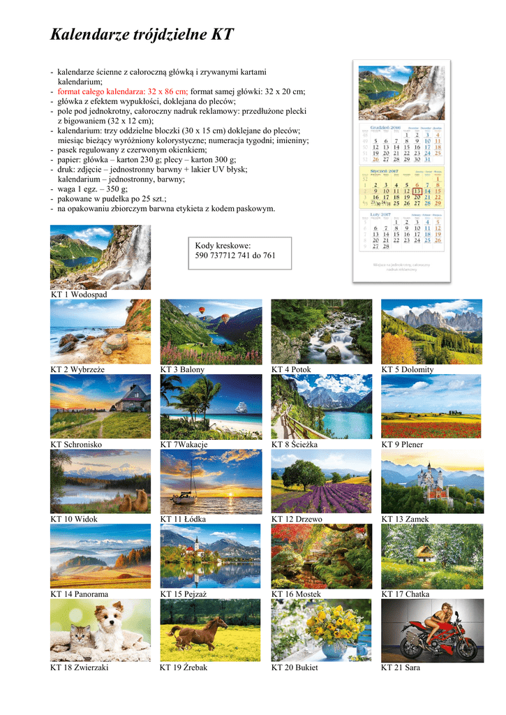 Kalendarze trójdzielne KT - kalendarze ścienne z całoroczną główką i zrywanymi kartami kalendarium; - format całego kalendarza: 32 x 86 cm; format samej główki: 32 x 20 cm; - główka z efektem wypukłości, doklejana do pleców; - pole pod jednokrotny, całoroczny nadruk reklamowy: przedłużone plecki z bigowaniem (32 x 12 cm); - kalendarium: trzy oddzielne bloczki (30 x 15 cm) doklejane do pleców; miesiąc bieżący wyróżniony kolorystyczne; numeracja tygodni; imieniny; - pasek regulowany z czerwonym okienkiem; - papier: główka – karton 230 g; plecy – karton 300 g; - druk: zdjęcie – jednostronny barwny + lakier UV błysk; kalendarium – jednostronny, barwny; - waga 1 egz. – 350 g; - pakowane w pudełka po 25 szt.; - na opakowaniu zbiorczym barwna etykieta z kodem paskowym. Kody kreskowe: 590 737712 741 do 761 KT 1 Wodospad KT 2 Wybrzeże KT 3 Balony KT 4 Potok KT 5 Dolomity KT Schronisko KT 7Wakacje KT 8 Ścieżka KT 9 Plener KT 10 Widok KT 11 Łódka KT 12 Drzewo KT 13 Zamek KT 14 Panorama KT 15 Pejzaż KT 16 Mostek KT 17 Chatka KT 18 Zwierzaki KT 19 Źrebak KT 20 Bukiet KT 21 Sara