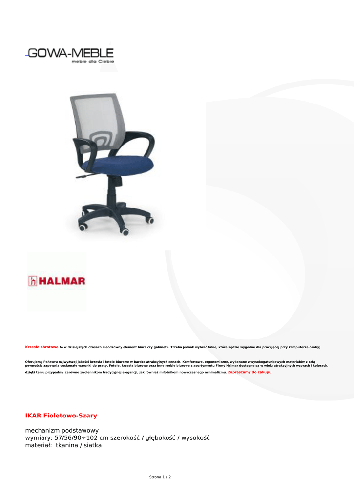 Krzesło obrotowe to w dzisiejszych czasach nieodzowny element biura czy gabinetu. Trzeba jednak wybrać takie, które będzie wygodne dla pracującej przy komputerze osoby; Oferujemy Państwu najwyższej jakości krzesła i fotele biurowe w bardzo atrakcyjnych cenach. Komfortowe, ergonomiczne, wykonane z wysokogatunkowych materiałów z całą pewnością zapewnią doskonałe warunki do pracy. Fotele, krzesła biurowe oraz inne meble biurowe z asortymentu Firmy Halmar dostępne są w wielu atrakcyjnych wzorach i kolorach, dzięki temu przypadną zarówno zwolennikom tradycyjnej elegancji, jak również miłośnikom nowoczesnego minimalizmu. Zapraszamy do zakupu IKAR Fioletowo-Szary mechanizm podstawowy wymiary: 57/56/90÷102 cm szerokość / głębokość / wysokość materiał: tkanina / siatka Strona 1 z 2 kolor: fioletowo-szary Produkt fabrycznie nowy do samodzielnego montażu. GWARANCJA 24 MIESIĄCE!!! by podczas składania zamówienia w polu "informacje dodatkowe" podać kolorystykę mebli i tapicerek zakupionych produktów. Kolory mogą różnić się od prezentowanych przez monitor, w szczególności typu LCD. Pamiętaj Strona 2 z 2