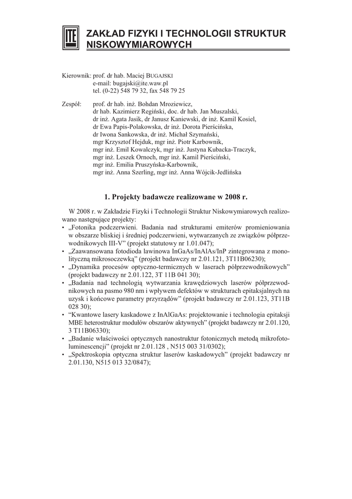 ZAK£AD FIZYKI I TECHNOLOGII STRUKTUR NISKOWYMIAROWYCH Kierownik: prof. dr hab. Maciej BUGAJSKI e-mail: [email protected] tel. (0-22) 548 79 32, fax 548 79 25 Zespó³: prof. dr hab. in¿. Bohdan Mroziewicz, dr hab. Kazimierz Regiñski, doc. dr hab. Jan Muszalski, dr in¿. Agata Jasik, dr Janusz Kaniewski, dr in¿. Kamil Kosiel, dr Ewa Papis-Polakowska, dr in¿. Dorota Pierœciñska, dr Iwona Sankowska, dr in¿. Micha³ Szymañski, mgr Krzysztof Hejduk, mgr in¿. Piotr Karbownik, mgr in¿. Emil Kowalczyk, mgr in¿. Justyna Kubacka-Traczyk, mgr in¿. Leszek Ornoch, mgr in¿. Kamil Pierœciñski, mgr in¿. Emilia Pruszyñska-Karbownik, mgr in¿. Anna Szerling, mgr in¿. Anna Wójcik-Jedliñska 1. Projekty badawcze realizowane w 2008 r. W 2008 r. w Zak³adzie Fizyki i Technologii Struktur Niskowymiarowych realizowano nastêpuj¹ce projekty: • „Fotonika podczerwieni. Badania nad strukturami emiterów promieniowania w obszarze bliskiej i œredniej podczerwieni, wytwarzanych ze zwi¹zków pó³przewodnikowych III-V” (projekt statutowy nr 1.01.047); • „Zaawansowana fotodioda lawinowa InGaAs/InAlAs/InP zintegrowana z monolityczn¹ mikrosoczewk¹” (projekt badawczy nr 2.01.121, 3T11B06230); • „Dynamika procesów optyczno-termicznych w laserach pó³przewodnikowych” (projekt badawczy nr 2.01.122, 3T 11B 041 30); • „Badania nad technologi¹ wytwarzania krawêdziowych laserów pó³przewodnikowych na pasmo 980 nm i wp³ywem defektów w strukturach epitaksjalnych na uzysk i koñcowe parametry przyrz¹dów” (projekt badawczy nr 2.01.123, 3T11B 028 30); • “Kwantowe lasery kaskadowe z InAlGaAs: projektowanie i technologia epitaksji MBE heterostruktur modu³ów obszarów aktywnych” (projekt badawczy nr 2.01.120, 3 T11B06330); • „Badanie w³aœciwoœci optycznych nanostruktur fotonicznych metod¹ mikrofotoluminescencji” (projekt nr 2.01.128 , N515 003 31/0302); • „Spektroskopia optyczna struktur laserów kaskadowych” (projekt badawczy nr 2.01.130, N515 013 32/0847); 2 Sprawozdanie z dzia³alnoœci ITE w 2008 r. • “Laserowe Ÿród³o promieniowania podczerwonego” VERTIGO (projekt badaw- czy finansowany przez UE, nr 5.01.037, 138/6.PR UE/2007/7); • “Termografia odbiciowa laserów pó³przewodnikowych i linijek laserów du¿ej mocy” (projekt badawczy nr N515 416034); • “Zaawansowane technologie dla pó³przewodnikowej optoelektroniki podczer- • • • • wieni” (PBZ 3.01.015, PBZ-MNiSW-02/I/2007). Zak³ad œwiadczy³ równie¿ us³ugi naukowo-badawcze: wykonanie procesu osadzania azotku krzemu na p³ytkach InP metod¹ PECVD (nr 6.01.595); opracowanie technologii wygrzewania Zn do InSb oraz opracowanie technologii nak³adania na p³ytki szafirowe metalizacji CrAu technik¹ lift off (nr 6.01.603); wykonanie metalizacji Cr/Au i fotolitografii na p³ytkach szafirowych (nr 7.01.156); wykonanie metalizacji CrAu na p³ytkach kwarcowych (7.01.159). 2. Najwa¿niejsze osi¹gniêcia naukowo-badawcze W Zak³adzie prowadzone s¹ prace nad strukturami niskowymiarowymi ze zwi¹zków pó³przewodnikowych III-V i przyrz¹dami optoelektronicznymi wytwarzanymi z tych struktur. Nowoczesne przyrz¹dy pó³przewodnikowe s¹ wykonywane metod¹ epitaksji z wi¹zek molekularnych MBE (Molecular Beam Epitaxy) w reaktorach RIBER 32P i RIBER Compact 21T. Typowymi materia³ami wytwarzanymi t¹ metod¹ s¹ takie zwi¹zki podwójne, jak GaAs, AlAs, InAs oraz ich zwi¹zki potrójne InGaAs, AlGaAs i poczwórne InGaAlAs. W 2008 r. prace badawcze koncentrowa³y siê nowych typach laserów pó³przewodnikowych, pompowanych optycznie laserach du¿ej mocy (VECSEL) i kaskadowych emiterach promieniowania bliskiej i œredniej podczerwieni. W dziedzinie laserów VECSEL osi¹gniêto znaczny postêp w stosunku do roku ubieg³ego. Uzyskano akcjê laserow¹ w strukturach GaAs/InGaAs i strukturach antymonkowych wytwarzanych technologi¹ MBE w ITE i Fraunhofer Institut für Angewandte Festkörperphysik we Fryburgu. Rozwiniêto metody charakteryzacji laserów krawêdziowych, m. in. uruchomiono uk³ady pomiarowe do badania wzmocnienia w strukturach i pomiaru wspó³czynników odbicia zwierciade³. Kolejn¹, wa¿n¹ grupê tematyczn¹ stanowi³y prace nad kwantowymi laserami kaskadowymi. Kwantowe lasery kaskadowe stanowi¹ now¹ klasê unipolarnych laserów pó³przewodnikowych, których dzia³anie jest oparte na przejœciach wewn¹trzpasmowych. W odró¿nieniu od klasycznych laserów pó³przewodnikowych, wykorzystuj¹cych przejœcia miêdzypasmowe, d³ugoœæ fali emitowanego przez nie promieniowania praktycznie nie zale¿y od materia³u, z którego s¹ wykonane, lecz jedynie od geometrii jam kwantowych stanowi¹cych ich obszar czynny. Pozwala to na pokrycie szerokiego spektrum d³ugoœci fal od bliskiej poprzez œredni¹ do dalekiej podczerwieni za pomoc¹ struktur wytwarzanych na bazie GaAs i InP, materia³ów, Zak³ad Fizyki i Technologii Struktur Niskowymiarowych 3 których technologia jest doskonale opanowana. Kaskadowa natura generacji promieniowania pozwala na powielanie fotonów i umo¿liwia uzyskiwanie mocy przekraczaj¹cych te, które s¹ generowane w laserach bipolarnych. Lasery kaskadowe s¹ idealnym Ÿród³em promieniowania w uk³adach detekcji zanieczyszczeñ gazowych, spektroskopii molekularnej i systemach telekomunikacji w swobodnej przestrzeni. Mo¿na równie¿ myœleæ o ich zastosowaniach w medycynie do wczesnego wykrywania ska¿eñ i substancji biologicznych. Prowadzone prace koncentrowa³y siê na opracowaniu metod analizy teoretycznej i projektowania laserów oraz opracowaniu podstawowych elementów technologii wytwarzania struktur z wykorzystaniem metody MBE. Jednoczeœnie prowadzono prace nad metodami charakteryzacji rentgenowskiej struktur laserów kaskadowych. Istotny postêp zosta³ osi¹gniêty w dziedzinie metod teoretycznych i technik eksperymentalnych badania w³aœciwoœci cieplnych laserów ró¿nych typów. 2.1. Lasery o emisji powierzchniowej typu VECSEL Lase