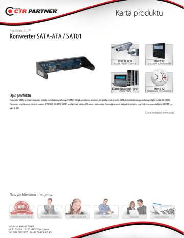 Akcesoria CCTV Konwerter SATA-ATA / SAT01 INSTALACJA KAMER PRZEMYSŁOWYCH KONTROLA DOSTĘPU I CZASU PRACY MONTAŻ SYSTEMÓW ALARMOWYCH MONTAŻ SYSTEMÓW P.POŻAROWYCH Opis produktu Konwerter SATA - ATA przeznaczony jest dla rejestratorów cyfrowych SAT 01. Dzięki urządzeniu możliwe jest podłączenie dysków SATA do rejestratorów posiadających tylko złącze IDE (ATA). Konwerter współpracuje z rejestratorami: CPD/AVC, DG, KPD. SAT 01 podłącza się kablem IDE wraz z zasilaniem. Zmieniając zworki na dysk decydujemy czy będzie on pracował jako MASTER czy jako SLAVE... Czytaj więcej na www.ctr.pl Naszym klientom oferujemy: GWARANCJA SATYSFAKCJI PROGRAM PARTNERSKI POMOC TECHNICZNA SERWIS CCTV SZKOLENIA GENERATOR OFERT