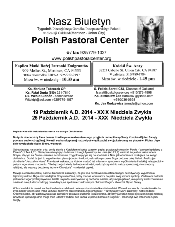 Nasz Biuletyn Tygodnik Diecezjalnego Ośrodka Duszpasterskiego Polonii w diecezji Oakland (Martinez - Union City) Polish Pastoral Center ? / fax 925/779-1027 www.polishpastoralcenter.org Kaplica Matki Bożej Patronki Emigrantów 909 Mellus St., Martinez, CA 94553 ?/fax w ośrodku EBPAA: 925/229-9197 Msza św. w niedzielę - 10.30 am Ks. Mariusz Tabaczek OP Ks. Rafał Duda (510) 221-7610 Dk. Witold Cichoń - administrator [email protected] ?925/779-1027 Kościół Św. Anny 32223 Cabello St., Union City, CA 94587 ? cafeteria: 510/489-9784 Msza św. w niedzielę - 1.45 pm S. Felicia Sarati CSJ, Diocese of Oakland [email protected] ?510/273-4998 Ks. Stanisław Żak [email protected] ?510/336-0698 Ks. Jan Rudzewicz [email protected] 19 Październik A.D. 2014 - XXIX Niedziela Zwykła 26 Październik A.D. 2014 - XXX Niedziela Zwykła Papież: Kościół-Oblubienica czeka na swego Oblubieńca Do życia obecnością Pana Jezusa i żarliwym oczekiwaniem Jego przyjścia zachęcił wspólnoty Kościoła Ojciec Święty podczas audiencji ogólnej. Kwestii eschatologicznej nadziei poświęcił papież swoją katechezę na placu św. Piotra. Jego słów wysłuchało około 30 tys. wiernych. Odpowiadając na pytanie, o to, co się stanie z Kościołem u końca czasów, papież przytoczył słowa św. Pawła - "zawsze będziemy z Panem" (1 Tes 4,17). Następnie nawiązując do tekstu z Księgi Apokalipsy św. Jana (Ap 21,2) wskazał, że jest on także ludem Bożym, idącym za Panem Jezusem i codziennie przygotowującym się na spotkanie z Nim, jak oblubienica czekająca na swego oblubieńca. Dodał, że jest to wypełnieniem planu jedności i miłości, nakreślonym przez Boga podczas całej historii. Analizując określenie "Jeruzalem Nowe" Franciszek wskazał, że Kościół ma być też miastem - symbolem współistnienia i ludzkiej relacyjności w pełnym tego słowa znaczeniu. "Nie będzie już wtedy żadnej samotności, nadużyć czy różnic natury społecznej, etnicznej czy religijnej, ale wszyscy będziemy jedno w Chrystusie" - stwierdził papież. Mówiąc o chrześcijańskiej nadziei Franciszek zaznaczył, że jest ona oczekiwaniem ostatecznego i definitywnego wypełnienia tajemnicy miłości Boga oraz nadejścia Chrystusa Pana, który ma nas wprowadzić do pełni swej komunii i pokoju. Zadaniem Kościoła jest wobec tego "podtrzymywanie światła i wyraźne ukazywanie tej pochodni nadziei, aby mogła jaśnieć jako pewny znak zbawienia i oświecać całej ludzkości drogę prowadzącą na spotkanie z miłosiernym obliczem Boga" - stwierdził Ojciec Święty. W tym kontekście papież zachęcił do bycia czytelnymi i wiarygodnymi świadkami tej nadziei. Wezwał wspólnoty chrześcijańskie do życia nadal "obecnością Pana Jezusa i żarliwym oczekiwaniem Jego przyjścia". "Przyzywajmy Maryi Dziewicy, matki nadziei i Królowej Nieba, aby zachowywała nas zawsze w postawie słuchania i oczekiwania, abyśmy już teraz mogli być przeniknięci miłością Chrystusa i pewnego dnia mogli mieć udział w radości bez końca, w pełnej komunii z Bogiem" - zakończył swą katechezę Ojciec Święty. “ O PAPIEŻU POLAKU “ Łzami szczęścia, zroszona w słońcu października, Polska drżała dreszczem światła jasnego. Uderzyły dzwony watykańskie w niebo, papieżem ogłosiły jej Syna rodzonego! ................................. Swą barkę zostawiłeś nad Wisły brzegami, by rozpocząć nowy łów na oceanie. Poprzez wody grzmiące fale płynęła otucha, a nadzieja wiodła ludzi na spotkanie. Patronem wolności, zrozumienia i oddania byłeś. Z serdeczną czułością dotykałeś ludzkich spraw, przestrzegając nasze słabe dusze, przed nadużywaniem tych świętych dla człowieka praw. Człowieka bowiem ukochałeś, jako boski instrument, kojąc jego ból nutami swej pieśni o miłości, łamiąc bariery wszelkie na drodze pojednania, a niezgody przepaście, łącząc w jeden postument. Ty, nasz Wielki Rodaku dodawałeś nam siły, mocą swojej wiary, odtrącałeś zwątpienia. W trudzie zapewniałeś o swoich modlitwach, kiedy losy naszej Polski w bojach się warzyły. Drogie Ci połacie od morza do gór i lud umiłowany – polecałeś Panience, by w potrzebie siłę w niego tchnęła, krusząc dyby, krępujące mu serce. Janie Pawle II – Papieżu świata całego! My, Twoi rodacy zapewnić Cię chcemy, połączeni z Tobą w modlitwie do Maryi, wypraszamy pokój i miłość do bliźniego. I jak Ty – Niepokalanej Pani oddani, Jej łaskom, opiece i głębokiej wierze, umacniamy nasze wątłe istnienie Twą świętą mocą w znoju dnia wspierani. Zjednani pamiecią o Wielkim Rybaku, zawierzamy się Twojemu orędowaniu, a litanią do Maryi Matki - prosimy: Niech Bóg Ci zapłaci – Kochany Rodaku!!! (W 33‐cią rocznicę rozpoczęcia pontyfikatu przez Jana Pawła II) (Alicja Jęczmień, Kalifornia – październik 2011) Z Sponsorzy “Naszego Biuletynu” Z Ogłoszenia różne: Praca - Kupno - Sprzedaż - Usługi ` Ogłoszenie odnosnie opiekunki do dziecka. Poszukujemy niani / opiekunki do 2.5-letniego chłopca na 5 dni w tygodniu (pon - piatek) rozpoczynajac od konca października / poczatek listopada. Mieszkamy w Hercules, CA. Czas pracy około 7 godz. dziennie. Prosimy o kontakt na e-mail: [email protected] lub telefon: (208)964-5140 ( Ania) ` W dniu 17 Października (piatek) w godz. 19:30 - 21:00 odbyło się spotkanie przedstawicieli group etnicznych dziecezji Oakland z Biskupem Michael C. Barber w sali Cathedral Parish Hall. Na koniec tego bardzo spokojnego ale rzeczowego spotkania Biskup Barber SJ powiedział: The very important things to me are: how we communicate our faith to our youth? How to preserve your own culture and language? To question how to find priests he said: these are challenges to the entire Universal Church. Further Bishop said “ I want to be your brother in Christ” ` Zawiadamiam wiernych o trudnej sytuacji naszej wspólnoty, ponieważ na dzien dzisiejszy 