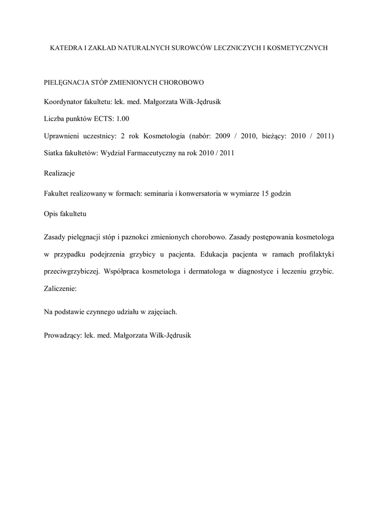 KATEDRA I ZAKŁAD NATURALNYCH SUROWCÓW LECZNICZYCH I KOSMETYCZNYCH PIELĘGNACJA STÓP ZMIENIONYCH CHOROBOWO Koordynator fakultetu: lek. med. Małgorzata Wilk-Jędrusik Liczba punktów ECTS: 1.00 Uprawnieni uczestnicy: 2 rok Kosmetologia (nabór: 2009 / 2010, bieżący: 2010 / 2011) Siatka fakultetów: Wydział Farmaceutyczny na rok 2010 / 2011 Realizacje Fakultet realizowany w formach: seminaria i konwersatoria w wymiarze 15 godzin Opis fakultetu Zasady pielęgnacji stóp i paznokci zmienionych chorobowo. Zasady postępowania kosmetologa w przypadku podejrzenia grzybicy u pacjenta. Edukacja pacjenta w ramach profilaktyki przeciwgrzybiczej. Współpraca kosmetologa i dermatologa w diagnostyce i leczeniu grzybic. Zaliczenie: Na podstawie czynnego udziału w zajęciach. Prowadzący: lek. med. Małgorzata Wilk-Jędrusik
