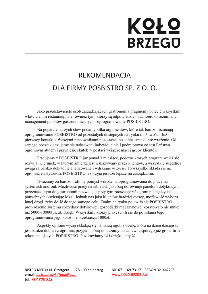 REKOMENDACJA DLA FIRMY POSBISTRO SP. Z O. O. Jako przedstawiciele osób zarządzających gastronomią pragniemy polecić wszystkim właścicielom restauracji, ale również tym, którzy są odpowiedzialni za szeroko rozumiany management punktów gastronomicznych - oprogramowanie POSBISTRO. Na poparcie naszych słów podamy kilka argumentów, które tak bardzo różnicują oprogramowanie POSBISTRO od pozostałych dostępnych na rynku możliwości. Już pierwszy kontakt z Waszymi pracownikami pozostawił po sobie same dobre wrażenie. Od samego początku czujemy się traktowani indywidualnie i podmiotowo co jest Państwa ogromnym atutem i przyniesie skutek w postaci wciąż rosnącej grupy klientów. Pracujemy z POSBISTRO już ponad 3 miesiące, podczas których program wciąż się rozwija. Kierunek, w którym zmierza jest wskazywany przez klientów, a wszystkie sugestie i uwagi są bardzo dokładnie analizowane i wdrażane w życie. To wszystko składa się na ogromną elastyczność POSBISTRO i sprzyja jeszcze lepszemu zarządzaniu. Uważamy za bardzo trafiony pomysł wdrożenia oprogramowania do pracy na systemach android. Możliwość pracy na tabletach jakością dorównuje panelom dotykowym, przeznaczonym do gastronomii pozwalając przy tym zaoszczędzić ogrom pieniędzy tak potrzebnych otwierając lokal. Jednak nas jako klientów bardziej cieszy, możliwość wyboru innej drogi, żeby dojść do tego samego celu. Zanim na rynku pojawiło się POSBISTRO prowadzenie systemu sprzedaży dotykowej, gospodarki magazynowej kosztowało nie mniej niż 5000-10000tys. zł. Dzięki Wszystkim, którzy przyczynili się do powstania tego oprogramowania jego koszt nie przekracza 1000zł. Aspekty opisane wyżej składają się na naszą ogólną ocenę, która na dzień dzisiejszy jest bardzo dobra i z ogromną przyjemnością dołączamy do zapewne sporego już grona firm rekomendujących POSBISTRO. Pozdrawiamy i dziękujemy BISTRO MEDYK ul. Grottgera 11, 78-100 Kołobrzeg e-mail: [email protected] tel. 787 808 513 NIP 671-169-73-17 REGON 321462798 www.KOLO-BRZEGU.pl