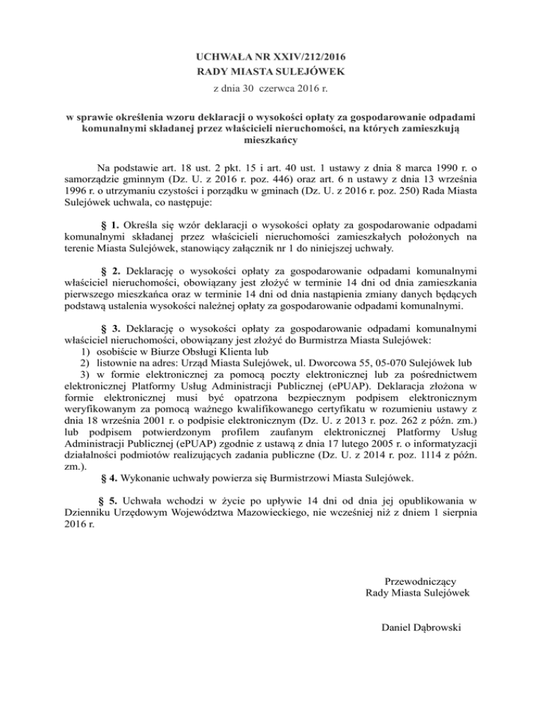 UCHWAŁA NR XXIV/212/2016 RADY MIASTA SULEJÓWEK z dnia 30 czerwca 2016 r. w sprawie określenia wzoru deklaracji o wysokości opłaty za gospodarowanie odpadami komunalnymi składanej przez właścicieli nieruchomości, na których zamieszkują mieszkańcy Na podstawie art. 18 ust. 2 pkt. 15 i art. 40 ust. 1 ustawy z dnia 8 marca 1990 r. o samorządzie gminnym (Dz. U. z 2016 r. poz. 446) oraz art. 6 n ustawy z dnia 13 września 1996 r. o utrzymaniu czystości i porządku w gminach (Dz. U. z 2016 r. poz. 250) Rada Miasta Sulejówek uchwala, co następuje: § 1. Określa się wzór deklaracji o wysokości opłaty za gospodarowanie odpadami komunalnymi składanej przez właścicieli nieruchomości zamieszkałych położonych na terenie Miasta Sulejówek, stanowiący załącznik nr 1 do niniejszej uchwały. § 2. Deklarację o wysokości opłaty za gospodarowanie odpadami komunalnymi właściciel nieruchomości, obowiązany jest złożyć w terminie 14 dni od dnia zamieszkania pierwszego mieszkańca oraz w terminie 14 dni od dnia nastąpienia zmiany danych będących podstawą ustalenia wysokości należnej opłaty za gospodarowanie odpadami komunalnymi. § 3. Deklarację o wysokości opłaty za gospodarowanie odpadami komunalnymi właściciel nieruchomości, obowiązany jest złożyć do Burmistrza Miasta Sulejówek: 1) osobiście w Biurze Obsługi Klienta lub 2) listownie na adres: Urząd Miasta Sulejówek, ul. Dworcowa 55, 05-070 Sulejówek lub 3) w formie elektronicznej za pomocą poczty elektronicznej lub za pośrednictwem elektronicznej Platformy Usług Administracji Publicznej (ePUAP). Deklaracja złożona w formie elektronicznej musi być opatrzona bezpiecznym podpisem elektronicznym weryfikowanym za pomocą ważnego kwalifikowanego certyfikatu w rozumieniu ustawy z dnia 18 września 2001 r. o podpisie elektronicznym (Dz. U. z 2013 r. poz. 262 z późn. zm.) lub podpisem potwierdzonym profilem zaufanym elektronicznej Platformy Usług Administracji Publicznej (ePUAP) zgodnie z ustawą z dnia 17 lutego 2005 r. o informatyzacji działalności podmiotów realizujących zadania publiczne (Dz. U. z 2014 r. poz. 1114 z późn. zm.). § 4. Wykonanie uchwały powierza się Burmistrzowi Miasta Sulejówek. § 5. Uchwała wchodzi w życie po upływie 14 dni od dnia jej opublikowania w Dzienniku Urzędowym Województwa Mazowieckiego, nie wcześniej niż z dniem 1 sierpnia 2016 r. Przewodniczący Rady Miasta Sulejówek Daniel Dąbrowski UZASADNIENIE Zgodnie z art. 11 ustawy z dnia 28 listopada 2014 r. o zmianie ustawy o utrzymaniu czystości i porządku w gminach oraz niektórych innych ustaw ( Dz. U. z 2015 r. poz. 87), dotychczasowe akty prawa miejscowego wydane n podstawie art. 6n ustawy o utrzymaniu czystości i porządku w gminach (Dz. U. z 2013 r. poz. 1399 z późn. zm.), zachowują moc na okres na jaki zostały wydane, nie dłużej niż przez 18 miesięcy od dnia wejścia w życie niniejszej ustawy. Oznacza to konieczność podjęcia nowej uchwały w sprawie określenia wzoru deklaracji o wysokości opłaty za gospodarowanie odpadami komunalnymi składanej przez właścicieli nieruchomości, na których zamieszkują mieszkańcy. W związku z powyższym konieczne jest podjęcie przedkładanej uchwały dostosowującej rozwiązania prawne do znowelizowanej ustawy o utrzymanie czystości i porządku w gminach. POLA JASNE NALEŻY WYPEŁNIĆ KOMPUTEROWO LUB RĘCZNIE, DUŻYMI, DRUKOWANYMI LITERAMI, CZARNYM LUB NIEBIESKIM KOLOREM Załącznik nr 1 do Uchwały Nr XXIV/212/2016 Rady Miasta Sulejówek z dnia 30 czerwca2016 r. DEKLARACJA O WYSOKOŚCI OPŁATY ZA GOSPODAROWANIE ODPADAMI KOMUNALNYMI Składający: Podstawa prawna: Termin składania: Miejsce składania : A. Formularz przeznaczony dla właścicieli nieruchomości, współwłaścicieli, użytkowników wieczystych oraz osób posiadających nieruchomości w zarządzie lub użytkowaniu, władających nieruchomością. Ustawa z dnia 13 września 1996 r. o utrzymaniu czystości i porządku w gminach (Dz. U. z 2016 r., poz. 250) w terminie 14 dni od dnia zamieszkania na danej nieruchomości pierwszego mieszkańca, w terminie 14 dni od dnia zmiany danych będących podstawą ustalenia wysokości należnej opłaty za gospodarowanie odpadami komunalnymi, w szczególności zmiany ilości zamieszkałych osób na terenie nieruchomości. Urząd Miasta Sulejówek, ul. Dworcowa 55, 05-070 Sulejówek ORGAN WŁAŚCIWY, DO KTÓREGO NALEŻY ZŁOŻYĆ DEKLARACJĘ Organ właściwy do złożenia deklaracji: Burmistrz Miasta Sulejówek Deklarację należy złożyć: 1) osobiście w Biurze Obsługi Klienta w Urzędzie Miasta Sulejówek ul. Dworcowa 55, 05-070 Sulejówek lub 2) listownie na adres Urząd Miasta Sulejówek, ul. Dworcowa 55, 05-070 Sulejówek lub 3) w formie elektronicznej za pośrednictwem poczty elektronicznej lub za pośrednictwem elekrtonicznej Platformy Usług Administracji 1) Publicznej (ePUAP) pod adresem www.epuap.gov.pl w formacie pdf, xls B. OBOWIĄZEK ZŁOŻENIA DEKLARACJI B.1. Okoliczności powodujące obowiązek złożenia deklaracji (należy zaznaczyć właściwe pole) Nowa deklaracja-zmiana danych Pierwsza deklaracja ( na podst. art. 6m 3) 2) Korekta ( na podstawie art. 81 ustawy z dnia 29 sierpnia 1997 r.- Ordynacja podatkowa ( Dz. U. 2012, poz. 747 z późn. zm.) (na podst. art. 6m ust.2 ustawy z dnia 13 września 1996 r. o utrzymaniu czystości i porządku w gminach) ust.1 ustawy z dnia 13 września 1996 r. o utrzymaniu czystości i porządku w gminach) Data powstania obowiązku opłaty (data od kiedy nieruchomość jest zamieszkała/data zmiany stanowiącej podstawę ustalenia wysokości naleznej opłaty) Okres, od którego korekta dotyczy …..…..….....¯……...........¯……………… (dzień - miesiąc - rok) …..…..….....¯……...........¯……………… (dzień - miesiąc - rok) B.2. Przyczyny złożenia nowej deklaracji lub korekty (należy zaznaczyć właściwe pole) zmiana ilości osób C. zbycie/nabycie 