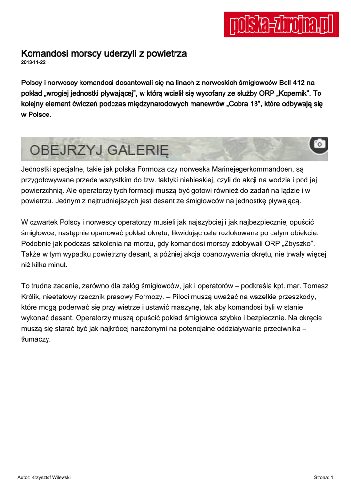 Komandosi morscy uderzyli z powietrza 2013-11-22 Polscy i norwescy komandosi desantowali się na linach z norweskich śmigłowców Bell 412 na pokład „wrogiej jednostki pływającej”, w którą wcielił się wycofany ze służby ORP „Kopernik”. To kolejny element ćwiczeń podczas międzynarodowych manewrów „Cobra 13”, które odbywają się w Polsce. Jednostki specjalne, takie jak polska Formoza czy norweska Marinejegerkommandoen, są przygotowywane przede wszystkim do tzw. taktyki niebieskiej, czyli do akcji na wodzie i pod jej powierzchnią. Ale operatorzy tych formacji muszą być gotowi również do zadań na lądzie i w powietrzu. Jednym z najtrudniejszych jest desant ze śmigłowców na jednostkę pływającą. W czwartek Polscy i norwescy operatorzy musieli jak najszybciej i jak najbezpieczniej opuścić śmigłowce, następnie opanować pokład okrętu, likwidując cele rozlokowane po całym obiekcie. Podobnie jak podczas szkolenia na morzu, gdy komandosi morscy zdobywali ORP „Zbyszko”. Także w tym wypadku powietrzny desant, a później akcja opanowywania okrętu, nie trwały więcej niż kilka minut. To trudne zadanie, zarówno dla załóg śmigłowców, jak i operatorów – podkreśla kpt. mar. Tomasz Królik, nieetatowy rzecznik prasowy Formozy. – Piloci muszą uważać na wszelkie przeszkody, które mogą poderwać się przy wietrze i ustawić maszynę, tak aby komandosi byli w stanie wykonać desant. Operatorzy muszą opuścić pokład śmigłowca szybko i bezpiecznie. Na okręcie muszą się starać być jak najkrócej narażonymi na potencjalne oddziaływanie przeciwnika – tłumaczy. Autor: Krzysztof Wilewski Strona: 1