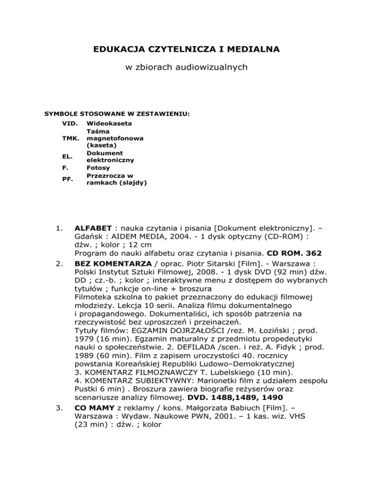 EDUKACJA CZYTELNICZA I MEDIALNA w zbiorach audiowizualnych SYMBOLE STOSOWANE W ZESTAWIENIU: VID. TMK. EL. F. PF. Wideokaseta Taśma magnetofonowa (kaseta) Dokument elektroniczny Fotosy Przezrocza w ramkach (slajdy) 1. ALFABET : nauka czytania i pisania [Dokument elektroniczny]. – Gdańsk : AIDEM MEDIA, 2004. - 1 dysk optyczny (CD-ROM) : dźw. ; kolor ; 12 cm Program do nauki alfabetu oraz czytania i pisania. CD ROM. 362 2. BEZ KOMENTARZA / oprac. Piotr Sitarski [Film]. - Warszawa : Polski Instytut Sztuki Filmowej, 2008. - 1 dysk DVD (92 min) dźw. DD ; cz.-b. ; kolor ; interaktywne menu z dostępem do wybranych tytułów ; funkcje on-line + broszura Filmoteka szkolna to pakiet przeznaczony do edukacji filmowej młodzieży. Lekcja 10 serii. Analiza filmu dokumentalnego i propagandowego. Dokumentaliści, ich sposób patrzenia na rzeczywistość bez uproszczeń i przeinaczeń. Tytuły filmów: EGZAMIN DOJRZAŁOŚCI /reż. M. Łoziński ; prod. 1979 (16 min). Egzamin maturalny z przedmiotu propedeutyki nauki o społeczeństwie. 2. DEFILADA /scen. i reż. A. Fidyk ; prod. 1989 (60 min). Film z zapisem uroczystości 40. rocznicy powstania Koreańskiej Republiki Ludowo–Demokratycznej 3. KOMENTARZ FILMOZNAWCZY T. Lubelskiego (10 min). 4. KOMENTARZ SUBIEKTYWNY: Marionetki film z udziałem zespołu Pustki 6 min) . Broszura zawiera biografie reżyserów oraz scenariusze analizy filmowej. DVD. 1488,1489, 1490 3. CO MAMY z reklamy / kons. Małgorzata Babiuch [Film]. – Warszawa : Wydaw. Naukowe PWN, 2001. – 1 kas. wiz. VHS (23 min) : dźw. ; kolor Materiał dydaktyczny o sposobach przekazywania informacji poprzez reklamę. VID. 1381 4. DZIEJE bibliotek // W : Język polski. Szkoła średnia / reż. Leszek Baron [Film]. – Warszawa : Przedsiębiorstwo Uspołecznione „Nauka”, 1997. – 1 kas. wiz. VHS (19 min) : dźw. ; kolor Historia biblioteki od czasów najdawniejszych po współczesność. VID. 102 5. DZIEJE jednego wynalazku : przyrządy do pisania i przybory biurowe / scen. i realiz. Małgorzata Uberna [Film]. – Warszawa : Telewizja Polska – Telewizja Edukacyjna, 1996; [Nagr. własne, 1998]. – 1 kas. wiz. VHS (15 min) : dźw. ; kolor Wideoprogram o rozwoju techniki pisania i przyborów pisarskich. VID. 348 6. EDUKACJA nowego wieku / aut. Henryk Konieczny, Barbara Puszczewicz [Film]. – Warszawa : Telewizja Polska Ministerstwo Edukacji Narodowej, 1998. - 1 kas. wiz. VHS (120 min): dźw.; kolor + poradnik Pakiet multimedialny prezentuje nowe technologie kształcenia stosowane w edukacji na odległość w krajach europejskich i w USA. Jest to wizja nowej ery edukacji XXI wieku. KASETA 1 zawiera tematy: 1. Telewizja w edukacji - różne koncepcje wykorzystania telewizji w kształceniu. 2. Telewizja interakcyjna – przykłady zastosowania tej techniki i jej funkcje. 3. Studia w telewizji kablowej - przykład amerykańskiego systemu studiowania na poziomie dwuletniego college. 4. Studiowanie z kaset - zastosowanie obrazu wideo w nauczaniu i uczeniu się w USA. 5. Telekomunikacja i telematyka - wykorzystanie e-mail, BBS (biuletynów). VID. 715/ kas.1, 717/ kas. 1 7. ESEJ filmowy / oprac. Konrad Klejsa [Film]. - Warszawa : Polski Instytut Sztuki Filmowej, 2008. - 1 dysk DVD (122 min) dźw. DD ; cz.-b. ; kolor ; interaktywne menu z dostępem do wybranych tytułów ; funkcje on-line + broszura Filmoteka szkolna to pakiet przeznaczony do edukacji filmowej młodzieży. Lekcja 25 serii. Sposób użycia filmowych środków wyrazu. Charakterystyka eseju filmowego łączącego różne formy wypowiedzi: sekwencji fikcyjnych i dokumentalnych, aktorskich i animowanych, z formułą narracji obiektywnej i subiektywnej. Tytuły filmów: 1. ILUMINACJA /scen. i reż. K. Zanussi ; zdj. E. Kłosiński ; muz. W. Kilar ; obsada: S. Latałło, J. Skotnicki, M. Dzienisiewicz-Olbrychska [i in.] ; prod. 1973 (87 min). 2. PREKURSOR /reż. G. Królikiewicz ; prod. 1988 (18 min). Esej dokumentalny. 3. KOMENTARZ FILMOZNAWCZY T. Lubelskiego (12 min). 4. KOMENTARZ SUBIEKTYWNY: Charakter (3 min). Broszura zawiera biografie reżyserów oraz scenariusze analizy filmowej. DVD. 1533, 1534, 1535 8. FILMOWE przypowieści / oprac. Anna Śliwińska [Film]. Warszawa : Polski Instytut Sztuki Filmowej, 2008. - 1 dysk DVD (110 min) dźw. DD ; cz.-b. ; kolor ; interaktywne menu z dostępem do wybranych tytułów ; funkcje on-line + broszura Filmoteka szkolna to pakiet przeznaczony do edukacji filmowej młodzieży. Lekcja 6 serii. Zawiera filmowe odwołania do formy przypowieści i kondensacji znaczeń prowadzących do powstania struktury otwartej i dynamicznej na nowe znaczenia oraz ludzki los. Świat w omawianych filmach jest abstrakcyjnym obrazem człowieka. Tytuły Filmów: 1. ŻYWOT MATEUSZA /scen. i reż. W. Leszczyński, W. Solarz ; zdj. A. Kostenko ; muz. Arcangelo Coreelli ; obsada : F. Pieczka, A. Milewska, W. Gryń [i in.] ; prod. 1967 (76 min). 2. SCHODY /reż. S. Schabenbeck ; prod. 1968 (7 min) 3. KOMENTARZ FILMOZNAWCZY T. Lubelskiego (11 min). 4. KOMENTARZ SUBIEKTYWNY: Szukając Mateusza - film z udziałem kabaretu mumio Broszura zawiera biografie reżyserów oraz scenariusze. DVD. 1476, 1477, 1478 9. FORMY plastyczne pisma i książki / aut. Jerzy Eysymont [Przezrocza]. – Warszawa : Zakł. Wydaw. „Wspólna Sprawa”, 1973. – przezrocza w ramkach (24 kl.) : kolor ; 24 x 36 mm PF. 371 10. GORZKI śmiech / oprac. Piotr Sitarski [Film]. - Warszawa : Polski Instytut Sztuki Filmowej, 2008. - 1 dysk DVD (158 min) dźw. DD ; cz.-b. ; kolor ; interaktywne menu z dostępem do wybranych tytułów ; funkcje on-line + broszura Filmoteka szkolna to pakiet przeznaczony do edukacji filmowej młodzieży. Lekcja 14 serii. Analiza komedii filmowych. Rola polskiej komedii po II wojnie światowej, która poruszała tematy i wypowiadała opinie poprzez aluzyjny język, często tolerowany przez cenzorów. Tytuły filmów: 1. ZEZOWATE SZCZĘŚCIE /reż. A. Munk ; scen. J.S. Stawiński ; zdj. J. Lipman ; muz. J. Krenz ; obsada: B. 