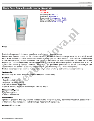 Informacje o produkcie Utworzono 04-03-2017 Bionic Face Cream krem do twarzy -Neostrata Cena : 145,00 zł a. pl Nr katalogowy : 06277 Producent : Neostrata Dostępność : Dostępność - 3 dni Stan magazynowy : bardzo wysoki Średnia ocena : brak recenzji ov Opis: ut yN Profesjonalny preparat do twarzy o działaniu nawilżającym i wygładzającym. Innowacyjna formuła oparta na 8% glukonolaktonie i 4% kwasie laktobionowym wykazuje silne właściwości przeciwstarzeniowe. Zmniejsza widoczne oznaki fotostarzenia, redukuje rumień i podrażnienia dzięki czemu sprawdza się w pielęgnacji pozabiegowej jako kosmetyk przyśpieszający procesy gojenia się skóry. Skutecznie regeneruje i odbudowuje skórę. Zwiększa jędrność przywracając skórze elastyczność i sprężystość przez co zyskuje ona młodszy wygląd. Nawilża i wygładza. Nie powoduje powstawania zmian trądzikowych czy zaskórników. Nie zawiera substancji zapachowych. Jest hipoalergiczny i niekomedogenny. Produkt przeznaczony dla każdego rodzaju cery, w tym także wrażliwej, podrażnionej i zaczerwienionej. ea Wskazania: Przeznaczony dla skóry wrażliwej, podrażnionej i zaczerwienionej. B Działanie: - łagodzi podrażnienia - redukuje zaczerwienienia - skóra jest dobrze nawilżona - zyskuje młodszy wygląd a naskórek jest bardziej miękki. Składniki aktywne: 8% glukonolakton 4% kwas laktobionowy Stosowanie: Aplikować preparat dwa razy dziennie na oczyszczoną skórę twarzy i szyi delikatnie wmasować, pozostawić do wchłonięcia. Rekomendowane jest równoległe stosowanie fotoprotekcji. Pojemność: Tuba 40 g Wygenerowano w programie www.oscGold.com
