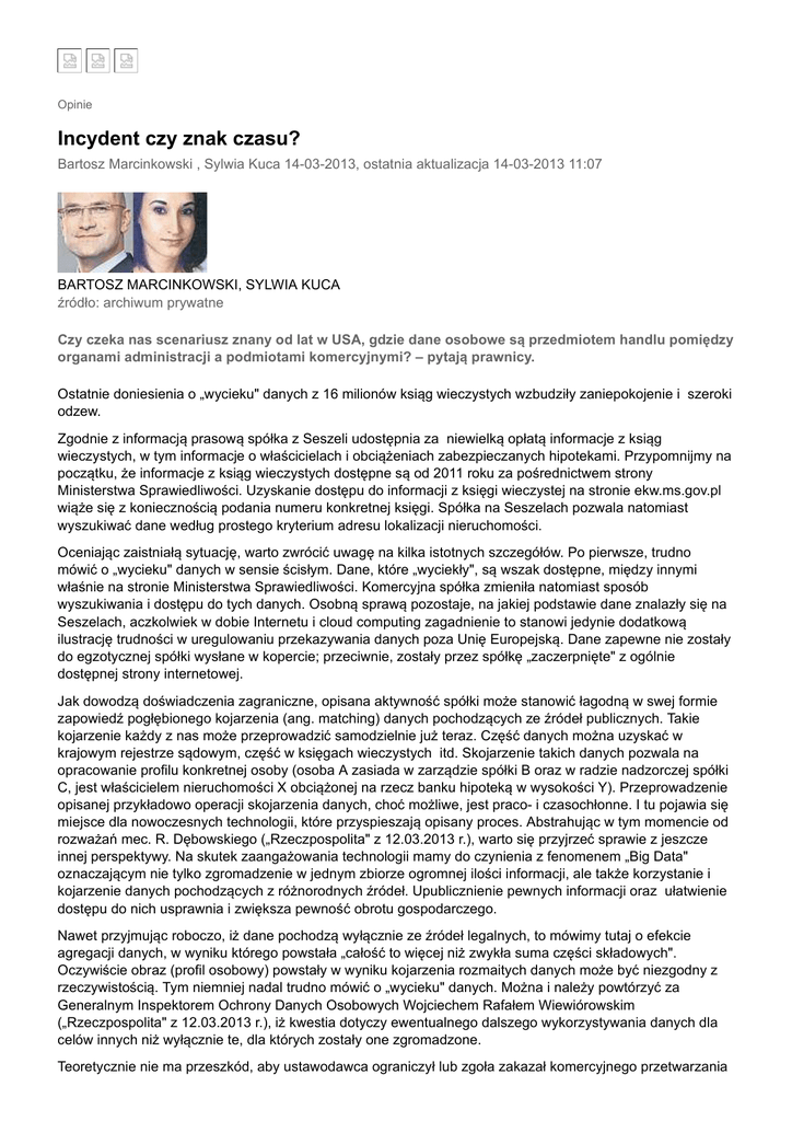 Opinie Incydent czy znak czasu? Bartosz Marcinkowski , Sylwia Kuca 14-03-2013, ostatnia aktualizacja 14-03-2013 11:07 BARTOSZ MARCINKOWSKI, SYLWIA KUCA źródło: archiwum prywatne Czy czeka nas scenariusz znany od lat w USA, gdzie dane osobowe są przedmiotem handlu pomiędzy organami administracji a podmiotami komercyjnymi? – pytają prawnicy. Ostatnie doniesienia o „wycieku" danych z 16 milionów ksiąg wieczystych wzbudziły zaniepokojenie i szeroki odzew. Zgodnie z informacją prasową spółka z Seszeli udostępnia za niewielką opłatą informacje z ksiąg wieczystych, w tym informacje o właścicielach i obciążeniach zabezpieczanych hipotekami. Przypomnijmy na początku, że informacje z ksiąg wieczystych dostępne są od 2011 roku za pośrednictwem strony Ministerstwa Sprawiedliwości. Uzyskanie dostępu do informacji z księgi wieczystej na stronie ekw.ms.gov.pl wiąże się z koniecznością podania numeru konkretnej księgi. Spółka na Seszelach pozwala natomiast wyszukiwać dane według prostego kryterium adresu lokalizacji nieruchomości. Oceniając zaistniałą sytuację, warto zwrócić uwagę na kilka istotnych szczegółów. Po pierwsze, trudno mówić o „wycieku" danych w sensie ścisłym. Dane, które „wyciekły", są wszak dostępne, między innymi właśnie na stronie Ministerstwa Sprawiedliwości. Komercyjna spółka zmieniła natomiast sposób wyszukiwania i dostępu do tych danych. Osobną sprawą pozostaje, na jakiej podstawie dane znalazły się na Seszelach, aczkolwiek w dobie Internetu i cloud computing zagadnienie to stanowi jedynie dodatkową ilustrację trudności w uregulowaniu przekazywania danych poza Unię Europejską. Dane zapewne nie zostały do egzotycznej spółki wysłane w kopercie; przeciwnie, zostały przez spółkę „zaczerpnięte" z ogólnie dostępnej strony internetowej. Jak dowodzą doświadczenia zagraniczne, opisana aktywność spółki może stanowić łagodną w swej formie zapowiedź pogłębionego kojarzenia (ang. matching) danych pochodzących ze źródeł publicznych. Takie kojarzenie każdy z nas może przeprowadzić samodzielnie już teraz. Część danych można uzyskać w krajowym rejestrze sądowym, część w księgach wieczystych itd. Skojarzenie takich danych pozwala na opracowanie profilu konkretnej osoby (osoba A zasiada w zarządzie spółki B oraz w radzie nadzorczej spółki C, jest właścicielem nieruchomości X obciążonej na rzecz banku hipoteką w wysokości Y). Przeprowadzenie opisanej przykładowo operacji skojarzenia danych, choć możliwe, jest praco- i czasochłonne. I tu pojawia się miejsce dla nowoczesnych technologii, które przyspieszają opisany proces. Abstrahując w tym momencie od rozważań mec. R. Dębowskiego („Rzeczpospolita" z 12.03.2013 r.), warto się przyjrzeć sprawie z jeszcze innej perspektywy. Na skutek zaangażowania technologii mamy do czynienia z fenomenem „Big Data" oznaczającym nie tylko zgromadzenie w jednym zbiorze ogromnej ilości informacji, ale także korzystanie i kojarzenie danych pochodzących z różnorodnych źródeł. Upublicznienie pewnych informacji oraz ułatwienie dostępu do nich usprawnia i zwiększa pewność obrotu gospodarczego. Nawet przyjmując roboczo, iż dane pochodzą wyłącznie ze źródeł legalnych, to mówimy tutaj o efekcie agregacji danych, w wyniku którego powstała „całość to więcej niż zwykła suma części składowych". Oczywiście obraz (profil osobowy) powstały w wyniku kojarzenia rozmaitych danych może być niezgodny z rzeczywistością. Tym niemniej nadal trudno mówić o „wycieku" danych. Można i należy powtórzyć za Generalnym Inspektorem Ochrony Danych Osobowych Wojciechem Rafałem Wiewiórowskim („Rzeczpospolita" z 12.03.2013 r.), iż kwestia dotyczy ewentualnego dalszego wykorzystywania danych dla celów innych niż wyłącznie te, dla których zostały one zgromadzone. Teoretycznie nie ma przeszkód, aby ustawodawca ograniczył lub zgoła zakazał komercyjnego przetwarzania 2z2 informacji pochodzących z domeny publicznej w sposób, w jaki czyni to spółka z Seszeli. Pojawia się wówczas kolejny problem, mianowicie kwestia skutecznego egzekwowania przestrzegania prawa polskiego przez spółkę z siedzibą na Seszelach oferującą towar dostępny wyłącznie w cyberprzestrzeni. Pomijając skomplikowane zagadnienia dotyczące wymuszenia stosowania w jednym państwie prawa innego kraju, trzeba skonstatować, iż nie brakuje na świecie egzotycznych jurysdykcji, które mogą stanowić platformę wykorzystywaną do praktyk takich, jak obecnie opisana. Zatem ponownie ujawnia się rozziew pomiędzy globalną siecią i towarem, jakim jest zagregowana informacja, a krajowymi lub regionalnymi rozwiązaniami prawnymi mającymi służyć ochronie danych i zapewnieniu praw jednostek. Tym sposobem, wobec natury Internetu, może się ziścić – bądź zgoła ziszcza się na naszych oczach – scenariusz znany od lat ze Stanów Zjednoczonych, gdzie dane osobowe są przedmiotem handlu pomiędzy organami administracji a podmiotami komercyjnymi, agencje kredytowe zaś opracowujące dane na temat konsumentów stanowią istotną gałąź gospodarki. Prawodawca unijny stara się nie dopuścić do takiej sytuacji, aczkolwiek postęp techniczny nieubłaganie skutecznie utrudnia czy wręcz niweczy te starania. CV Bartosz Marcinkowski – partner, radca prawny, Sylwia Kuca – Associate, aplikant adwokacki, kancelaria Domański Zakrzewski, Palinka Rzeczpospolita 2013-03-14 11:16