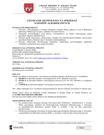 URZĄD MIEJSKI W KSIĄŻU WLKP. ul. Stacha Wichury 11a, 63-130 Książ Wlkp. tel. 61 2822001, fax 61 2822724 e-mail: [email protected], www.ksiaz-wlkp.pl O.0143.6.2013 UZYSKANIE ZEZWOLENIA NA SPRZEDAŻ NAPOJÓW ALKOHOLOWYCH WYMAGANE DOKUMENTY 1. Wniosek – druk dostępny w Urzędzie Miejskim w Książu Wlkp., pokój nr 3 oraz w Biuletynie Informacji Publicznej Urzędu w zakładce Poradnik Klienta. 2. Dokument potwierdzający tytuł prawny wnioskodawcy do lokalu stanowiącego punkt sprzedaży napojów alkoholowych. 3. Pisemna zgoda właściciela, użytkownika, zarządcy lub administratora budynku, jeżeli punkt sprzedaży będzie zlokalizowany w budynku wielorodzinnym. 4. Decyzja właściwego Powiatowego Inspektora Sanitarnego potwierdzająca spełnienie warunków sanitarnych przez punkt sprzedaży. MIEJSCE ZAŁATWIENIA SPRAWY Urząd Miejski w Książu Wlkp. Referat Obywatelsko-Organizacyjny Stanowisko ds. działalności gospodarczej, promocji i zdrowia Pokój nr 3 tel. 61 2822001 wew. 40, e-mail [email protected] TERMIN ZAŁATWIENIA SPRAWY Do 35 dni. SPOSÓB ZAŁATWIENIA SPRAWY Wydawane jest zezwolenie. OPŁATY Pobiera się opłatę za korzystanie z zezwolenia na sprzedaż napojów alkoholowych w wysokości: a) 525,00 zł na sprzedaż napojów zawierających do 4,5% alkoholu oraz piwa, b) 525,00 zł na sprzedaż napojów zawierających powyżej 4,5% do 18% alkoholu (z wyjątkiem piwa), c) 2.100,00 zł na sprzedaż napojów zawierających powyżej 18% alkoholu. Ww. opłaty dokonuje się w wysokości proporcjonalnej do okresu ważności zezwolenia w danym roku. Opłatę należy uiścić na rachunek Urzędu Miejskiego w Książu Wlkp. ul. Stacha Wichury 11a nr 43 9084 1026 0300 0101 2000 0001. Dowód uiszczenia opłaty należy dołączyć do składanych dokumentów. TRYB ODWOŁAWCZY 1. Na postanowienie Gminnej Komisji Rozwiązywania Problemów Alkoholowych w Książu Wlkp. przysługuje zażalenie do Samorządowego Kolegium Odwoławczego w Poznaniu za pośrednictwem Burmistrza Książa Wlkp. w terminie 7 dni od daty doręczenia postanowienia. 2. Od decyzji przysługuje odwołanie do Samorządowego Kolegium Odwoławczego w Poznaniu, za pośrednictwem Burmistrza Książa Wlkp. w terminie 14 dni od daty doręczenia decyzji. Projekt jest współfinansowany ze środków Unii Europejskiej w ramach Europejskiego Funduszu Społecznego URZĄD MIEJSKI W KSIĄŻU WLKP. ul. Stacha Wichury 11a, 63-130 Książ Wlkp. tel. 61 2822001, fax 61 2822724 e-mail: [email protected], www.ksiaz-wlkp.pl PODSTAWA PRAWNA 1. Ustawa z dnia 26 października 1982r. o wychowaniu w trzeźwości i przeciwdziałaniu alkoholizmowi (Dz. U. z 2012r. poz. 1356). 2. Uchwała Nr XXXIII/228/2009 Rady Miejskiej w Książu Wlkp. z dnia 29 czerwca 2009r. w sprawie ustalenia liczby punktów sprzedaży napojów alkoholowych zawierających powyżej 4.5 % alkoholu (z wyjątkiem piwa) przeznaczonych do spożycia poza miejscem sprzedaży jak i w miejscu sprzedaży oraz zasad usytuowania na terenie gminy Książ Wlkp. miejsc sprzedaży i podawania napojów alkoholowych (Dz. Urz. Województwa Wielkopolskiego z 2009r. Nr 158, poz. 2721). 3. Ustawa z dnia 14 czerwca 1960 r. Kodeks postępowania administracyjnego (Dz. U. z 2013 r., poz.267). 4. Ustawa z dnia 16 listopada 2006 r. o opłacie skarbowej (Dz. U. z 2012 r., poz.1282 ze zm.). DODATKOWE INFORMACJE 1. Zezwolenie wydaje się na czas oznaczony, jednak nie krótszy niż 4 lata w przypadku sprzedaży w miejscu spożycia oraz nie krótszy niż 2 lata w przypadku sprzedaży poza miejscem spożycia. 2. W przypadku rezygnacji z zezwolenia, wnioskodawca zobowiązany jest zgłosić ten fakt w Urzędzie Miejskim w Książu Wlkp. DATA OSTATNIEGO PRZEGLĄDU/ AKTUALIZACJI 11.04.2013r. Projekt jest współfinansowany ze środków Unii Europejskiej w ramach Europejskiego Funduszu Społecznego