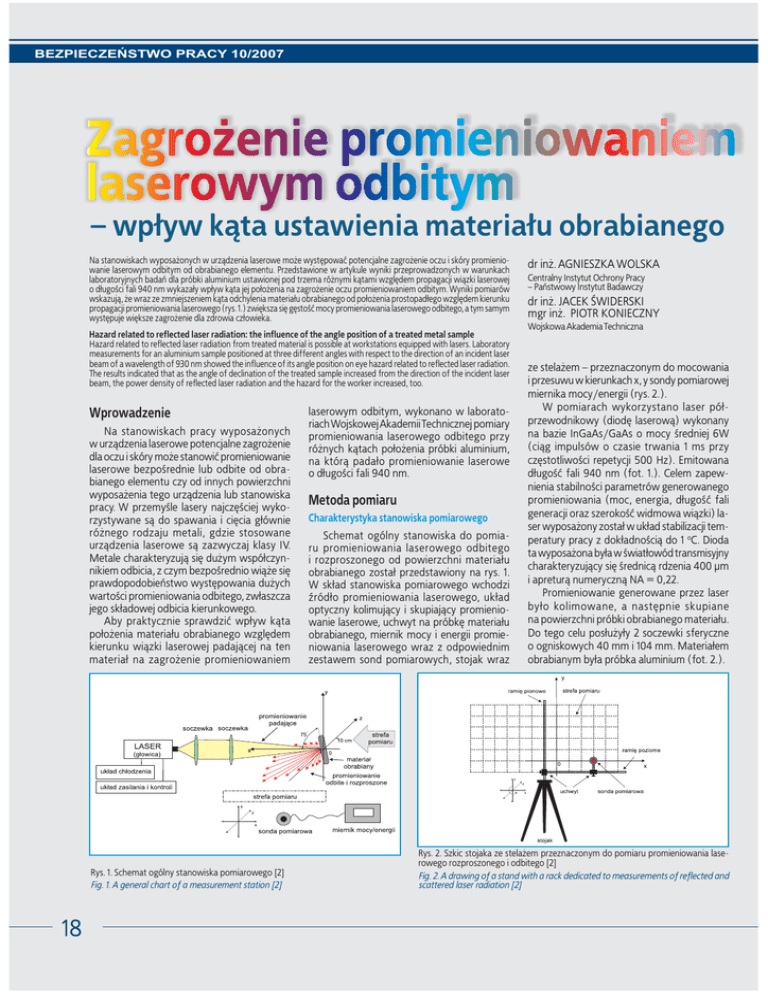 BEZPIECZEŃSTWO PRACY 10/2007 Na stanowiskach wyposa¿onych w urz¹dzenia laserowe mo¿e wystêpowaæ potencjalne zagro¿enie oczu i skóry promieniowanie laserowym odbitym od obrabianego elementu. Przedstawione w artykule wyniki przeprowadzonych w warunkach laboratoryjnych badañ dla próbki aluminium ustawionej pod trzema ró¿nymi k¹tami wzglêdem propagacji wi¹zki laserowej o d³ugości fali 940 nm wykaza³y wp³yw k¹ta jej po³o¿enia na zagro¿enie oczu promieniowaniem odbitym. Wyniki pomiarów wskazuj¹, ¿e wraz ze zmniejszeniem k¹ta odchylenia materia³u obrabianego od po³o¿enia prostopad³ego wzglêdem kierunku propagacji promieniowania laserowego (rys. 1.) zwiêksza siê gêstośæ mocy promieniowania laserowego odbitego, a tym samym wystêpuje wiêksze zagro¿enie dla zdrowia cz³owieka. Hazard related to reflected laser radiation: the influence of the angle position of a treated metal sample Hazard related to reflected laser radiation from treated material is possible at workstations equipped with lasers. Laboratory measurements for an aluminium sample positioned at three different angles with respect to the direction of an incident laser beam of a wavelength of 930 nm showed the influence of its angle position on eye hazard related to reflected laser radiation. The results indicated that as the angle of declination of the treated sample increased from the direction of the incident laser beam, the power density of reflected laser radiation and the hazard for the worker increased, too. Wprowadzenie Na stanowiskach pracy wyposa¿onych w urz¹dzenia laserowe potencjalne zagro¿enie dla oczu i skóry mo¿e stanowiæ promieniowanie laserowe bezpośrednie lub odbite od obrabianego elementu czy od innych powierzchni wyposa¿enia tego urz¹dzenia lub stanowiska pracy. W przemyśle lasery najczêściej wykorzystywane s¹ do spawania i ciêcia g³ównie ró¿nego rodzaju metali, gdzie stosowane urz¹dzenia laserowe s¹ zazwyczaj klasy IV. Metale charakteryzuj¹ siê du¿ym wspó³czynnikiem odbicia, z czym bezpośrednio wi¹¿e siê prawdopodobieñstwo wystêpowania du¿ych wartości promieniowania odbitego, zw³aszcza jego sk³adowej odbicia kierunkowego. Aby praktycznie sprawdziæ wp³yw k¹ta po³o¿enia materia³u obrabianego wzglêdem kierunku wi¹zki laserowej padaj¹cej na ten materia³ na zagro¿enie promieniowaniem Rys. 1. Schemat ogólny stanowiska pomiarowego [2] Fig. 1. A general chart of a measurement station [2] 18 laserowym odbitym, wykonano w laboratoriach Wojskowej Akademii Technicznej pomiary promieniowania laserowego odbitego przy ró¿nych k¹tach po³o¿enia próbki aluminium, na któr¹ pada³o promieniowanie laserowe o d³ugości fali 940 nm. Metoda pomiaru Charakterystyka stanowiska pomiarowego Schemat ogólny stanowiska do pomiaru promieniowania laserowego odbitego i rozproszonego od powierzchni materia³u obrabianego zosta³ przedstawiony na rys. 1. W sk³ad stanowiska pomiarowego wchodzi źród³o promieniowania laserowego, uk³ad optyczny kolimuj¹cy i skupiaj¹cy promieniowanie laserowe, uchwyt na próbkê materia³u obrabianego, miernik mocy i energii promieniowania laserowego wraz z odpowiednim zestawem sond pomiarowych, stojak wraz dr in¿. AGNIESZKA WOLSKA Centralny Instytut Ochrony Pracy – Pañstwowy Instytut Badawczy dr in¿. JACEK ŚWIDERSKI mgr in¿. PIOTR KONIECZNY Wojskowa Akademia Techniczna ze stela¿em – przeznaczonym do mocowania i przesuwu w kierunkach x, y sondy pomiarowej miernika mocy/energii (rys. 2.). W pomiarach wykorzystano laser pó³przewodnikowy (diodê laserow¹) wykonany na bazie InGaAs/GaAs o mocy średniej 6W (ci¹g impulsów o czasie trwania 1 ms przy czêstotliwości repetycji 500 Hz). Emitowana d³ugośæ fali 940 nm (fot. 1.). Celem zapewnienia stabilności parametrów generowanego promieniowania (moc, energia, d³ugośæ fali generacji oraz szerokośæ widmowa wi¹zki) laser wyposa¿ony zosta³ w uk³ad stabilizacji temperatury pracy z dok³adności¹ do 1 oC. Dioda ta wyposa¿ona by³a w świat³owód transmisyjny charakteryzuj¹cy siê średnic¹ rdzenia 400 μm i apretur¹ numeryczn¹ NA = 0,22. Promieniowanie generowane przez laser by³o kolimowane, a nastêpnie skupiane na powierzchni próbki obrabianego materia³u. Do tego celu pos³u¿y³y 2 soczewki sferyczne o ogniskowych 40 mm i 104 mm. Materia³em obrabianym by³a próbka aluminium (fot. 2.). Rys. 2. Szkic stojaka ze stela¿em przeznaczonym do pomiaru promieniowania laserowego rozproszonego i odbitego [2] Fig. 2. A drawing of a stand with a rack dedicated to measurements of reflected and scattered laser radiation [2] BEZPIECZEŃSTWO PRACY 10/2007 Pomiary wykonano w p³aszczyźnie prostopad³ej do pod³o¿a z wykorzystaniem zaprojektowanego do tego celu stojaka (rys. 2.). Na ramieniu poziomym znajduje siê metalowy uchwyt (przesuwany wzd³u¿ ramienia) s³u¿¹cy do zamocowania sond pomiarowych przy maksymalnej gêstości siatki wynosz¹cej 2,5 cm w obu osiach. go dla ustawienia próbki aluminium pod k¹tem 90º wzglêdem promieniowania laserowego padaj¹cego na próbkê przedstawiono w tabeli 1. oraz w postaci graficznej na rys. 3. W przypadku próbki ustawionej pod k¹tem 90º w p³aszczyźnie pomiarów wyst¹pi³o kilka „pików” promieniowania odbitego, wokó³ których wystêpuj¹ ró¿nej szerokości rozproszenia promieniowania. Najwiêksza gêstośæ energii (pierwszy, co do wielkości pik) wystêpowa³a przy k¹cie ok. 30o w p³aszczyźnie poziomej (liczonym od linii propagacji promieniowania laserowego padaj¹cego na próbkê) oraz przy k¹cie ok. 27o w p³aszczyźnie pionowej powy¿ej linii propagacji promieniowania laserowego padaj¹cego na próbkê. Drugi, co do wielkości pik wystêpowa³ przy k¹cie ok. 27o w p³aszczyźnie poziomej (liczonym od linii propagacji promieniowania laserowego padaj¹cego na próbkê) oraz w linii propagacji promieniowania laserowego padaj¹cego na próbkê (k¹t 0o). Trzeci, co do wielkości pik wystêpowa³