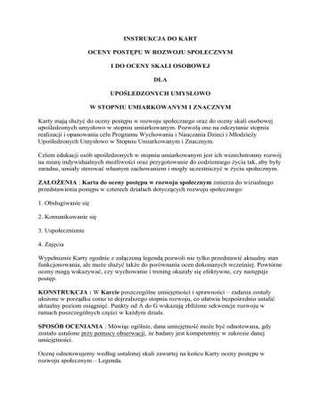 INSTRUKCJA DO KART OCENY POSTĘPU W ROZWOJU SPOŁECZNYM I DO OCENY SKALI OSOBOWEJ DLA UPOŚLEDZONYCH UMYSŁOWO W STOPNIU UMIARKOWANYM I ZNACZNYM Karty mają służyć do oceny postępu w rozwoju społecznego oraz do oceny skali osobowej upośledzonych umysłowo w stopniu umiarkowanym. Pozwolą one na odczytanie stopnia realizacji i opanowania celu Programu Wychowania i Nauczania Dzieci i Młodzieży Upośledzonych Umysłowo w Stopniu Umiarkowanym i Znacznym. Celem edukacji osób upośledzonych w stopniu umiarkowanym jest ich wszechstronny rozwój na miarę indywidualnych możliwości oraz przygotowanie do codziennego życia tak, aby były zaradne, umiały sterować własnym zachowaniem i mogły uczestniczyć w życiu społecznym. ZAŁOŻENIA : Karta do oceny postępu w rozwoju społecznym zmierza do wizualnego przedstawienia postępu w czterech działach dotyczących rozwoju społecznego: 1. Obsługiwanie się 2. Komunikowanie się 3. Uspołecznienie 4. Zajęcia Wypełnienie Karty zgodnie z załączoną legendą pozwoli nie tylko przedstawić aktualny stan funkcjonowania, ale może służyć także do porównania ocen dokonanych wcześniej. Powtórne oceny mogą wskazywać, czy wychowanie i trening okazały się efektywne, czy następuje postęp. KONSTRUKCJA : W Karcie poszczególne umiejętności i sprawności – zadania zostały ułożone w porządku coraz to dojrzalszego stopnia rozwoju, co ułatwia bezpośrednio ustalić aktualny poziom osiągnięć. Punkty od A do G wskazują zbliżone sekwencje rozwoju w ramach poszczególnych części w każdym dziale. SPOSÓB OCENIANIA : Mówiąc ogólnie, dana umiejętność może być odnotowana, gdy zostało ustalone przy pomocy obserwacji, że badany jest kompetentny w zakresie danej umiejętności. Ocenę odnotowujemy według ustalonej skali zawartej na końcu Karty oceny postępu w rozwoju społecznym – Legenda. STAN DZIAŁÓW : Dział 1. Obsługiwanie się i dział 3. Uspołecznienie obejmują czynności ujawniające się w sytuacjach “naturalnych”, można określać na podstawie wiarygodnych informacji. Wiele podobnych zadań znajduje się w działach 2. Komunikowanie się i 4. Zajęcia, a kilka z nich musimy prawie zawsze oceniać za pomocą pytań. Są to przypadki, gdy dane czynności mogą być ujawnione, choć faktycznie nie były zaobserwowane. Zadania takie posiadają wprowadzające, pierwsze słowo Potrafi. Powtórnych ocen należy dokonywać, co semestr. Ocena dokonywana za pomocą Karty obserwacji, to pierwszy krok w zindywidualizowanym programie rehabilitacyjnym – pozwala na rozpoznanie specyficznych braków i możliwości. Chociaż bezpośrednio ujawnia nierozwinięte umiejętności i na nie kieruje specjalną uwagę, to pozwalając dokonać oceny, prowadzi również do otrzymania szeregu wskazań na później. Czasem jest rzeczą konieczną ustalić, czy dane dziecko w zakresie życia społecznego jest “w normie”, powyżej normy” czy “poniżej normy” w porównaniu ze średnimi wynikami dzieci podobnie upośledzonymi umysłowo i o podobnym wieku. KARTA OBSERWACJI dla UPOŚLEDZONYCH UMYSŁOWO W STOPNIU UMIARKOWANYM I ZNACZNYM PRZEWIDYWANE WIADOMOŚCI, UMIEJĘTNOŚCI I SPRAWNOŚCI SEMESTR SEMESTR I OBSŁUGIWANIE SIEBIE 1. ZACHOWENIE SIĘ PRZY STOLE 1. Używa łyżki przy jedzeniu bez pomocy innych A 2. Pije trzymając szklankę jedną ręką, nie rozlewa. A 3. Używa bez trudności widelca ( pokarm może być pokrojony i przygotowany ) B 4. Samo, bez pomocy potrafi pić. B 5. Obsługuje się przy stole i je bez większej pomocy. C 6. Używa noża stołowego do posmarowania chleba masłem, marmoladą lub konfiturami. D 7. Używa noża stołowego do krojenia, bez większych trudności. E 8. Używa noża i widelca poprawnie i bez trudności. F 9. Nalewa płyny ( np. kawę, kakao ). F 10. Używa noża by obrać owoce albo pokroić chleb. G 2. SPRAWNOŚĆ MOTORYCZNA 1. Wchodzi po schodach obydwiema nogami na każdy stopień. A 2. Schodzi po schodach obydwiema nogami na każdy stopień. A 3. Jeździ na “Zabawkach kołowych, np. rower na trzech kółkach (adaptacja ). B 4. Normalnie wchodzi po schodach bez trzymania się poręczy. C 5. Normalnie schodzi po schodach bez trzymania się poręczy. C 6. Chodzi do sąsiadów i pobliskich miejsc. D 7. Wymaga małego nadzoru bawiąc się poza domem. E 8. Może sobie chodzić bez nadzoru. E 9. Porusza się w najbliższym sąsiedztwie bez nadzoru, ale nie F przechodzi przez jezdnię. II 10. Porusza się w najbliższym sąsiedztwie bez nadzoru i przechodzi przez jezdnię G 3. TOALETA I MYCIE 1. Wyćwiczony w sprawach toalety z rzadkimi “nieszczęśliwymi” przypadkami. A 2. Prosi, żeby iść do toalety, albo idzie sam. B 3. Wyciera ( suszy ) ręce dokładnie bez nadzoru innych ( jednak przy ich obecności ) B 4. Sam sobie radzi w sprawach toalety i w dbaniu o swoją czystość. C 5. Porządnie myje ręce mydłem. C 6. Myje twarz mniej lub bardziej dokładnie ( niekoniecznie za D uszami). 7. Myję zęby. D 8. Regularnie dba o włosy. E 9. Myje się odpowiednio dokładnie i kompletnie bez wielkiego dozoru. F 10. Przygotowuje wszystko do mycia się ( np. wodę w wannie, pamięta o tym co niezbędne – mydło, ręcznik). G 4. UBIERANIE SIĘ 1. Zdejmuje skarpetki A 2. Włącza się, gdy się go ubiera. A 3. Zdejmuje i zakłada proste części odzieży. B 4. Rozpina guziki. B 5. Zapina guziki, zamki itp. C 6. Rozbiera się na noc, przy małym dozorze. D 7. Ubiera się rano z małą pomocą. E 8. Zakłada zwyczajne części ubioru. E 9. Zawiązuje sznurowadła. F 10. Wiąże krawat ( chłopiec ), wiąże włosy wstążką ( dziewczynka ), lub zawiązuje tasiemki fartucha. G KOMUNIKOWANIE SIĘ 1. JĘZYK 1. Słucha prostych poleceń. A 2. Rozumie układy słów zawierające: na, do w, za, nad, pod, przed, na zewnątrz, na górze, na dole (adaptacja). A 3. Opowiada zwięźle o zdarzeniach. B 4. Formułuje zdania zawierające liczbę mnogą, czas przeszły, B ja, przyimki. 5. Rozum