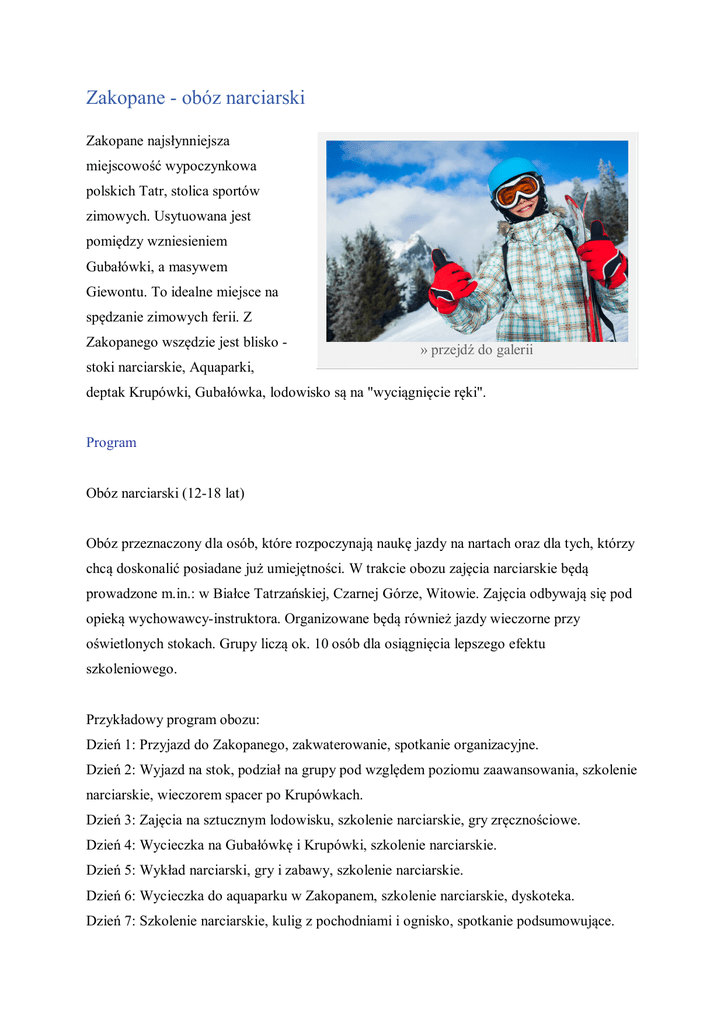 Zakopane - obóz narciarski Zakopane najsłynniejsza miejscowość wypoczynkowa polskich Tatr, stolica sportów zimowych. Usytuowana jest pomiędzy wzniesieniem Gubałówki, a masywem Giewontu. To idealne miejsce na spędzanie zimowych ferii. Z Zakopanego wszędzie jest blisko - » przejdź do galerii stoki narciarskie, Aquaparki, deptak Krupówki, Gubałówka, lodowisko są na "wyciągnięcie ręki". Program Obóz narciarski (12-18 lat) Obóz przeznaczony dla osób, które rozpoczynają naukę jazdy na nartach oraz dla tych, którzy chcą doskonalić posiadane już umiejętności. W trakcie obozu zajęcia narciarskie będą prowadzone m.in.: w Białce Tatrzańskiej, Czarnej Górze, Witowie. Zajęcia odbywają się pod opieką wychowawcy-instruktora. Organizowane będą również jazdy wieczorne przy oświetlonych stokach. Grupy liczą ok. 10 osób dla osiągnięcia lepszego efektu szkoleniowego. Przykładowy program obozu: Dzień 1: Przyjazd do Zakopanego, zakwaterowanie, spotkanie organizacyjne. Dzień 2: Wyjazd na stok, podział na grupy pod względem poziomu zaawansowania, szkolenie narciarskie, wieczorem spacer po Krupówkach. Dzień 3: Zajęcia na sztucznym lodowisku, szkolenie narciarskie, gry zręcznościowe. Dzień 4: Wycieczka na Gubałówkę i Krupówki, szkolenie narciarskie. Dzień 5: Wykład narciarski, gry i zabawy, szkolenie narciarskie. Dzień 6: Wycieczka do aquaparku w Zakopanem, szkolenie narciarskie, dyskoteka. Dzień 7: Szkolenie narciarskie, kulig z pochodniami i ognisko, spotkanie podsumowujące. Dzień 8: Po śniadaniu wyjazd. Program fakultatywny Proponujemy wzbogacenie programu obozu o: * pakiet rekreacyjny: lodowisko, wycieczka na Gubałówkę, aquapark, kulig z pochodniami i ognisko - 130 zł * zimowy paintball, gra terenowa - 30 zł * jednodniowe zajęcia narciarskie na Kasprowym Wierchu - 100 zł Zakwaterowanie Pensjonat "Za Wodą" to ośrodek o dobrym standardzie, usytuowany w dzielnicy Olcza w cichym i spokojnym miejscu. Pokoje 3, 4, 5 -osobowe z łazienkami i TV. Do dyspozycji uczestników: narciarnia, dwie sale taneczne z lustrami, sala rekreacyjna, bilard, piłkarzyki, tenis stołowy, sala kominkowa. Świadczenia Zakwaterowanie: 7 noclegów. Wyżywienie: 3 posiłki dziennie: śniadanie, obiad, kolacja lub śniadanie, prowiant na stok, obiad w porze kolacji. Pierwszy posiłek: kolacja w dniu przyjazdu, ostatní: śniadanie w dniu wyjazdu. Transport: autokar (klimatyzacja, WC). Ubezpieczenie: Signal Iduna-SKI. Opieka wychowawcy/instruktora. Realizacja programu. Informacje praktyczne W przypadku złych warunków pogodowych zajęcia programowe oraz uzupełniające mogą ulec modyfikacji. Na obóz należy zabrać kaski ochronne, które są obowiązkowe dla narciarzy poniżej 18 roku życia. Cena nie obejmuje dopłaty za transport z miast wyszczególnionych w planie podróży oraz kosztów karnetu. Cena karnetów: 10-15 lat - 365 zł, powyżej 16 lat - 425 zł.. Wypożyczenie sprzętu (narty + buty) ok. 40 zł/dzień. Terminy i ceny Nr grupy Data Zakopane - obóz narciarski (skrót: ZAKOPANE NARTY PAX FB) Cena PPOZ0114 14.01 - 21.01 1099 zł 999 zł Promocja Plan podróży Rezerwuj 8 dni PPOZ0121 21.01 - 28.01 1099 zł 999 zł Promocja Plan podróży Rezerwuj 8 dni PPOZ0128 28.01 - 04.02 1099 zł 999 zł Promocja Plan podróży Rezerwuj 8 dni PPOZ0204 04.02 - 11.02 1099 zł 999 zł Promocja Plan podróży Rezerwuj 8 dni PPOZ0211 11.02 - 18.02 1099 zł 999 zł Promocja Plan podróży Rezerwuj 8 dni PPOZ0218 18.02 - 25.02 1099 zł 999 zł Promocja Plan podróży Rezerwuj 8 dni