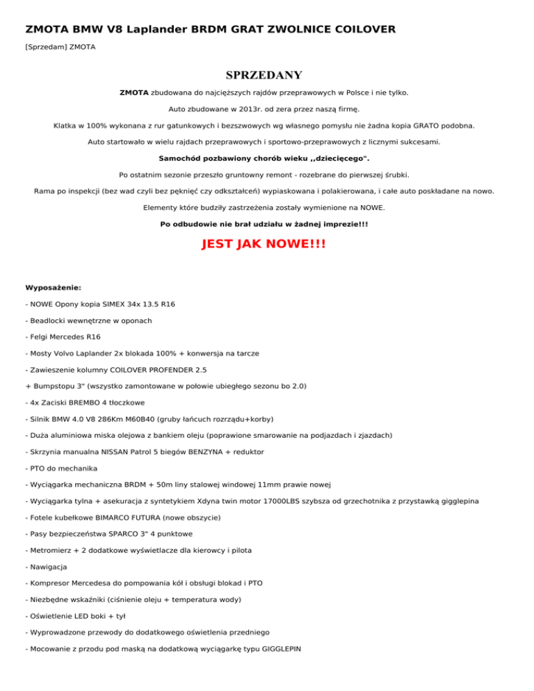 ZMOTA BMW V8 Laplander BRDM GRAT ZWOLNICE COILOVER [Sprzedam] ZMOTA SPRZEDANY ZMOTA zbudowana do najcięższych rajdów przeprawowych w Polsce i nie tylko. Auto zbudowane w 2013r. od zera przez naszą firmę. Klatka w 100% wykonana z rur gatunkowych i bezszwowych wg własnego pomysłu nie żadna kopia GRATO podobna. Auto startowało w wielu rajdach przeprawowych i sportowo-przeprawowych z licznymi sukcesami. Samochód pozbawiony chorób wieku ,,dziecięcego". Po ostatnim sezonie przeszło gruntowny remont - rozebrane do pierwszej śrubki. Rama po inspekcji (bez wad czyli bez pęknięć czy odkształceń) wypiaskowana i polakierowana, i całe auto poskładane na nowo. Elementy które budziły zastrzeżenia zostały wymienione na NOWE. Po odbudowie nie brał udziału w żadnej imprezie!!! JEST JAK NOWE!!! Wyposażenie: - NOWE Opony kopia SIMEX 34x 13.5 R16 - Beadlocki wewnętrzne w oponach - Felgi Mercedes R16 - Mosty Volvo Laplander 2x blokada 100% + konwersja na tarcze - Zawieszenie kolumny COILOVER PROFENDER 2.5 + Bumpstopu 3" (wszystko zamontowane w połowie ubiegłego sezonu bo 2.0) - 4x Zaciski BREMBO 4 tłoczkowe - Silnik BMW 4.0 V8 286Km M60B40 (gruby łańcuch rozrządu+korby) - Duża aluminiowa miska olejowa z bankiem oleju (poprawione smarowanie na podjazdach i zjazdach) - Skrzynia manualna NISSAN Patrol 5 biegów BENZYNA + reduktor - PTO do mechanika - Wyciągarka mechaniczna BRDM + 50m liny stalowej windowej 11mm prawie nowej - Wyciągarka tylna + asekuracja z syntetykiem Xdyna twin motor 17000LBS szybsza od grzechotnika z przystawką gigglepina - Fotele kubełkowe BIMARCO FUTURA (nowe obszycie) - Pasy bezpieczeństwa SPARCO 3" 4 punktowe - Metromierz + 2 dodatkowe wyświetlacze dla kierowcy i pilota - Nawigacja - Kompresor Mercedesa do pompowania kół i obsługi blokad i PTO - Niezbędne wskaźniki (ciśnienie oleju + temperatura wody) - Oświetlenie LED boki + tył - Wyprowadzone przewody do dodatkowego oświetlenia przedniego - Mocowanie z przodu pod maską na dodatkową wyciągarkę typu GIGGLEPIN - 2 nagrzewnice na kierowcy i pilota - Komputer i cała elektryka pod dachem - Akumulator żelowy Optima 75Ah - Alternator WODNY 200A - Aluminiowy zbiornik paliwa - 2 główne wyłączniki prądu (silnik + wyciągarki) Waga auta GDR - Gotowego Do Rajdu 1680KG Informacje dodatkowe Rok produkcji | Adres ogłoszenia http://ogloszenia4x4.pl/zmota-bmw-v8-laplander-brdm-grat-zwolnice-coilover,o285 Kontakt Mail: [email protected] Telefon: 600413504 Lokalizacja , Markuszów Lubelskie () Ogłoszenie dodano: 2016-03-12 01:57:45 Ogłoszenie wygasa: 2017-03-12 01:57:45 Powered by TCPDF (www.tcpdf.org)