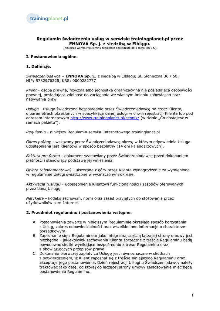 Regulamin świadczenia usług w serwisie trainingplanet.pl przez ENNOVA Sp. j. z siedzibą w Elblągu. (niniejsza wersja regulaminu regulamin obowiązuje od 1 maja 2011 r.) I. Postanowienia ogólne. 1. Definicje. Świadczeniodawca – ENNOVA Sp. j., z siedzibą w Elblągu, ul. Słoneczna 36 / 50, NIP: 5782976225, KRS: 0000282777 Klient - osoba prawna, fizyczna albo jednostka organizacyjna nie posiadająca osobowości prawnej, posiadająca zdolność do zaciągania we własnym imieniu zobowiązań oraz nabywania praw. Usługa - usługa świadczona bezpośrednio przez Świadczeniodawcę na rzecz Klienta, o parametrach określonych w specyfikacji danej usługi w chwili rejestracji Klienta lub pod adresem internetowym http://www.trainingplanet.pl/cennik/ (w dziale „Co dostajesz w ramach pakietu”). Regulamin - niniejszy Regulamin serwisu internetowego traininglanet.pl Okres próbny - wskazany przez Świadczeniodawcę okres, w którym odpowiednia Usługa udostępniana jest Klientowi w sposób bezpłatny (14 dni kalendarzowych). Faktura pro forma - dokument wystawiany przez Świadczeniodawcę przed dokonaniem płatności i stanowiący podstawę jej wniesienia. Opłata (abonamentowa) - uiszczane z góry przez Klienta wynagrodzenie za wymienione w regulaminie Usługi świadczone w wyznaczonym okresie. Aktywacja (usługi) - udostępnienie Klientowi funkcjonalności i zasobów oferowanych przez daną Usługę. Netykieta - kodeks zachowań, norm oraz zasad przyjętych do stosowania przez użytkowników sieci Internet. 2. Przedmiot regulaminu i postanowienia wstępne. A. Postanowienia zawarte w niniejszym Regulaminie określają sposób korzystania z Usług, zakres odpowiedzialności oraz wszelkie inne informacje o charakterze porządkowym. B. Zapoznanie się z Regulaminem jako integralną częścią łączącej strony umowy jest niezbędne - jakiekolwiek zachowania Klienta sprzeczne z treścią Regulaminu będą powodować skutki wynikające bezpośrednio z treści Regulaminu oraz z obowiązujących przepisów prawa. C. Dokonanie pierwszej zapłaty za Usługę jest równoznaczne w skutkach z potwierdzeniem, iż Klient zapoznał się z treścią niniejszego Regulaminu oraz akceptuje jego postanowienia. Dzień rejestracji Usługi u Świadczeniodawcy należy traktować jako datę, od której do łączącej strony umowy zastosowanie mieć będą postanowienia Regulaminu. 1 II. Rejestracja usług, zawarcie umowy, jej zmiana oraz rozwiązanie. 3. Sposób zawarcia umowy. A. O ile niniejszy Regulamin nie stanowi inaczej - rejestracja wszystkich typów Usług odbywa się przez interfejs znajdujący się w serwisie internetowym www.traininglanet.pl Świadczeniodawcy. Usługi są aktywowane na okres próbny wynoszący 14 dni kalendarzowych od daty potwierdzenia rejestracji. Jeżeli w tym czasie Świadczeniodawca uzyska potwierdzenie dokonania wpłaty, ważność Usługi przedłużana jest o długość opłaconego okresu abonamentowego. B. Klient, aktywując Usługę, oświadcza, iż nie narusza praw osób trzecich. Wszelkie spory na tym tle rozstrzygane są bez udziału Świadczeniodawcy. W razie poniesienia przez Świadczeniodawcę jakiejkolwiek szkody, Klient zobowiązuje się szkodę tę naprawić w pełnej wysokości. C. Klient zobowiązany jest do wpisania prawidłowych danych kontaktowych (adres, numer telefonu, adres e-mail, osoba kontaktowa, dane bilingowe) podczas aktywacji Usługi. Wpisanie nieprawdziwych danych i tym samym naruszenie postanowień Regulaminu upoważnia Świadczeniodawcę do zablokowania i zaprzestania kontynuacji Usługi przed upływem okresu próbnego, a także po dokonaniu opłaty abonamentowej. Jeżeli fakt wpisania nieprawdziwych danych zostanie ujawniony po okresie próbnym, w takiej sytuacji Świadczeniodawca nie będzie miał obowiązku zwracać Klientowi uiszczonej opłaty abonamentowej za okres, w którym Usługi nie będą wykonywane. D. Świadczeniodawca zastrzega sobie prawo do zablokowania dostępu do Usługi w trakcie okresu próbnego, o ile Usługa została aktywowana po raz kolejny po usunięciu wynikającym z braku wniesienia opłaty abonamentowej lub też zaprzestania świadczenia Usługi wskutek naruszenia postanowień Regulaminu i rozwiązania Umowy. E. Świadczeniodawca zobowiązuje się do wysłania Klientowi faktury pro forma w terminie do pięciu dni roboczych od aktywacji Usługi. F. Przekroczenie okresu próbnego i niedokonanie wpłaty skutkować będzie blokadą Usługi na kolejne 14 dni. Otrzymanie przez Świadczeniodawcę w tym okresie potwierdzenia wpłaty spowoduje natychmiastowe odblokowanie dostępu do Usług. Po tym terminie, wobec braku zapłaty, nastąpi usunięcie aktywowanej Usługi. G. Przekroczenie okresu abonamentowego i niedokonanie wpłaty doprowadzi do blokady Usługi na kolejne 14 dni. Otrzymanie przez Świadczeniodawcę w tym okresie potwierdzenia wpłaty spowoduje natychmiastowe odblokowanie dostępu do Usług. Po tym terminie, wobec braku zapłaty, nastąpi usunięcie aktywowanej Usługi i wygaśnięcie Umowy z upływem terminu, na jaki Umowa została zawarta. H. Świadczeniodawca nie ponosi odpowiedzialności za problemy wynikające z opóźnień zawinionych przez podmioty lub osoby trzecie (banki, poczta, dostawcy usług dostępu do Internetu itp.). 4. Ochrona danych. A. Świadczeniodawca zobowiązuje się do przestrzegania tajemnicy związanej z danymi Klienta i nieudostępniania tych danych innym podmiotom. B. O ile Klient nie zgłosi zastrzeżenia, Świadczeniodawca ma prawo do opublikowania podstawowych danych Klienta, takich, jak: nazwa firmy lub adres strony internetowej na liście referencyjnej Świadczeniodawcy. 2 5. Dokumenty księgowe. Stałość warunków. A. Z chwilą otrzymania dowodu wpłaty abonamentu za Usługę, Świadczeniodawca wystawi fakturę VAT z datą otrzymania potwierdzenia wpłaty. Klient upoważnia Świadczeniodawcę do wystawiania faktur VAT bez podpisu za Usługi świadczone przez Świadczeniodawcę o