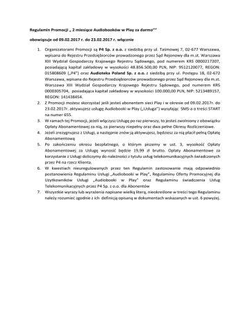 Regulamin Promocji „ 2 miesiące Audiobooków w Play za darmo”” obowiązuje od 09.02.2017 r. do 23.02.2017 r. włącznie 1. Organizatorami Promocji są P4 Sp. z o.o. z siedzibą przy ul. Taśmowej 7, 02-677 Warszawa, wpisana do Rejestru Przedsiębiorców prowadzonego przez Sąd Rejonowy dla m.st. Warszawa XIII Wydział Gospodarczy Krajowego Rejestru Sądowego, pod numerem KRS 0000217207, posiadającą kapitał zakładowy w wysokości 48.856.500,00 PLN, NIP: 9512120077, REGON: 015808609 („P4”) oraz Audioteka Poland Sp. z o.o. z siedzibą przy ul. Postępu 18, 02-672 Warszawa, wpisana do Rejestru Przedsiębiorców prowadzonego przez Sąd Rejonowy dla m.st. Warszawa XIII Wydział Gospodarczy Krajowego Rejestru Sądowego, pod numerem KRS 0000305704, posiadająca kapitał zakładowy w wysokości 100.000,00 PLN, NIP: 5213489157, REGON: 141438454. 2. Z Promocji możesz skorzystać jeśli jesteś abonentem sieci Play i w okresie od 09.02.2017r. do 23.02.2017r. aktywujesz usługę Audiobooki w Play („Usługa”) wysyłając SMS-a o treści START na numer 655. 3. W ramach tej Promocji, jeżeli włączysz Usługę po raz pierwszy, to jesteś zwolniony z obowiązku Opłaty Abonamentowej za nią, za pierwszy niepełny oraz dwa pełne Okresy Rozliczeniowe. 4. Jeżeli zrezygnujesz z Usługi, a następnie znów ją aktywujesz, będziesz za nią płacił pełną Opłatę Abonamentową 5. Po zakończeniu okresu bezpłatnego, o którym piszemy w ust. 3, wysokość Opłaty Abonamentowej za Usługę wynosić będzie 19,99 zł brutto. Opłaty Abonamentowe za korzystanie z Usługi doliczymy do należności z tytułu usług telekomunikacyjnych świadczonych przez P4 na rzecz Klienta. 6. W kwestiach nieuregulowanych przez ten Regulamin zastosowanie mają odpowiednio postanowienia Regulaminu Usługi „Audiobooki w Play”, Regulaminu Oferty Promocyjnej dla Użytkowników Usługi „Audiobooki w Play” oraz Regulaminu świadczenia Usług Telekomunikacyjnych przez P4 Sp. z o.o. dla Abonentów 7. Wszystkie wyrazy lub wyrażenia napisane wielką literą, nieokreślone w treści tego Regulaminu należy rozumieć zgodnie z ich definicją opisaną w dokumentach wskazanych w ust. 6 powyżej.