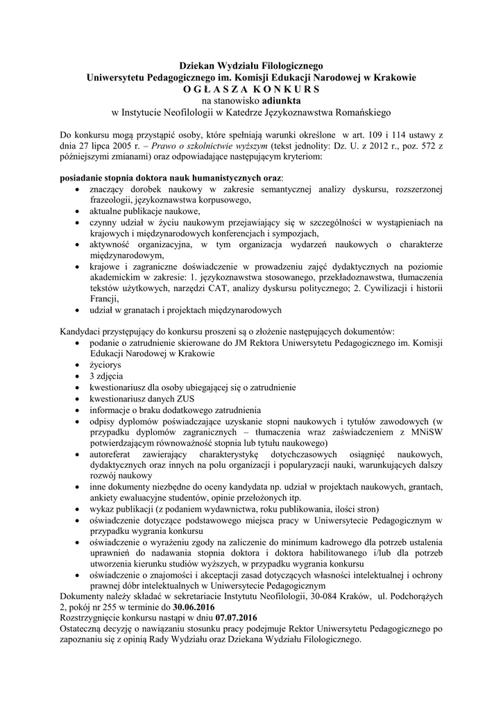 Dziekan Wydziału Filologicznego Uniwersytetu Pedagogicznego im. Komisji Edukacji Narodowej w Krakowie OGŁASZA KONKURS na stanowisko adiunkta w Instytucie Neofilologii w Katedrze Językoznawstwa Romańskiego Do konkursu mogą przystąpić osoby, które spełniają warunki określone w art. 109 i 114 ustawy z dnia 27 lipca 2005 r. – Prawo o szkolnictwie wyższym (tekst jednolity: Dz. U. z 2012 r., poz. 572 z późniejszymi zmianami) oraz odpowiadające następującym kryteriom: posiadanie stopnia doktora nauk humanistycznych oraz: znaczący dorobek naukowy w zakresie semantycznej analizy dyskursu, rozszerzonej frazeologii, językoznawstwa korpusowego, aktualne publikacje naukowe, czynny udział w życiu naukowym przejawiający się w szczególności w wystąpieniach na krajowych i międzynarodowych konferencjach i sympozjach, aktywność organizacyjna, w tym organizacja wydarzeń naukowych o charakterze międzynarodowym, krajowe i zagraniczne doświadczenie w prowadzeniu zajęć dydaktycznych na poziomie akademickim w zakresie: 1. językoznawstwa stosowanego, przekładoznawstwa, tłumaczenia tekstów użytkowych, narzędzi CAT, analizy dyskursu politycznego; 2. Cywilizacji i historii Francji, udział w granatach i projektach międzynarodowych Kandydaci przystępujący do konkursu proszeni są o złożenie następujących dokumentów: podanie o zatrudnienie skierowane do JM Rektora Uniwersytetu Pedagogicznego im. Komisji Edukacji Narodowej w Krakowie życiorys 3 zdjęcia kwestionariusz dla osoby ubiegającej się o zatrudnienie kwestionariusz danych ZUS informacje o braku dodatkowego zatrudnienia odpisy dyplomów poświadczające uzyskanie stopni naukowych i tytułów zawodowych (w przypadku dyplomów zagranicznych – tłumaczenia wraz zaświadczeniem z MNiSW potwierdzającym równoważność stopnia lub tytułu naukowego) autoreferat zawierający charakterystykę dotychczasowych osiągnięć naukowych, dydaktycznych oraz innych na polu organizacji i popularyzacji nauki, warunkujących dalszy rozwój naukowy inne dokumenty niezbędne do oceny kandydata np. udział w projektach naukowych, grantach, ankiety ewaluacyjne studentów, opinie przełożonych itp. wykaz publikacji (z podaniem wydawnictwa, roku publikowania, ilości stron) oświadczenie dotyczące podstawowego miejsca pracy w Uniwersytecie Pedagogicznym w przypadku wygrania konkursu oświadczenie o wyrażeniu zgody na zaliczenie do minimum kadrowego dla potrzeb ustalenia uprawnień do nadawania stopnia doktora i doktora habilitowanego i/lub dla potrzeb utworzenia kierunku studiów wyższych, w przypadku wygrania konkursu oświadczenie o znajomości i akceptacji zasad dotyczących własności intelektualnej i ochrony prawnej dóbr intelektualnych w Uniwersytecie Pedagogicznym Dokumenty należy składać w sekretariacie Instytutu Neofilologii, 30-084 Kraków, ul. Podchorążych 2, pokój nr 255 w terminie do 30.06.2016 Rozstrzygnięcie konkursu nastąpi w dniu 07.07.2016 Ostateczną decyzję o nawiązaniu stosunku pracy podejmuje Rektor Uniwersytetu Pedagogicznego po zapoznaniu się z opinią Rady Wydziału oraz Dziekana Wydziału Filologicznego. Uczelnia nie odsyła dokumentów konkursowych – o wynikach konkursu informowana jest tylko osoba zatrudniona. Uniwersytet Pedagogiczny nie zapewnia mieszkania Planowane zatrudnienie od dnia 1.10.2016 r. Dziekan Wydziału Filologicznego Prof. dr hab. Bogusław Skowronek