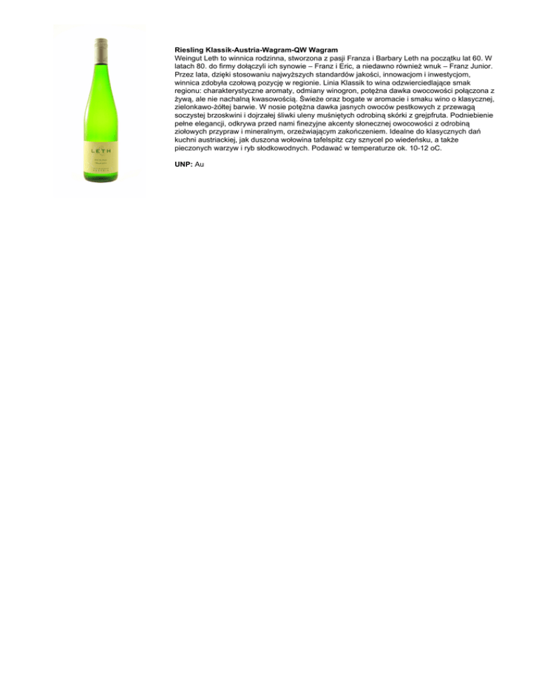 Riesling Klassik-Austria-Wagram-QW Wagram Weingut Leth to winnica rodzinna, stworzona z pasji Franza i Barbary Leth na początku lat 60. W latach 80. do firmy dołączyli ich synowie – Franz i Eric, a niedawno również wnuk – Franz Junior. Przez lata, dzięki stosowaniu najwyższych standardów jakości, innowacjom i inwestycjom, winnica zdobyła czołową pozycję w regionie. Linia Klassik to wina odzwierciedlające smak regionu: charakterystyczne aromaty, odmiany winogron, potężna dawka owocowości połączona z żywą, ale nie nachalną kwasowością. Świeże oraz bogate w aromacie i smaku wino o klasycznej, zielonkawo-żółtej barwie. W nosie potężna dawka jasnych owoców pestkowych z przewagą soczystej brzoskwini i dojrzałej śliwki uleny muśniętych odrobiną skórki z grejpfruta. Podniebienie pełne elegancji, odkrywa przed nami finezyjne akcenty słonecznej owocowości z odrobiną ziołowych przypraw i mineralnym, orzeźwiającym zakończeniem. Idealne do klasycznych dań kuchni austriackiej, jak duszona wołowina tafelspitz czy sznycel po wiedeńsku, a także pieczonych warzyw i ryb słodkowodnych. Podawać w temperaturze ok. 10-12 oC. UNP: Au