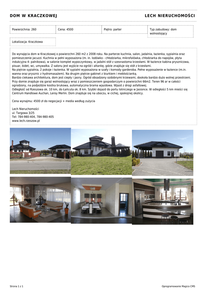 DOM W KRACZKOWEJ Powierzchnia: 260 LECH NIERUCHOMOŚCI Cena: 4500 Piętro: parter Typ zabudowy: dom wolnostojący Lokalizacja: Kraczkowa Do wynajęcia dom w Kraczkowej o powierzchni 260 m2 z 2008 roku. Na parterze kuchnia, salon, jadalnia, łazienka, sypialnia oraz pomieszczenie jacuzzi. Kuchnia w pełni wyposażona (m. in. lodówko - chłodziarka, mikrofalówka, chłodziarka do napojów, płyta indukcyjna 4- palnikowa), w salonie komplet wypoczynkowy, w jadalni stół z szesnastoma krzesłami. W łazience kabina prysznicowa, pisuar, bidet, wc, umywalka. Z salonu jest wyjście na ogród i altankę, gdzie znajduje się stół z krzesłami. Na piętrze sypialnia, 2 pokoje i łazienka. W sypialni wyposażona w szafy i komody garderoba. Pełne wyposażenie w łazience (m.in. wanna oraz prysznic z hydromasażem). Na drugim piętrze gabinet z biurkiem i meblościanką. Bardzo ciekawa architektura, dom jest ciepły i jasny. Ogród obsadzony ozdobnymi krzewami, dookoła bardzo dużo wolnej przestrzeni. Przy domie znajduje się garaż wolnostojący wraz z pomieszczeniem gospodarczym o powierzchni 66m2. Teren 96 ar w całości ogrodzony, na podjeździe kostka brukowa, automatyczna brama wjazdowa. Wjazd z drogi asfaltowej. Odległość od Rzeszowa ok. 10 km, do Łańcuta ok. 8 km. Szybki dojazd do portu lotniczego w Jasionce. W odległości 5 km mieści się Centrum Handlowe Auchan, Leroy Merlin. Dom znajduje się na uboczu, w cichej, spokojnej okolicy. Cena wynajmu: 4500 zł do negocjacji + media według zużycia Lech Nieruchomości ul. Targowa 3/25 Tel: 784-980-404, 784-980-405 www.lech.rzeszow.pl Strona 1 z 1 Oprogramowanie Magico CMS