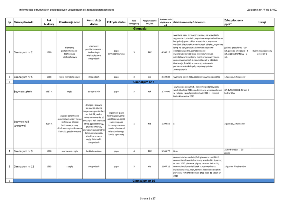 Informacdje o budynkach podlegających ubezpieczeniu i zabezpieczeniach ppoż l.p Nazwa placówki Rok budowy Konstrukcja ścian Konstrukcja dachu Pokrycie dachu Załącznik nr 7F do SIWZ Ilość kondygnacji Podpiwniczenie TAK/NIE Powierzchnia użytkowa w Ostatnie renmonty (5 lat wstecz) m2 Zabezpieczenia ppoż* Uwagi Gimnazja 1 Gimnazjum nr 2 1980 elementy prefabrykowane technologia wielkopłytowa 2 Gimnazjum nr 5 1968 bloki zwirobetonowe elementy prefabrykowane technologia wielkopłytowa, stropodach papa termozgrzewalna 3 TAK 4 200,17 wymiana papy termozgrzewalnej na wszystkich segmentach placówki, wymiana wszystkich okien w budynku (oprócz okien w szatniach, wymiana obróbek blacharskich na dachach obiektu, wymiana lamp na korytarzach szkolnych na oprawy energooszczędne, zainstalowanie światłowodowego łącza internewtowego, zainstalowanie systemu monitoringu wizyjnego, remont wszystkich łazienek i toalet w obiekcie (instalacje, kafelki, armatura), malowanie pomieszczeń szkolnych, naprawy tynków zewnętrznych stropodach papa 3 nie 3 322,80 wymiana okien-2012,częściowa wymiana podłóg Budynek szkoły Budynek hali sportowej 5 6 12 gaśnic, 6 hyrantów Gimnazjum nr 7 3 4 gaśnica proszkowa - 19 szt, gaśnica śniegowa - 2 szt, wąż hydrantowy - 6 szt, Gimnazjum nr 9 Gimnazjum nr 12 1957 r. 2014 r. 1918 1965 cegła stropo-dach papa dźwigar z drewna klejonego,blacha trapezowa,paraizolacj część hali -papa a z folii PE, wełna pustaki ceramiczne termozgrzewalna i mineralna twarda 20 szczelinowe,ściany nośne podkładowa,część cm,częsci hali zapleczei osłonowe bloczki zaplecza papa strop gęstożebrowy, betonowe,sciany termozgrzewalna płyty korytkowe, działowe cegła dziurawka nawierzchniowa i styropian jednokrotnie i bloczki gazobetonowe wierzchniowego laminowany papą, krycia z posypką ścianki ażurowe z cegły dziurawki, stropodach murowane cegła z cegły belki drewniane stropodach papa papa 3 tak 2 744,00 -wymiana okien 2014, -założenie podgrzewaczy wody i bojlera 2014, modernizacja wymiennikowni GP-4xABCX6004 -12 szt. 6 w związku z przyłączeniem hali 2014 r. - remont hydrantów łazienki uczniów 2013 1 NIE 1 394,50 x 3 gaśnice, 2 hydranty 4 TAK 5 945,77 Brak 21 hydrantów , 35 gaśnic 2 967,22 remont dachu na dużej Sali gimnastycznej 2012, remont i malowanie korytarzy w roku 2011-parter, w roku 2012 pierwsze piętro, remont Sali nr 18, remont i malowanie klatek schodowych oraz 14 gaśnic 7 hydrantów świetlicy w roku 2014, remont łazienek na niskim parterze, remont biblioteki oraz zejść do szatni w 2015 3 nie Gimnazjum nr 16 Strona 1 z 27 Budynek zarządzany przez SP 2 Informacdje o budynkach podlegających ubezpieczeniu i zabezpieczeniach ppoż l.p Nazwa placówki Budynek szkoły Budynek gospodarczy Rok budowy Powierzchnia użytkowa w Ostatnie renmonty (5 lat wstecz) m2 Konstrukcja ścian Konstrukcja dachu Pokrycie dachu Ilość kondygnacji Podpiwniczenie TAK/NIE 1959 murowana stropodach wentylowany i nad salą gimnastyczną stropodach pełny styropapa i papa 3 Tak 3199.90 x murowana drewniana papa 1 Nie 107,29 termomodernizacja 2010 rok wymiana c.o ocieplenie budynku,wymiana okien Zabezpieczenia ppoż* Budynek szkoły 1962 r. Ściany murowane: cegła kratówka, pustak gazobeton stropodach papa 3 NIE 1 967,85 Sala gimnastyczna 1964 r. Ściany murowane: cegła kratówka, pustak gazobeton stropodach papa 1 NIE 206,50 wartość 95.000,00 4 szt. gaśnic proszkowych; 1 szt. gaśnica śniegowa; 2011 r. - wymiana pokrycia dachu; 2012 r. - remont ilość hydrantów 3, brak elewacji ściany głównej. systemu tryskaczy i automatycznej sygnalizacji pożaru 2014r. - ocieplenie i elewacja jednej ściany 1 szt. gaśnica proszkowa; ilość hydrantów 1, Gimnazjum nr 18 8 Pawilon C 1990 cegła żerańska prefabrykowane płyty dachowe system W70 uzupełnione płytkami papa termozgrzewalna 3 tak 1 731,90 2009- adaptacja tolety szkolnej na toaletę dla uczniów niepełnosprawnych ,remont instalacji odgromowej. 2010-wymiana okien w paw.C i D. 2011-wykonanie chodnika, schodów i wymiana gaśnice -9 szt , hydranty drzwi wejściowych do szkoły.2013 - naprawa wewnętrzne - 3 szt, kominów na paw.C i D, wymiana okien w toaletach uczniowskich, modernizacja monitoringu szkolnego.2015-remont dachu w paw.C Pawilon D 1992 cegła żerańska prefabrykowane płyty dachowe system W70 uzupełnione płytkami papa termozgrzewalna 3 tak 1 735,00 2014 -remont toalet w pawilonie D, parter Łącznik 1992 cegła żerańska prefabrykowane płyty dachowe system W70 uzupełnione płytkami papa termozgrzewalna 1 tak 274,00 Gimnazjum nr 22 1984 ściany prefabrykowane stropodach papa 3 tak Strona 2 z 27 3 039,44 Uwagi 15 szt. gaśnic, 3-hydranty Gimnazjum nr 17 7 9 Załącznik nr 7F do SIWZ gaśnice - 11 szt, hydranty wewnętrzne - 3 szt , gaśnica - 1 szt , a 2015-remont łazienki uczniowskiej(chłopców) seg.A II p. wymiana instalacji, armatury, naprawy tynkarskie, położenie glazury i terakoty, wymiana drzwi wraz z ościeżnicami (2 szt., ościeżnice malowane) 2014-remont łazienki uczniowskiej(dziewcząt) seg.A II p., 2012 r.-wymiana stolarki okiennej 2012 r.-wymiana drzwi 18 gaśnic, 4 hydranty wejściowych do budynku .2015-remont łazienki uczniowskiej(chłopców) seg.A II p. wymiana instalacji, armatury, naprawy tynkarskie, położenie glazury i terakoty, wymiana drzwi wraz z ościeżnicami (2 szt., ościeżnice malowane) 2014remont łazienki uczniowskiej(dziewcząt) seg.A II p. Informacdje o budynkach podlegających ubezpieczeniu i zabezpieczeniach ppoż l.p Nazwa placówki Rok budowy Konstrukcja ścian Konstrukcja dachu Załącznik nr 7F do SIWZ Pokrycie dachu Ilość kondygnacji Podpiwniczenie TAK/NIE Powierzchnia użytkowa w Ostatnie renmonty (5 lat wstecz) m2 Zabezpieczenia ppoż* Uwagi Przedszkola Miejskie Miejskie Przedszkole 10 Nr 4 Miejskie Przedszkole 11 nr 5 12 Miejskie Przedszkole Nr 6 1959 pustak stropodach papa 2 Tak 498,00 wymiana stolarki, okiennej/kuchnia, remont dachu